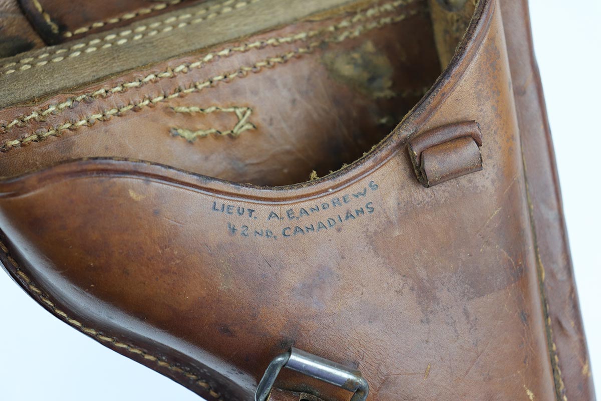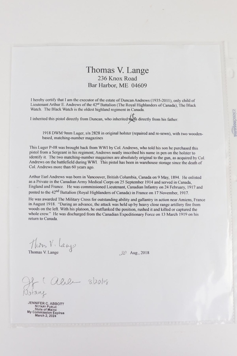 5/29/19 – This is a complete DWM Luger rig, made in 1918 and including two matching magazines, 1917 dated holster and blank tool. The pistol comes with notarized letter attributing it to Col. Arthur Andrews of the 42nd battalion, the Royal Highlanders of Canada, also known as the Black Watch. He was awarded the Military Cross for outstanding ability and gallantry in action near Amiens, France in August of 1918.