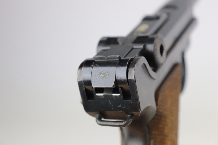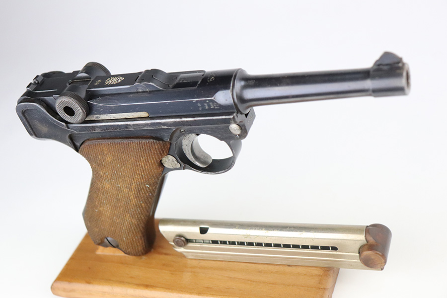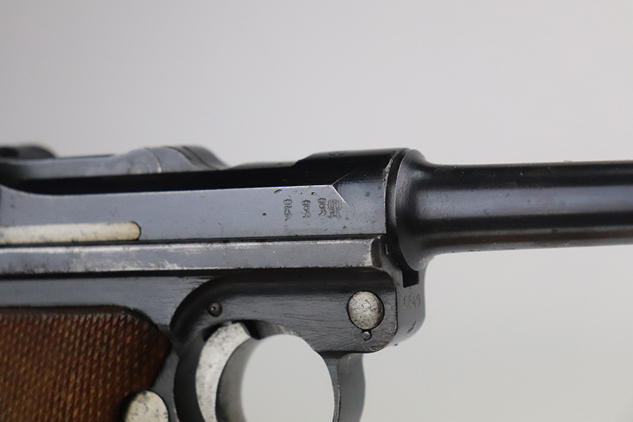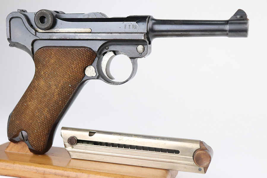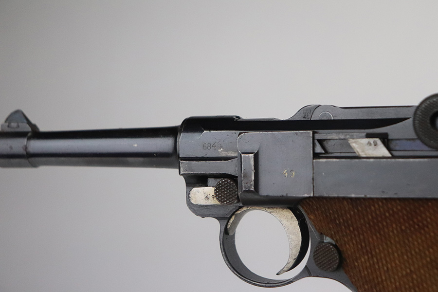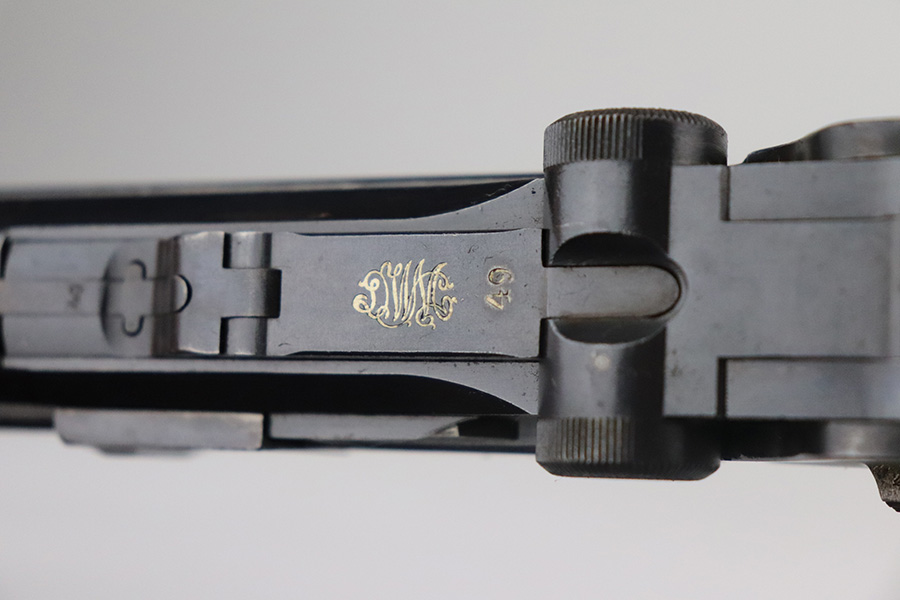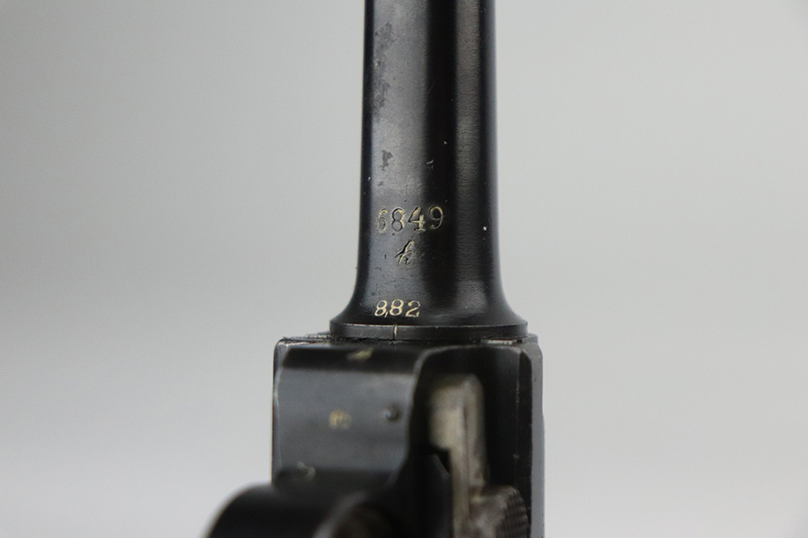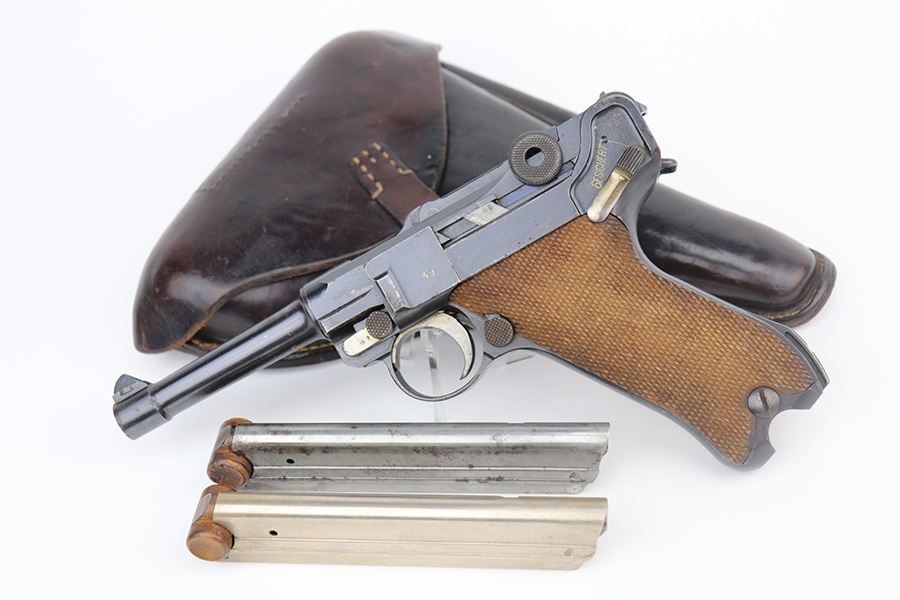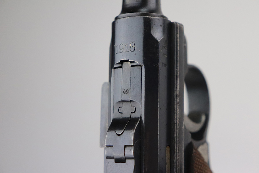 6/29/21 – This is a very nice example of a DWM Luger rig issued to the Imperial German Army in 1918. The gun is all matching and has the proper Imperial proofs. It comes with an excellent 1915-dated holster and two matching magazines. The gun has retained about 93% of its original finish. There is minor, somewhat scratchy wear on the high edges of the slide in general, on the side plate, and on the side rails. There is splotchy and scratchy wear on both straps. Tiny dots of oxidation here and there, concentrated around the high edges and on the straps. Comes with excellent un-numbered grips. The bore is shiny with strong rifling and the tiniest bit of freckling here and there.