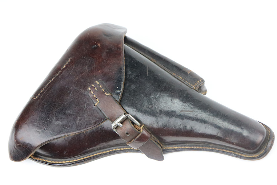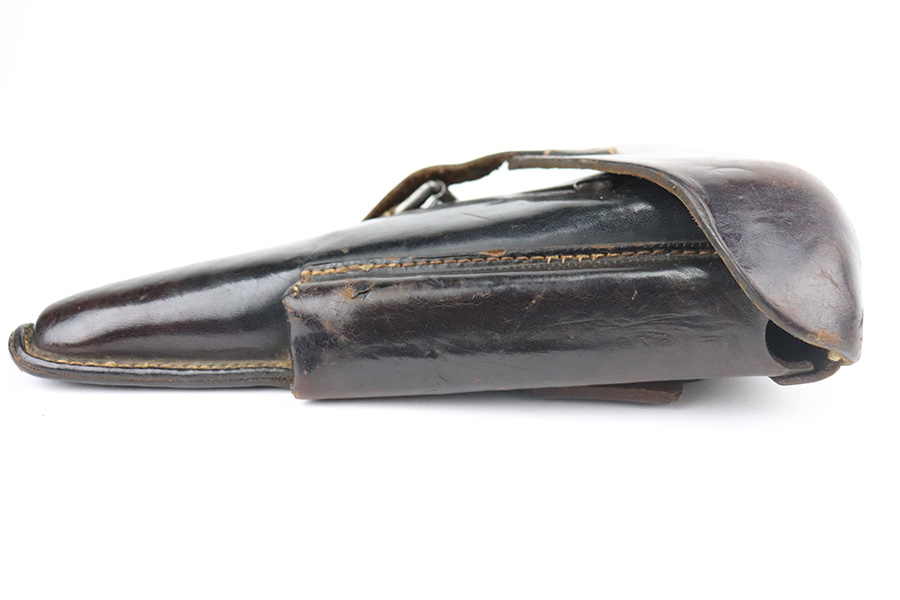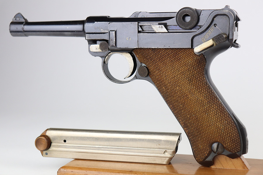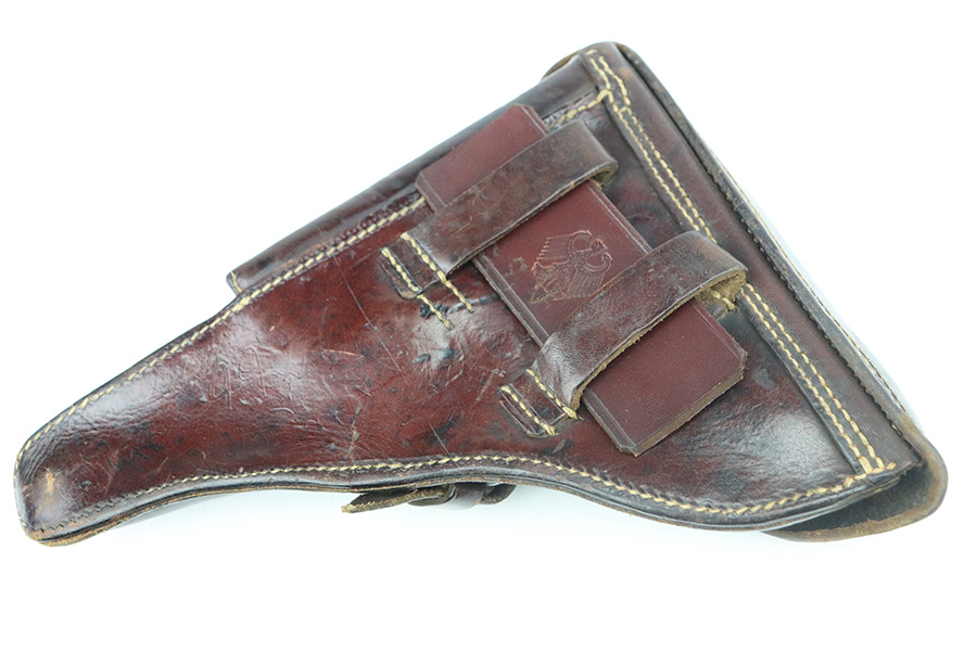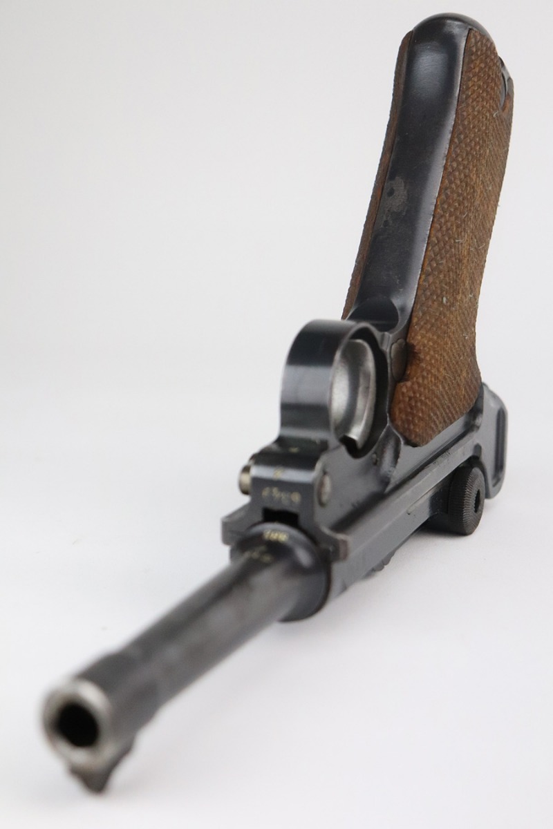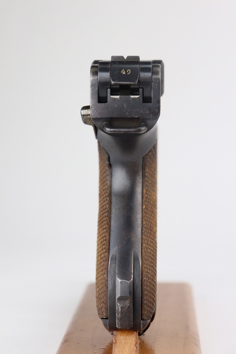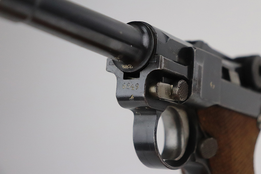 6/29/21 – This is a very nice example of a DWM Luger rig issued to the Imperial German Army in 1918. The gun is all matching and has the proper Imperial proofs. It comes with an excellent 1915-dated holster and two matching magazines. The gun has retained about 93% of its original finish. There is minor, somewhat scratchy wear on the high edges of the slide in general, on the side plate, and on the side rails. There is splotchy and scratchy wear on both straps. Tiny dots of oxidation here and there, concentrated around the high edges and on the straps. Comes with excellent un-numbered grips. The bore is shiny with strong rifling and the tiniest bit of freckling here and there.