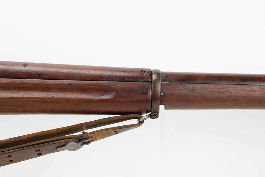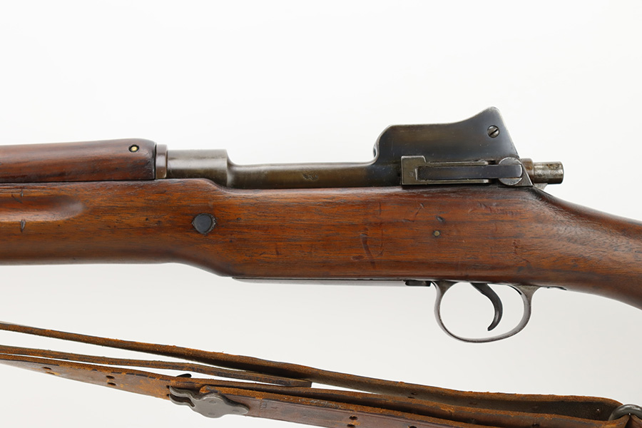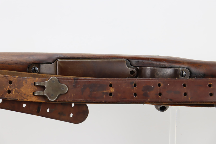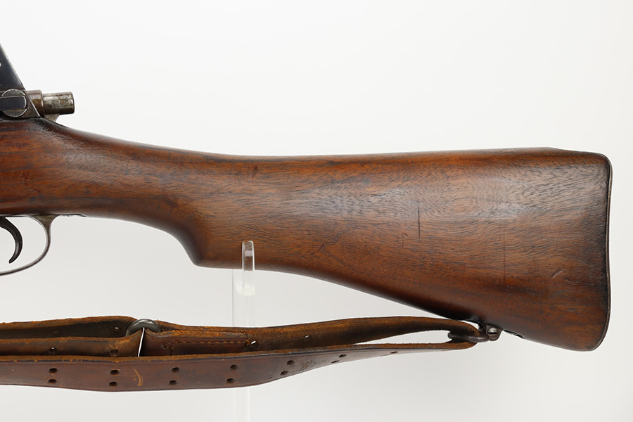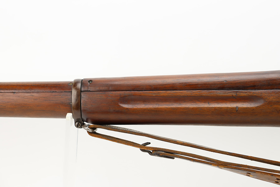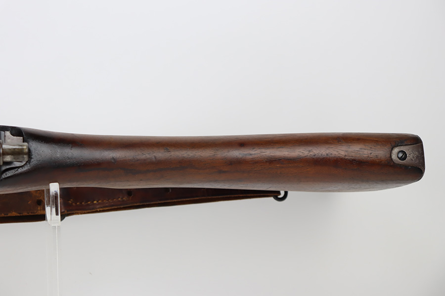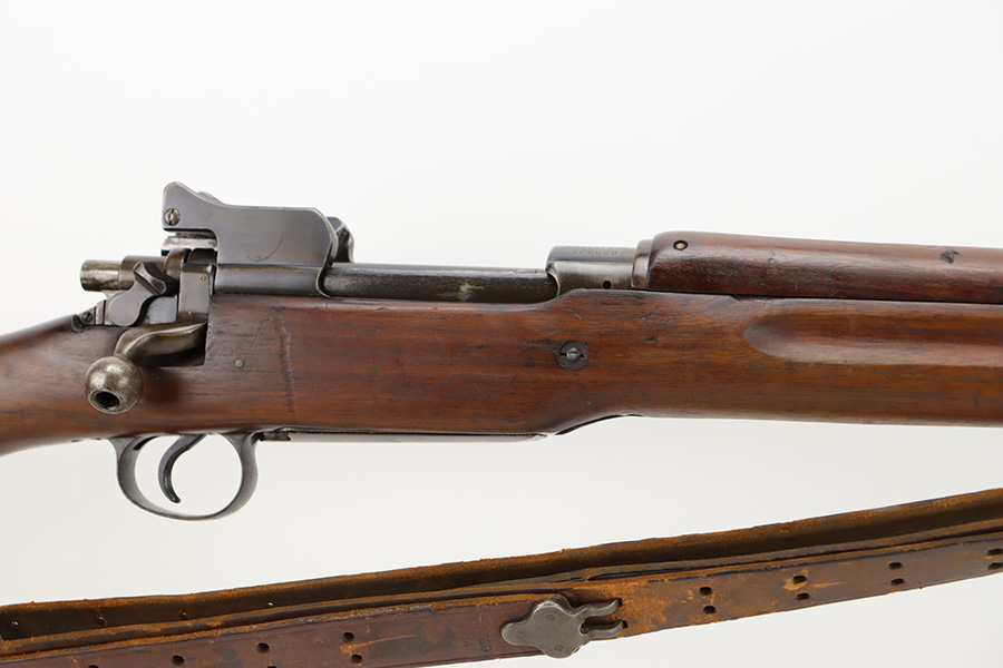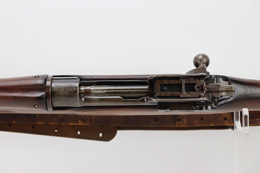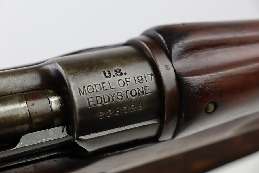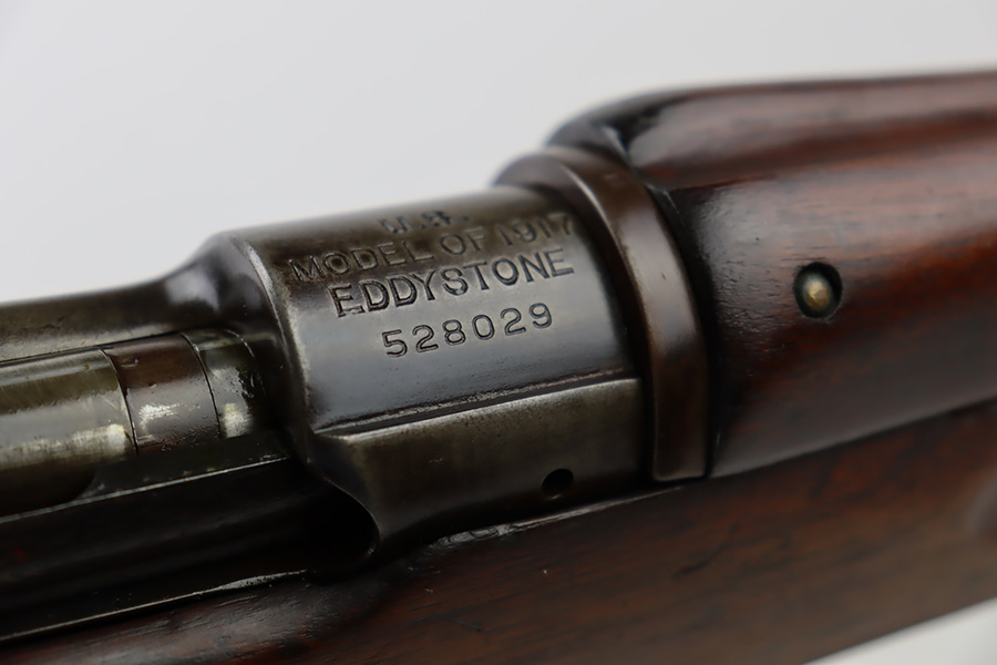 10/6/23 – This is a nice example of an Eddystone Model 1917 rifle issued to the US military in 1918. It has the proper military acceptance proofs throughout. Eddystone barrel dated 4-18. All Eddystone parts except for the bolt, which is Winchester. The finish rates roughly 50% with obvious thinning and light brown patina throughout. Spotty oxidation on the butt plate. Excellent wood furniture. The bore has good rifling, but there are some areas of pin-pricking and surface oxidation here and there. Comes with a 1944-dated leather sling.
