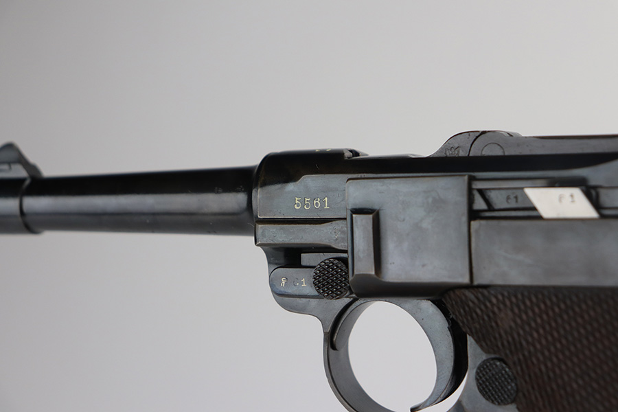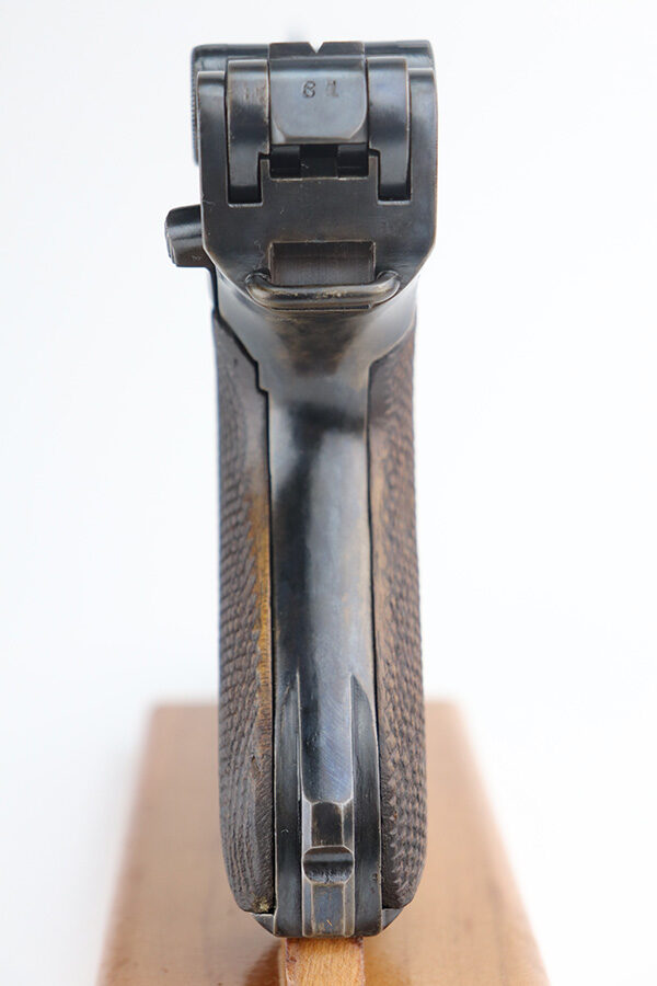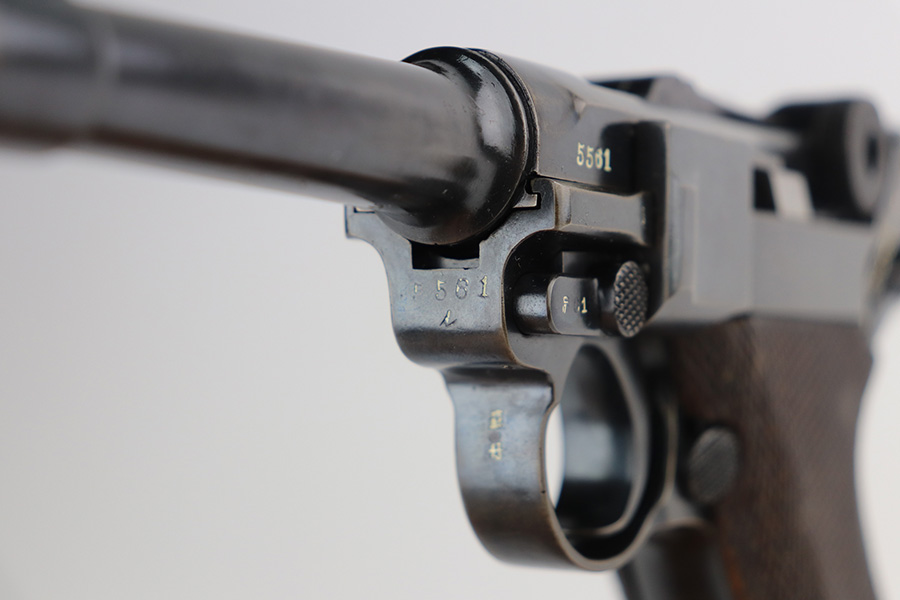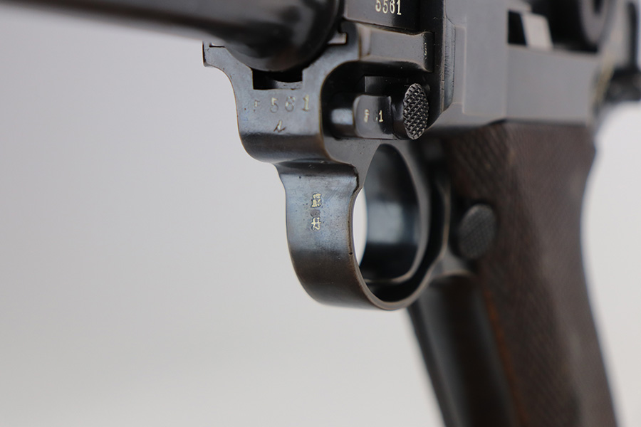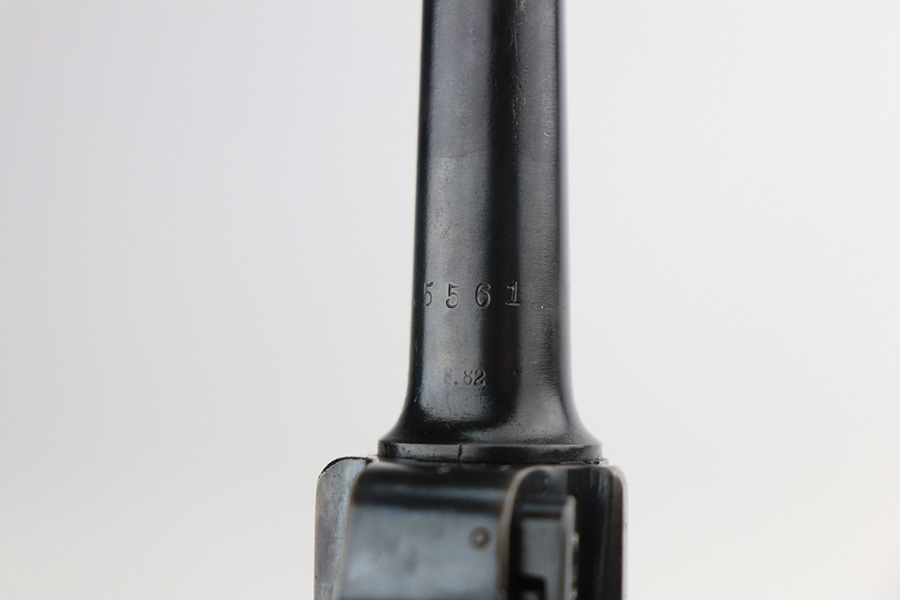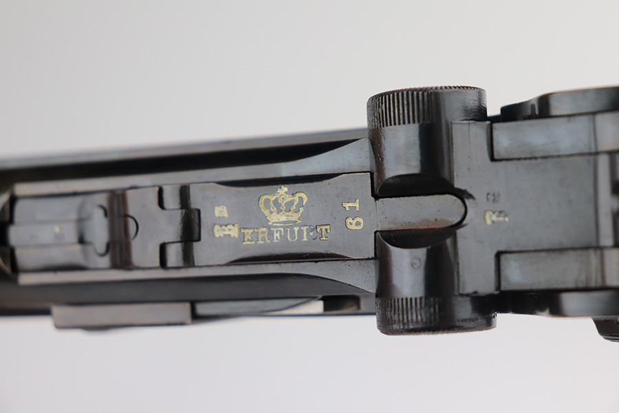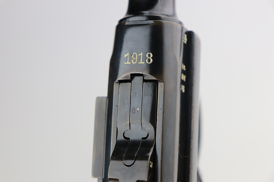 6/15/21 – This is a nice example of an Erfurt Luger issued to the Imperial German Army in 1918. The gun is all matching, except the side plate, and has the proper Imperial military proofs and Erfurt proofs throughout. We believe the gun has been re-blued and has retained about 98% of this finish. There are areas of splotchy discoloration throughout and some minor wear on the back strap. Comes with original matching grips and a period-correct mismatched magazine. The rifling in the bore is a little worn, and there is minor pitting throughout.
