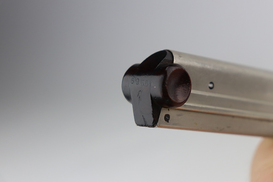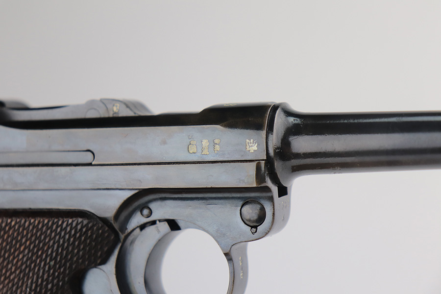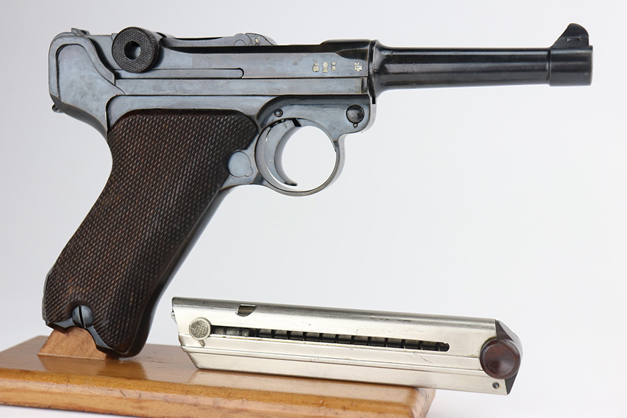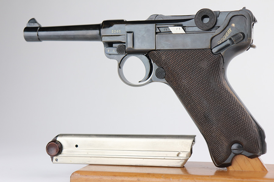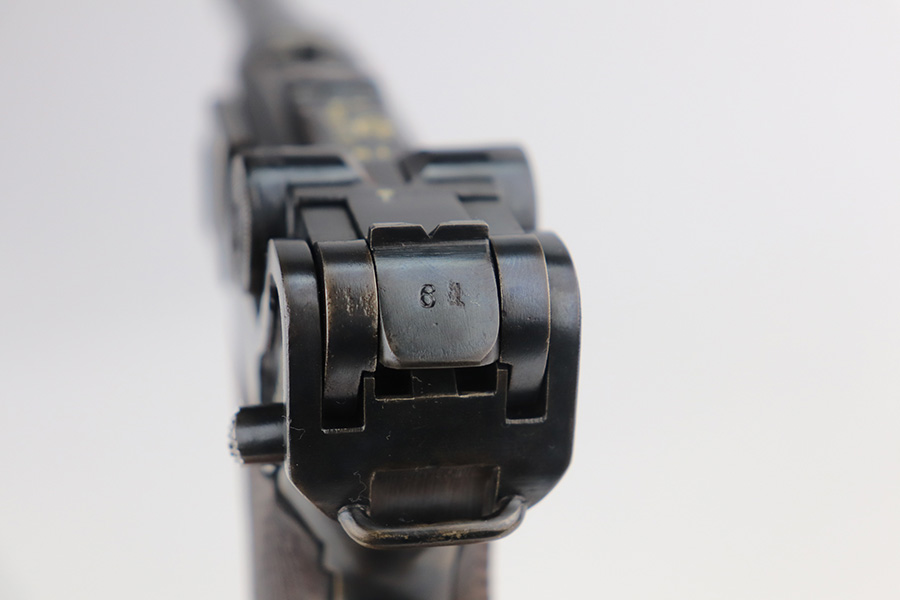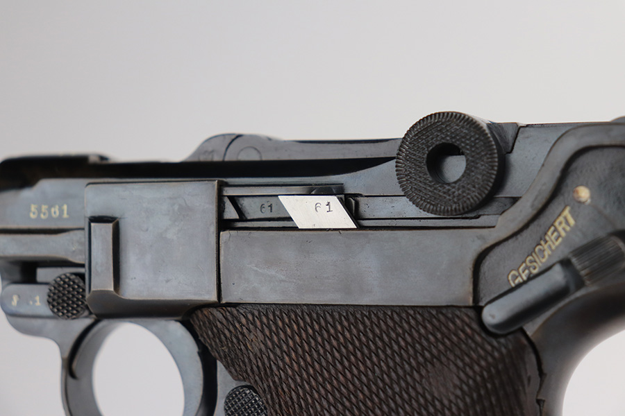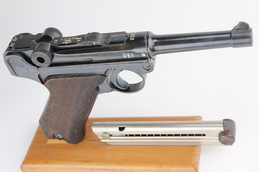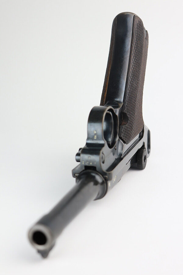6/15/21 – This is a nice example of an Erfurt Luger issued to the Imperial German Army in 1918. The gun is all matching, except the side plate, and has the proper Imperial military proofs and Erfurt proofs throughout. We believe the gun has been re-blued and has retained about 98% of this finish. There are areas of splotchy discoloration throughout and some minor wear on the back strap. Comes with original matching grips and a period-correct mismatched magazine. The rifling in the bore is a little worn, and there is minor pitting throughout.
