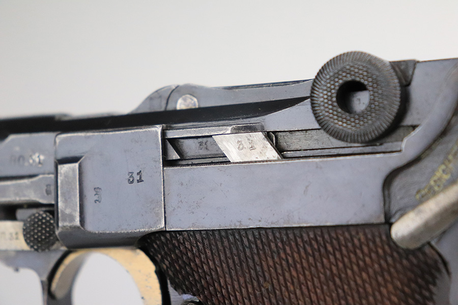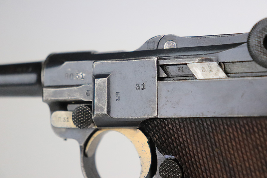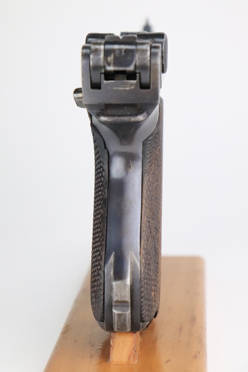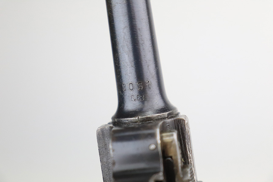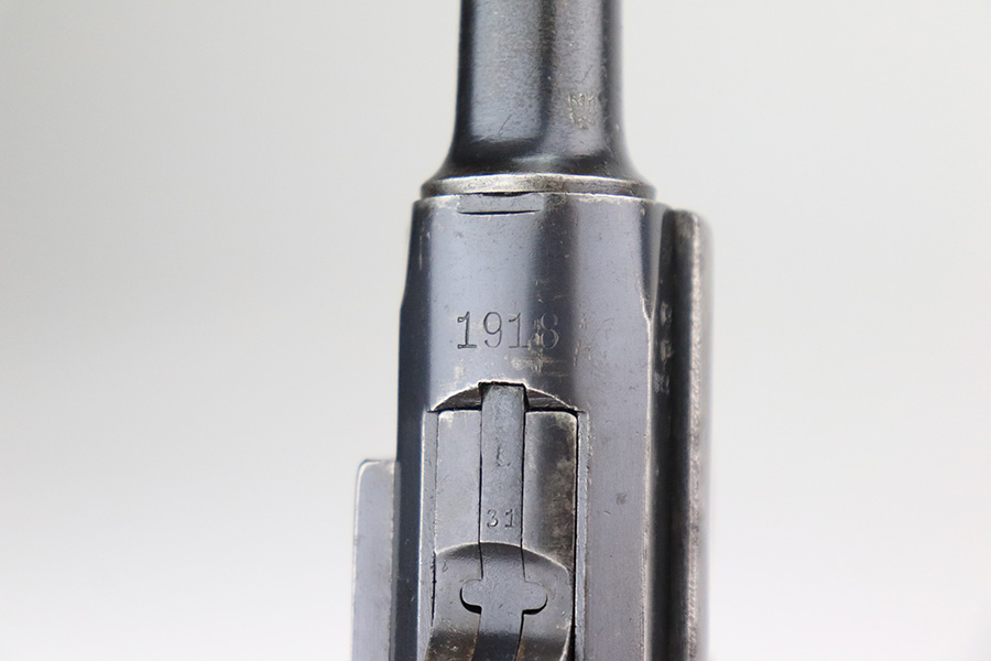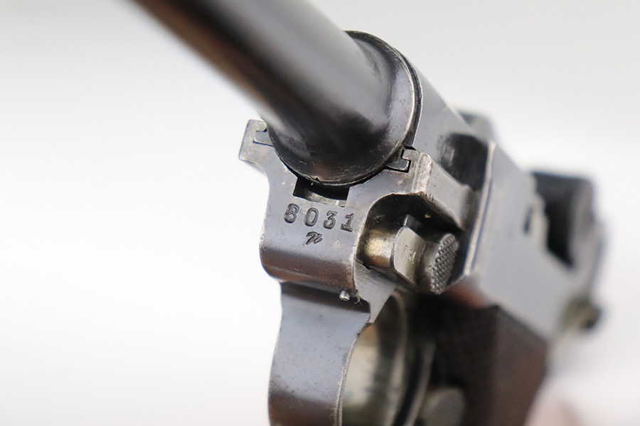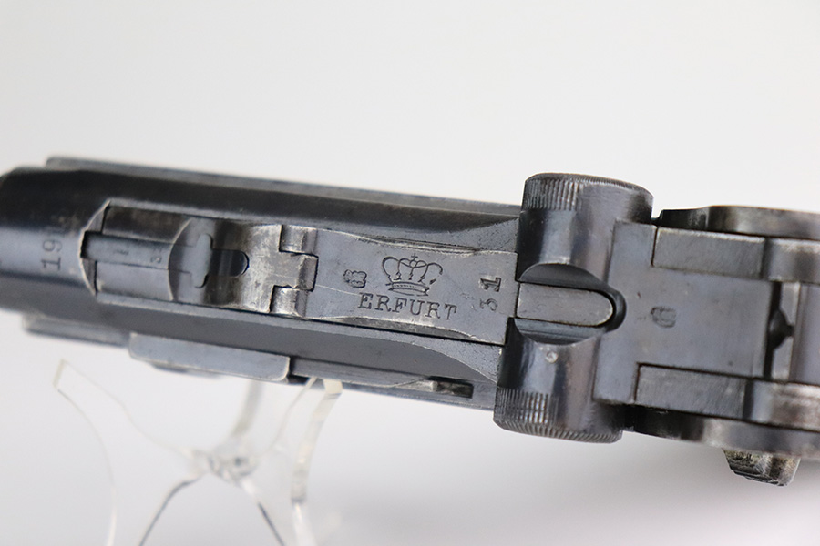 6/23/22 – This is a nice example of an Erfurt Luger issued to the Imperial German military in 1918. It is all matching and has the proper Imperial and Erfurt proofs throughout. It has retained somewhere between 85-90% of its original finish. Areas of wear on the front strap, side plate, side rails, on the chamber, on the toggle, around the muzzle and along the right side of the barrel. Areas of spotty oxidation and brown patina throughout. Some areas with tiny pits here and there. Comes with nice period-correct matching-numbered grips and a mismatched wood-bottom magazine. The rifling in the bore is fairly worn with spotty oxidation throughout.