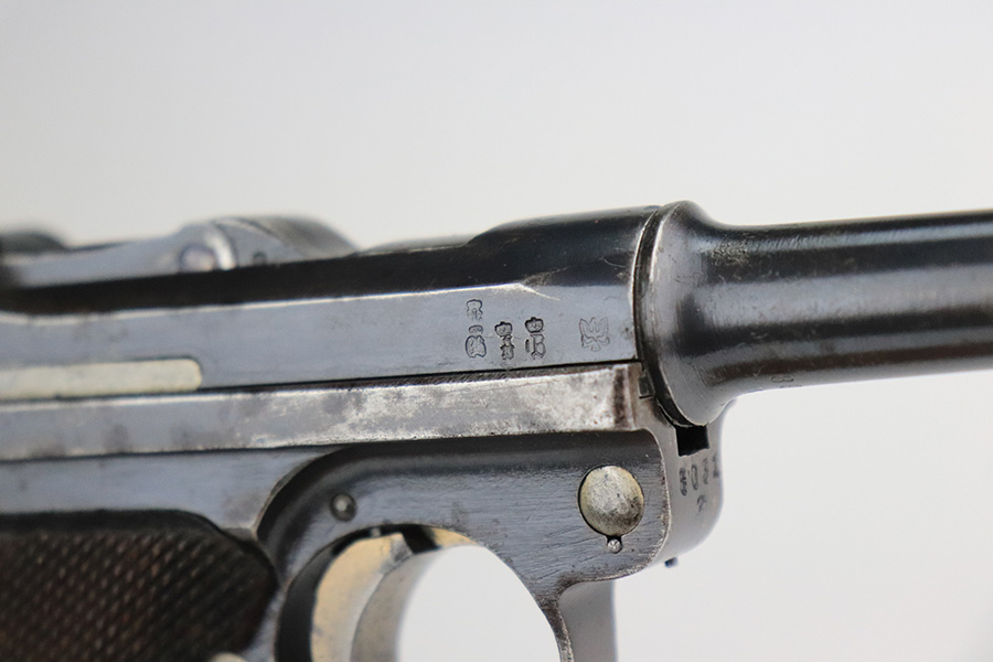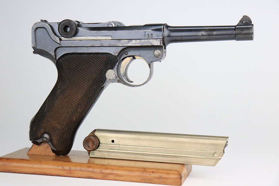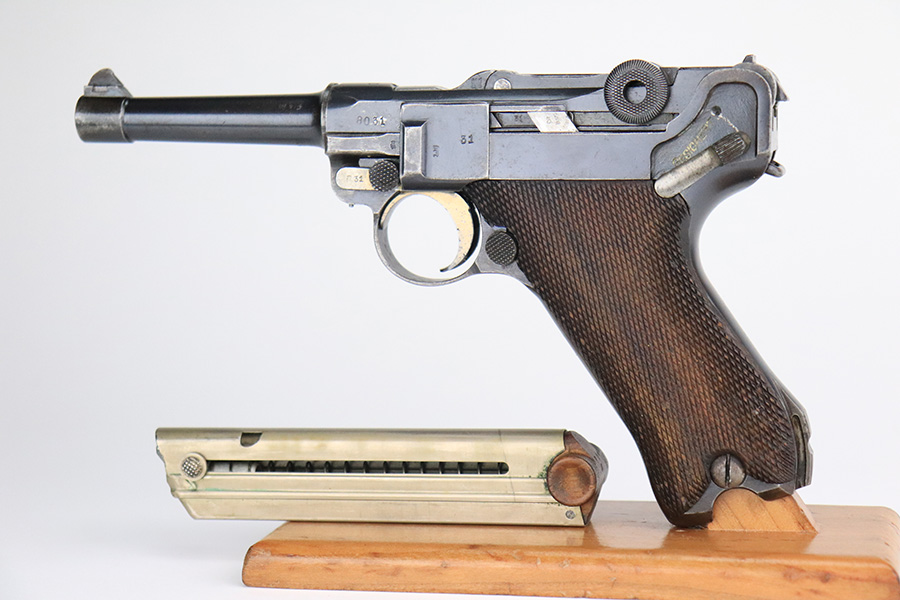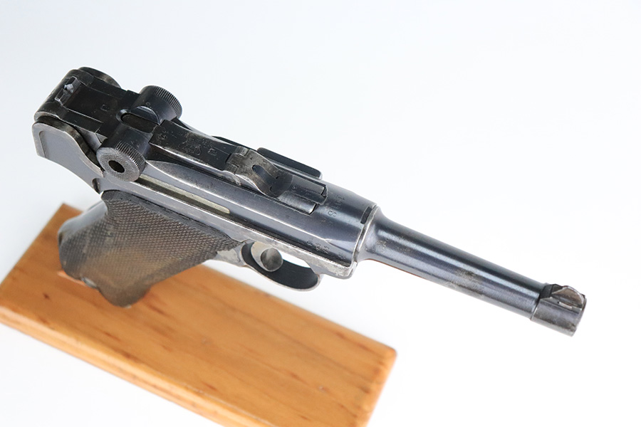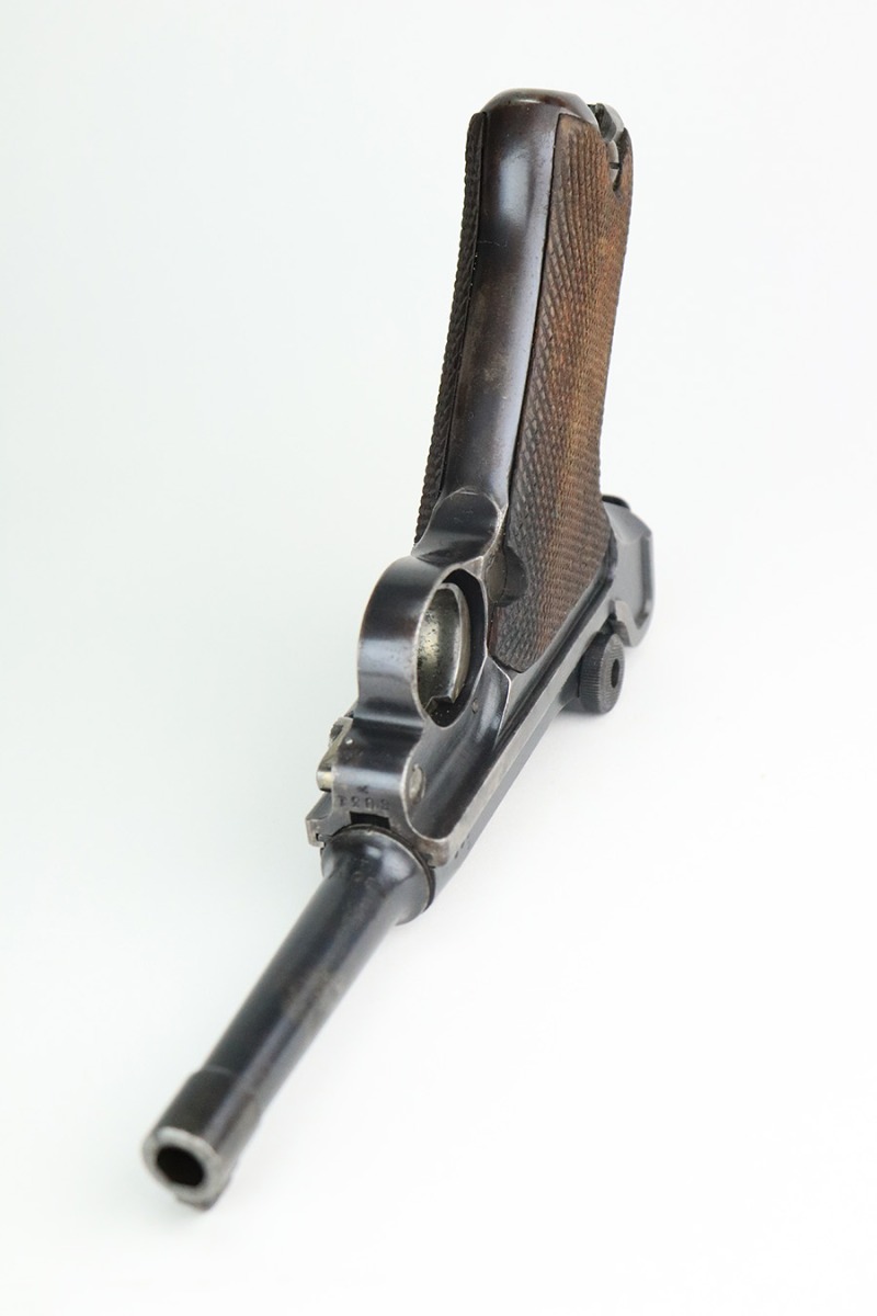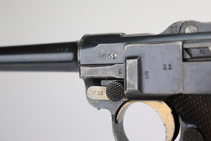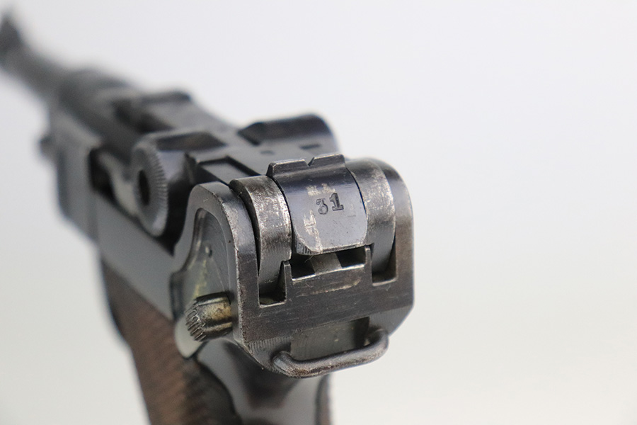 6/23/22 – This is a nice example of an Erfurt Luger issued to the Imperial German military in 1918. It is all matching and has the proper Imperial and Erfurt proofs throughout. It has retained somewhere between 85-90% of its original finish. Areas of wear on the front strap, side plate, side rails, on the chamber, on the toggle, around the muzzle and along the right side of the barrel. Areas of spotty oxidation and brown patina throughout. Some areas with tiny pits here and there. Comes with nice period-correct matching-numbered grips and a mismatched wood-bottom magazine. The rifling in the bore is fairly worn with spotty oxidation throughout.
