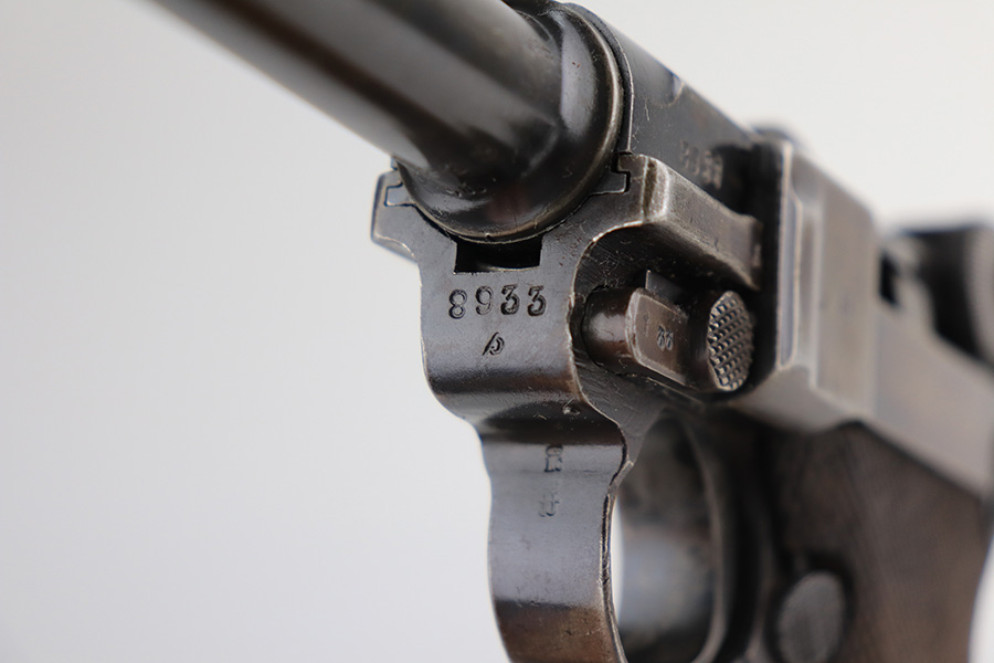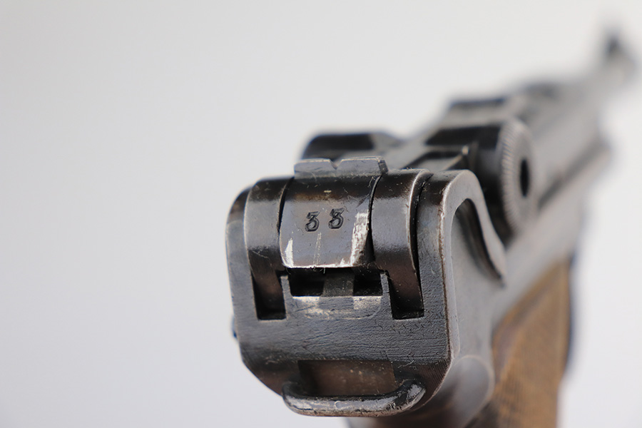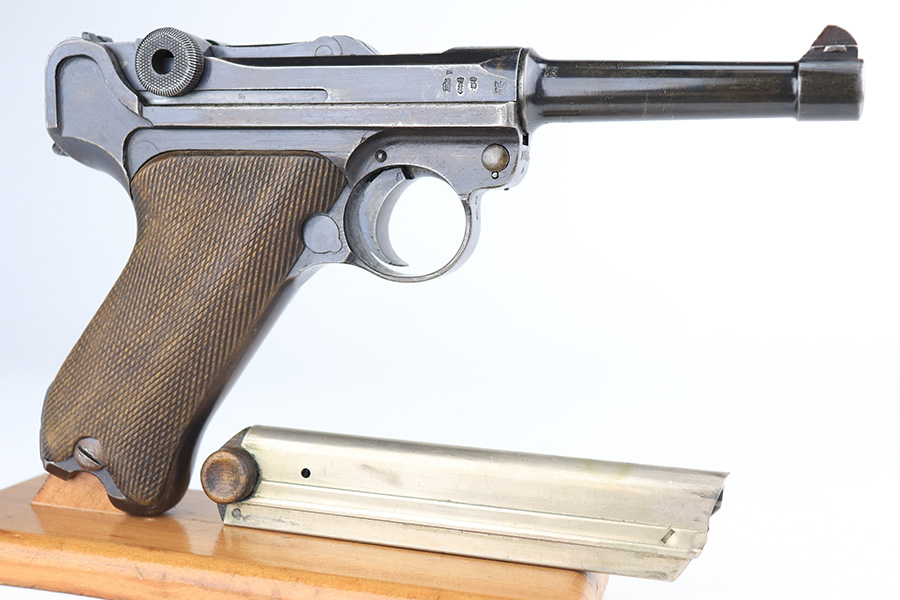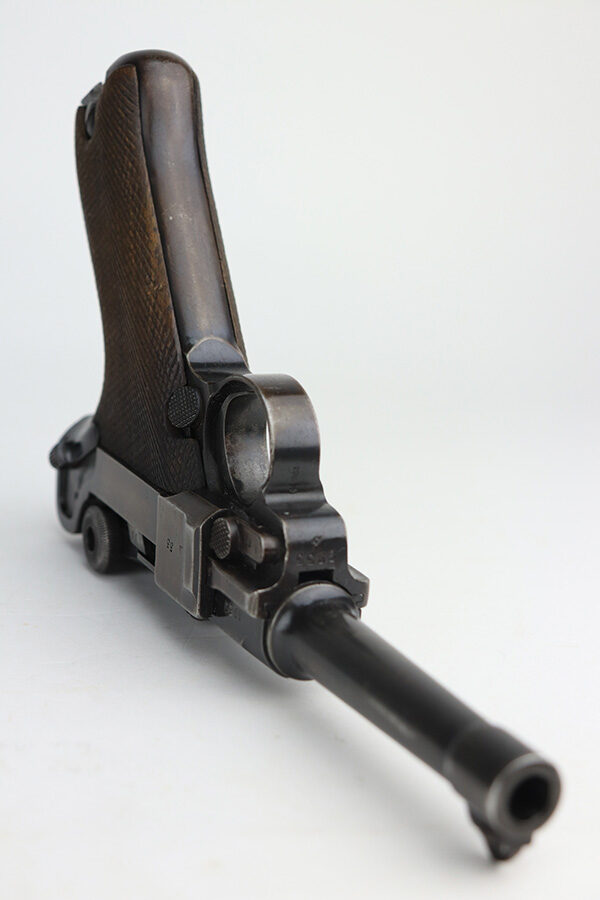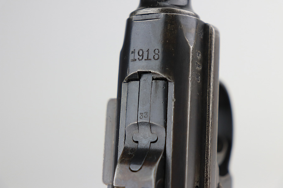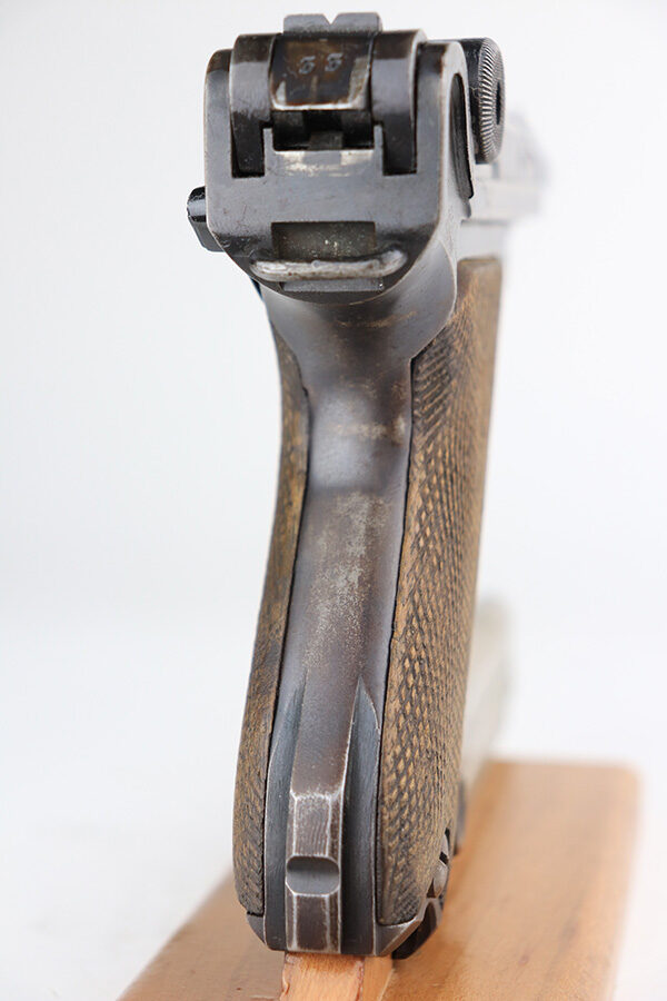 1/3/22 – This is a nice example of an Erfurt Luger issued to the Imperial German military in 1918. It is all matching, has the proper Erfurt proofs throughout, and has Imperial German military proofs on the right side of the slide. This one also comes with one original matching-numbered magazine. There is one chip and a few dings on the magazine bottom. It has retained roughly 75-80% of its original finish. There is spotty wear and brown patina on both grip straps, both sides of the frame, and on the side plate. Spotty wear on the barrel and minor wear around the muzzle. A couple areas of minor pin-pricking on the side plate. Comes with slightly worn matching-numbered wood grips. The bore has good rifling with some areas of very minor freckling here and there.