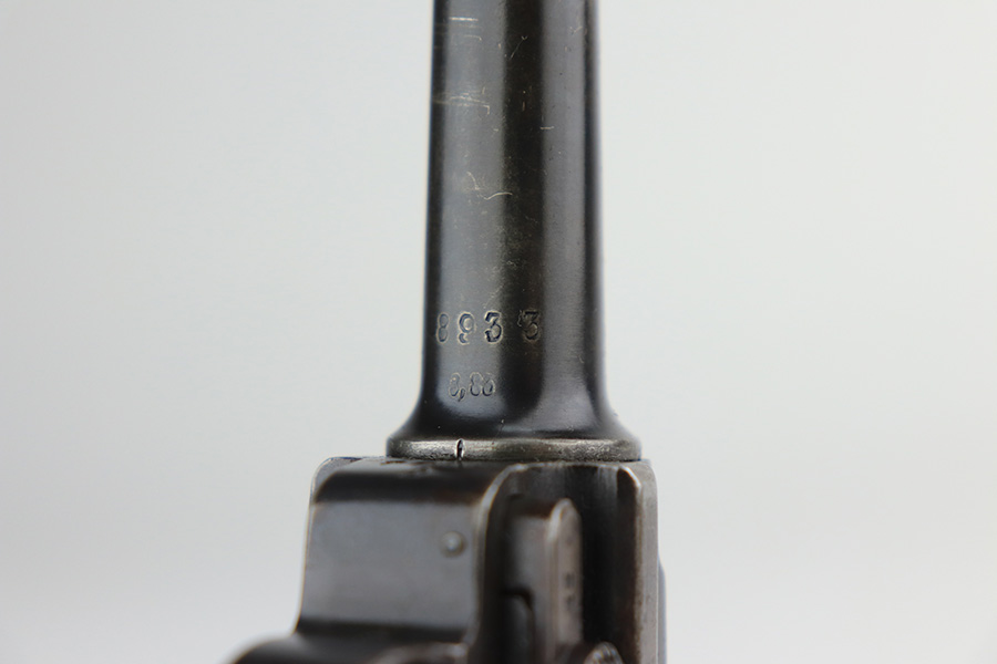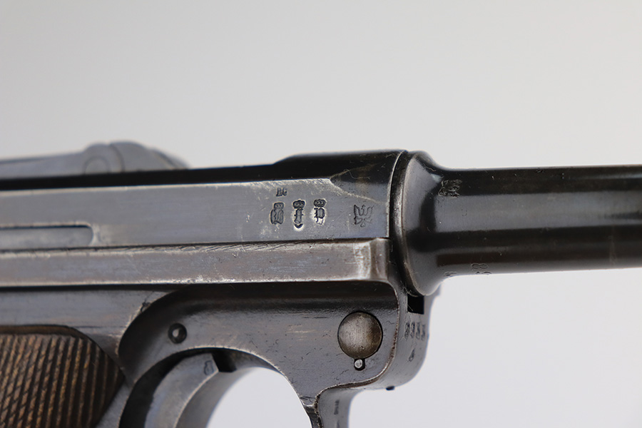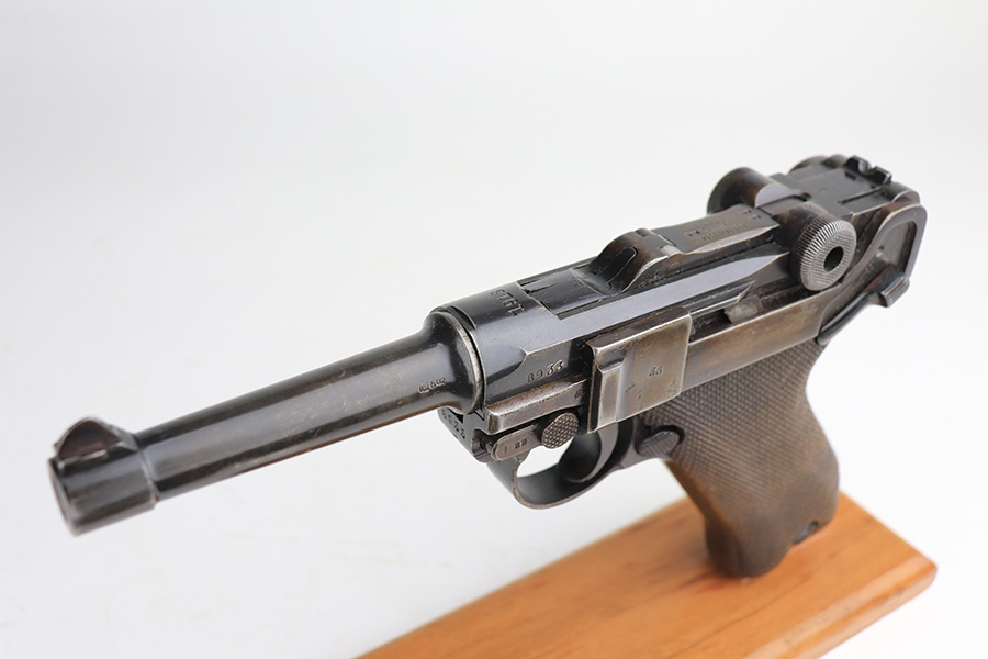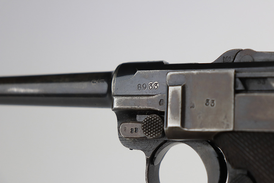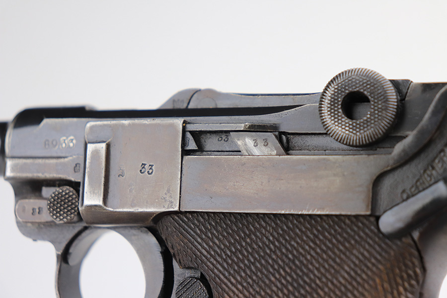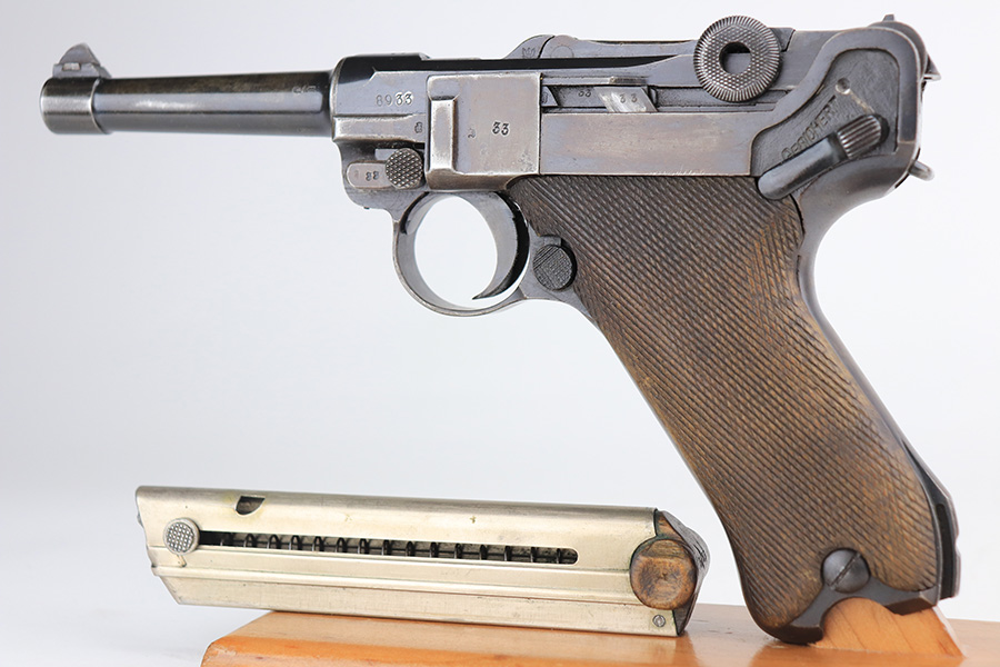 1/3/22 – This is a nice example of an Erfurt Luger issued to the Imperial German military in 1918. It is all matching, has the proper Erfurt proofs throughout, and has Imperial German military proofs on the right side of the slide. This one also comes with one original matching-numbered magazine. There is one chip and a few dings on the magazine bottom. It has retained roughly 75-80% of its original finish. There is spotty wear and brown patina on both grip straps, both sides of the frame, and on the side plate. Spotty wear on the barrel and minor wear around the muzzle. A couple areas of minor pin-pricking on the side plate. Comes with slightly worn matching-numbered wood grips. The bore has good rifling with some areas of very minor freckling here and there.