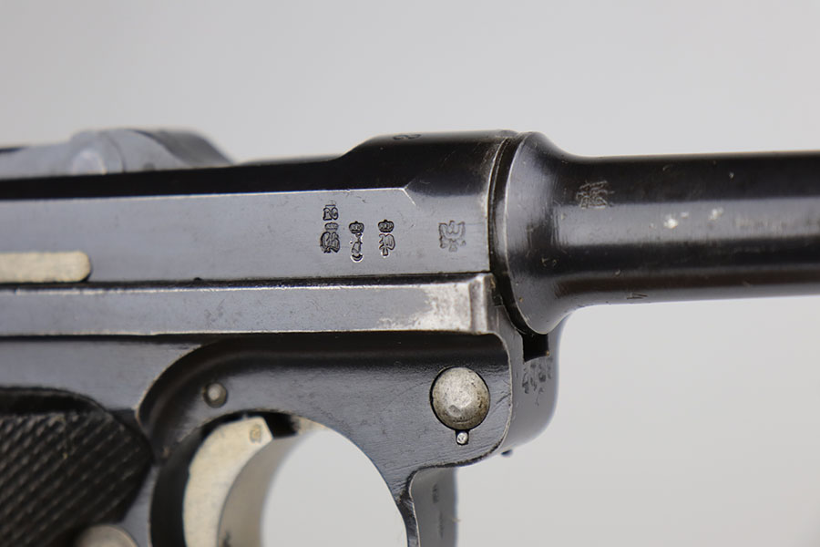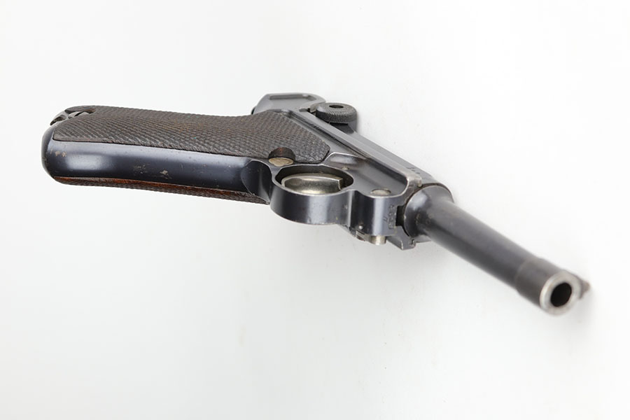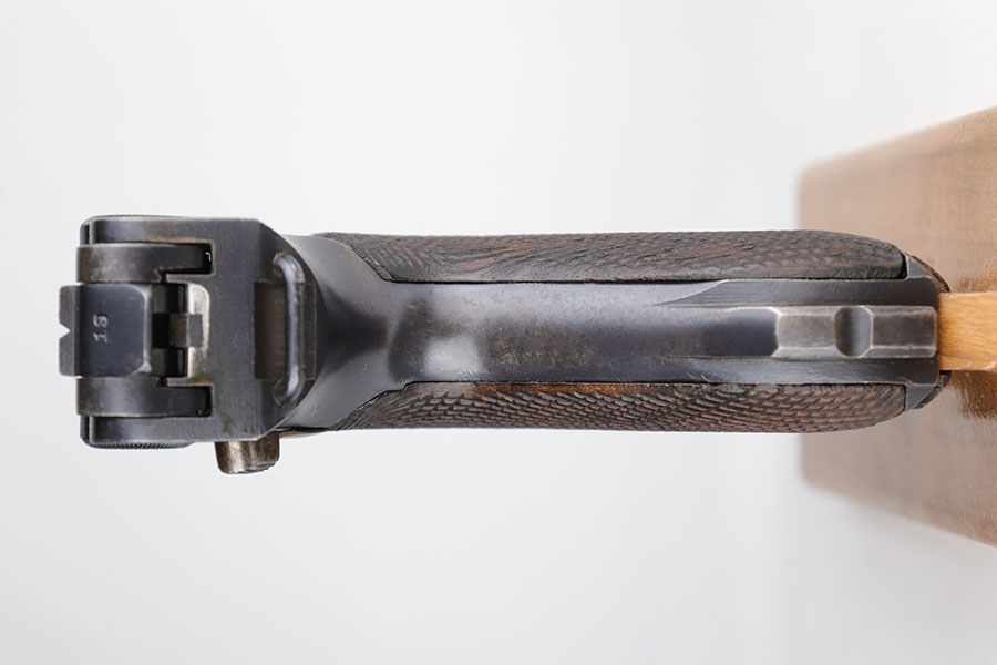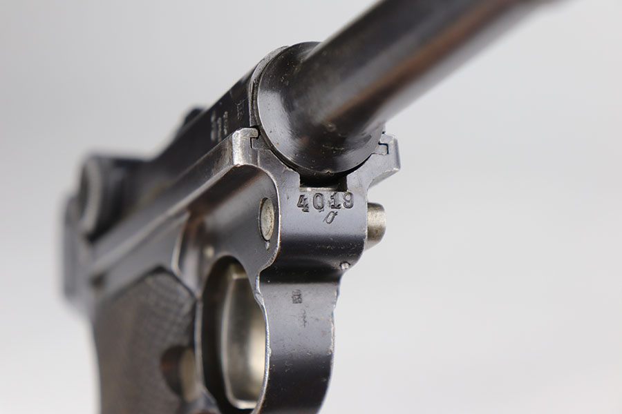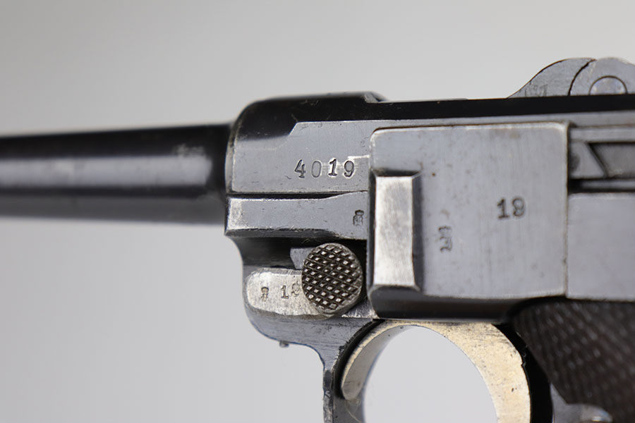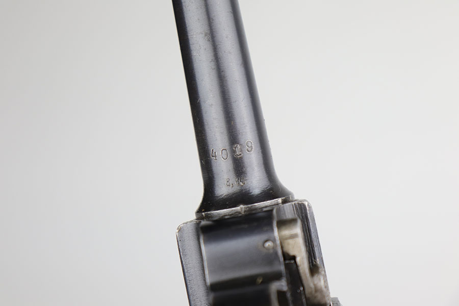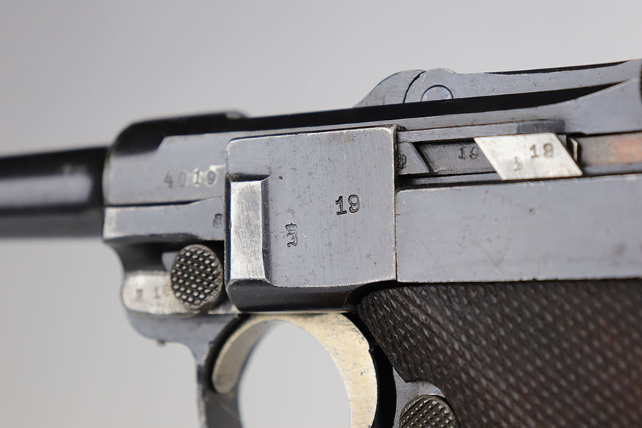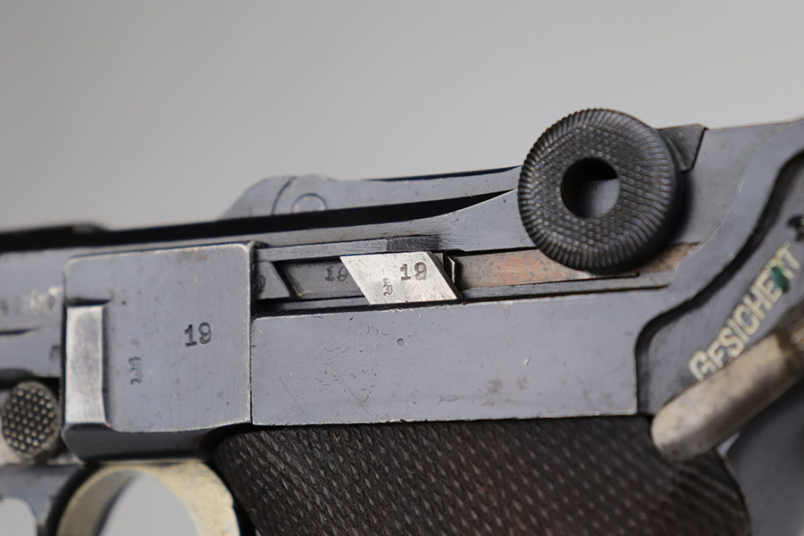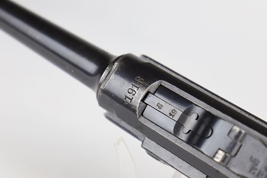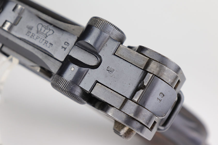 10/5/20 – This is an all matching and original Erfurt Luger rig from 1918, including the original grips and magazine. The pistol has about 93-94% of the original blue, with most of the finish loss on the high edges from the holster. There’s also a fair bit of oxidation on the back strap. The bore is fairly shiny with good rifling but minor frost throughout. The grips are in excellent condition and have no cracks or chips. The rig includes an original tool with Imperial proof, a spare magazine that is original to the era but mismatched to the gun, and a 1918 dated holster. The holster is in good condition aside from a bit of damage to the surface of the leather on the back.