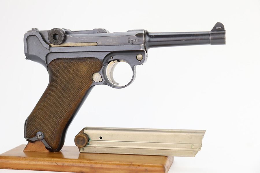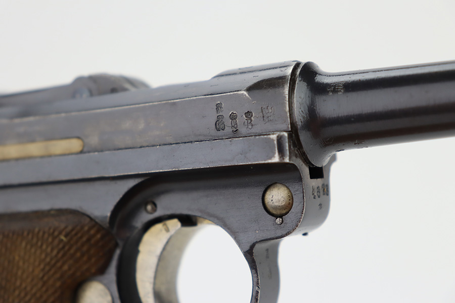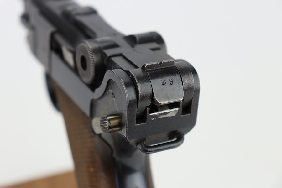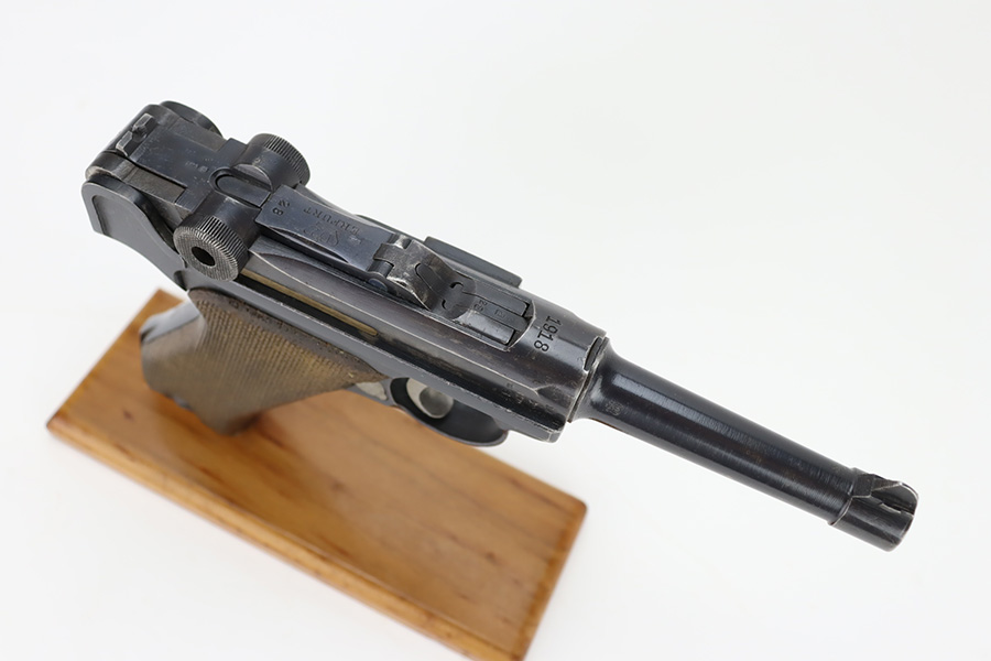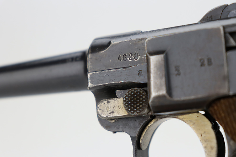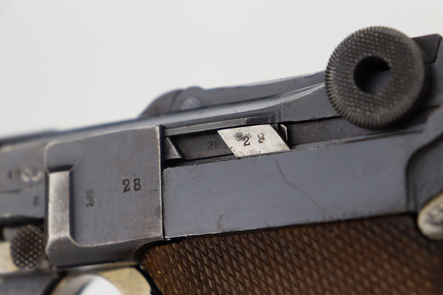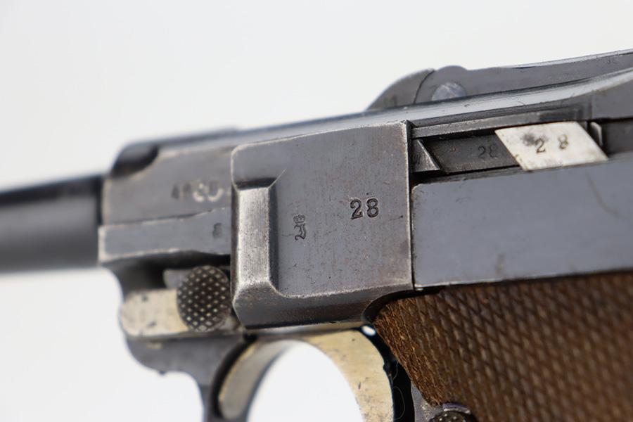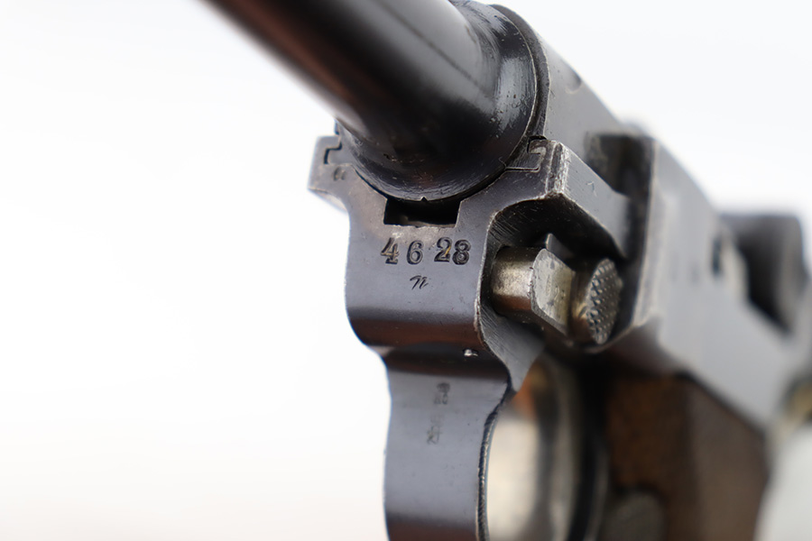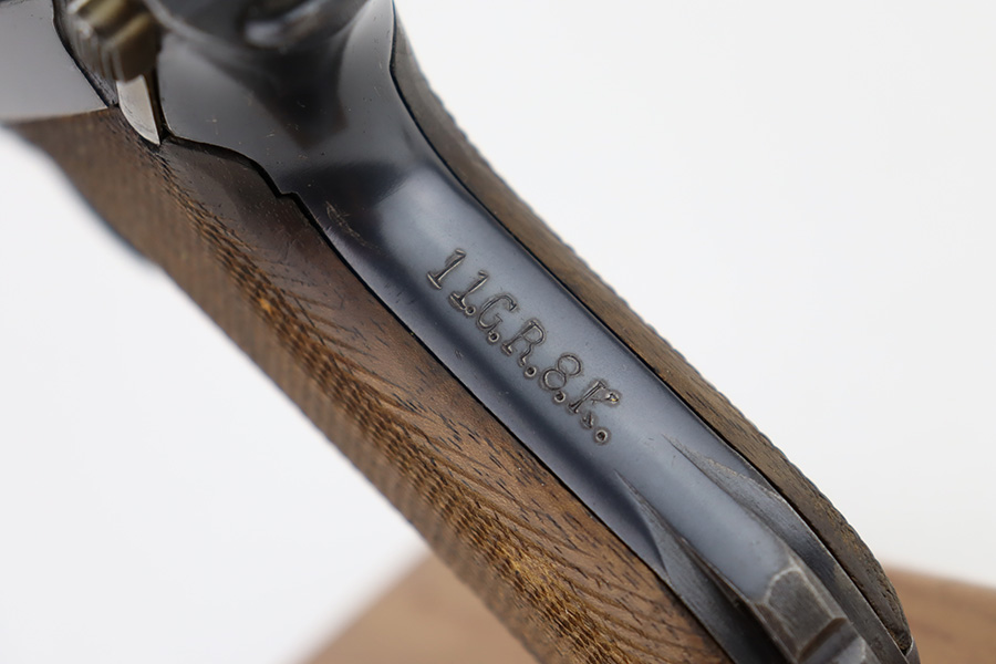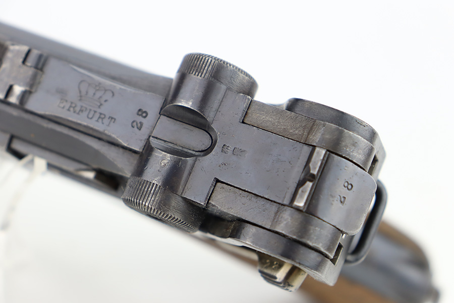 12/1/23 – This is a very nice example of an Erfurt Luger issued to the Imperial German military in 1918. All matching with the proper Imperial and Erfurt proofs throughout. There is also a “11.G.R.8.K.” unit marking on the back strap. The gun comes with one original matching-numbered magazine. The bluing rates about 93-94% with some wear on the side plate, around the chamber, and on the right side of the slide. Fitted with matching-numbered and Erfurt-proofed wood grips. The bore has pretty good rifling, but there is light pin-pricking throughout.