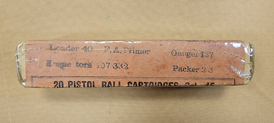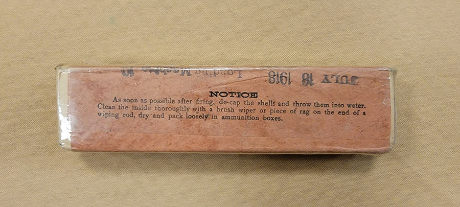 12/6/23 – This is an original box of WW1 era production .45 ammunition. The box appears to be unopened and all original labels are intact. Covered in a clear plastic wrapping for preservation. Date stamped July 18, 1918. Great condition.