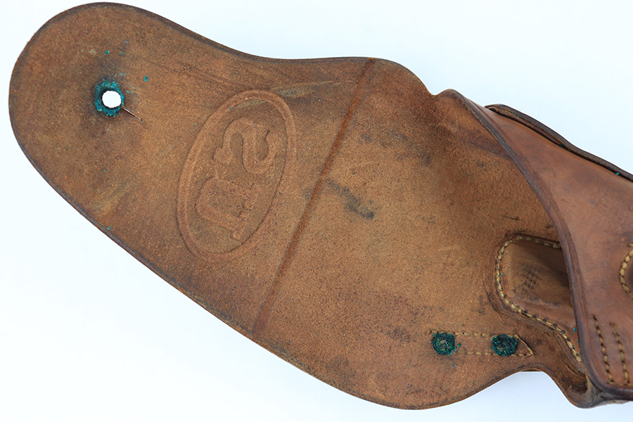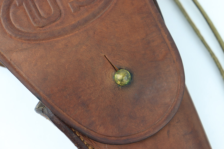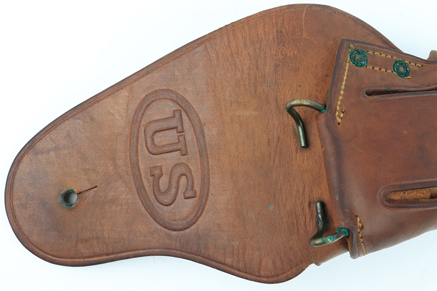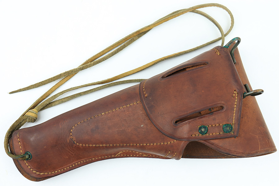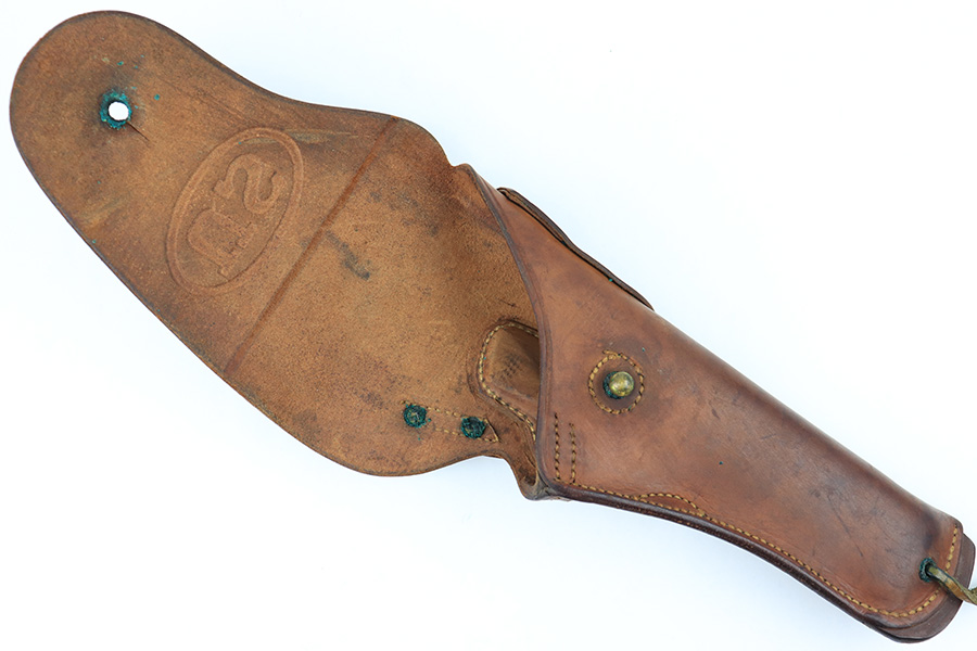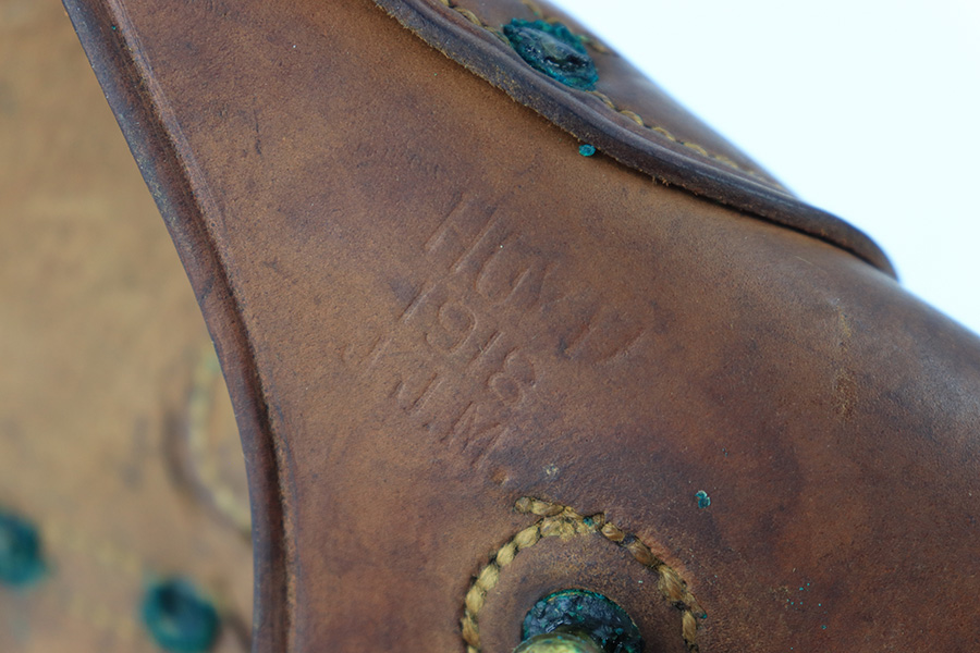8/3/23 – This is an original 1918 dated HOYT M1916 holster for the Colt M1911 pistol. The holster is in great condition with some mild surface wrinkling and normal pliability from previous use and aging. No excessive wear and fairly clean interior leather. Excellent stitching throughout. Maker and date stamped on the front leather as shown. Comes with an attached leather lanyard.