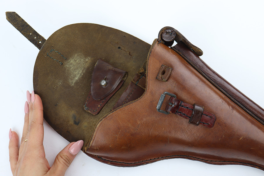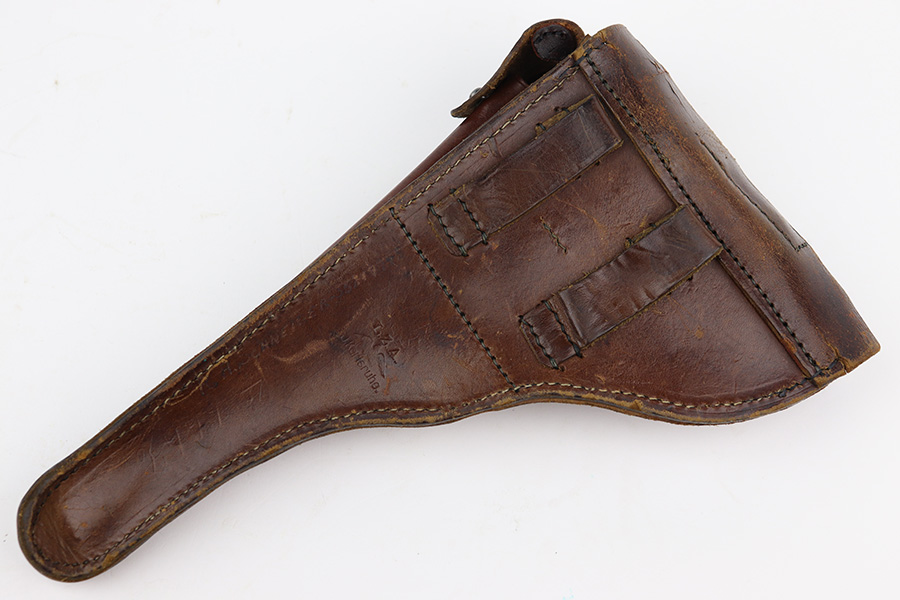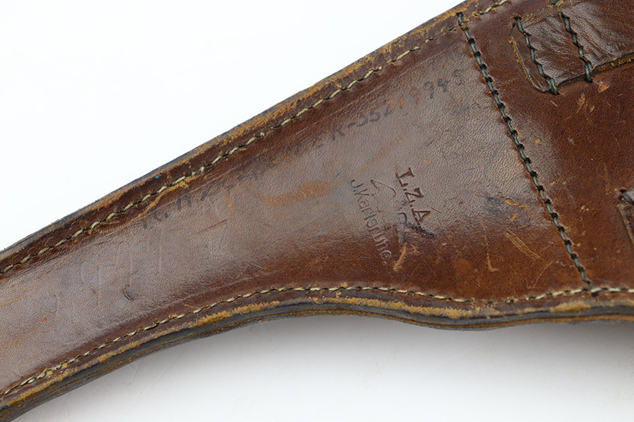 11/28/22 – This is an original, rare variation Imperial Navy Luger holster. The holster is in great overall condition with a maker and date stamp on the interior lid. There’s also multiple L.Z.A. distributor proof stamps throughout the holster (stamps found on the front, back, and interior leather). The maker stamp is faint and illegible, but the 1918 date stamp is still crisp. To the right of the tool pouch on the interior leather is a fairly deep scuff / crack in the leather, but this doesn’t go all the way through. The stitching is in great condition throughout the holster.