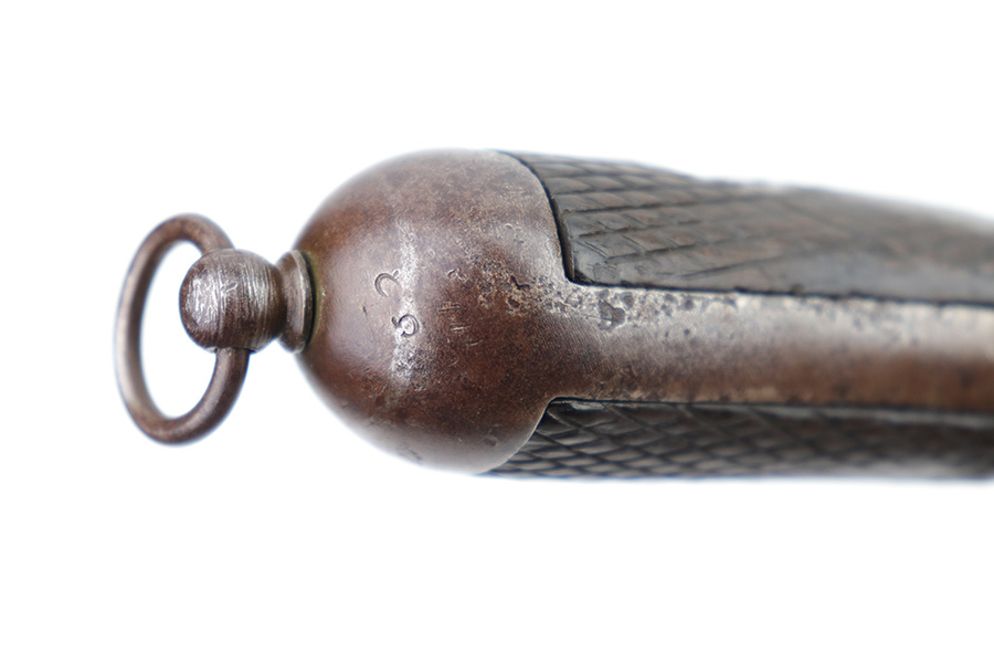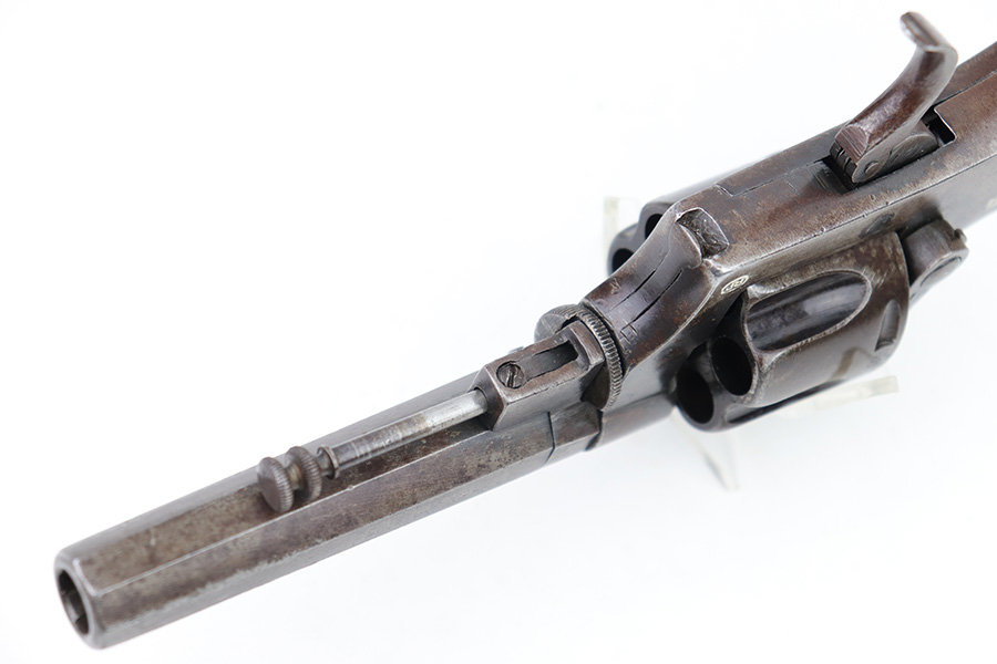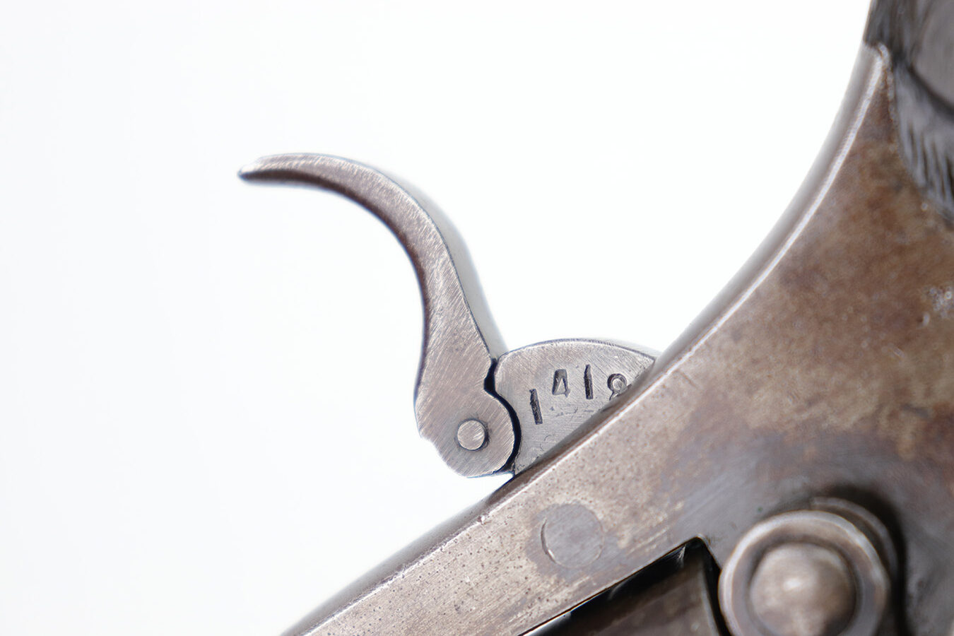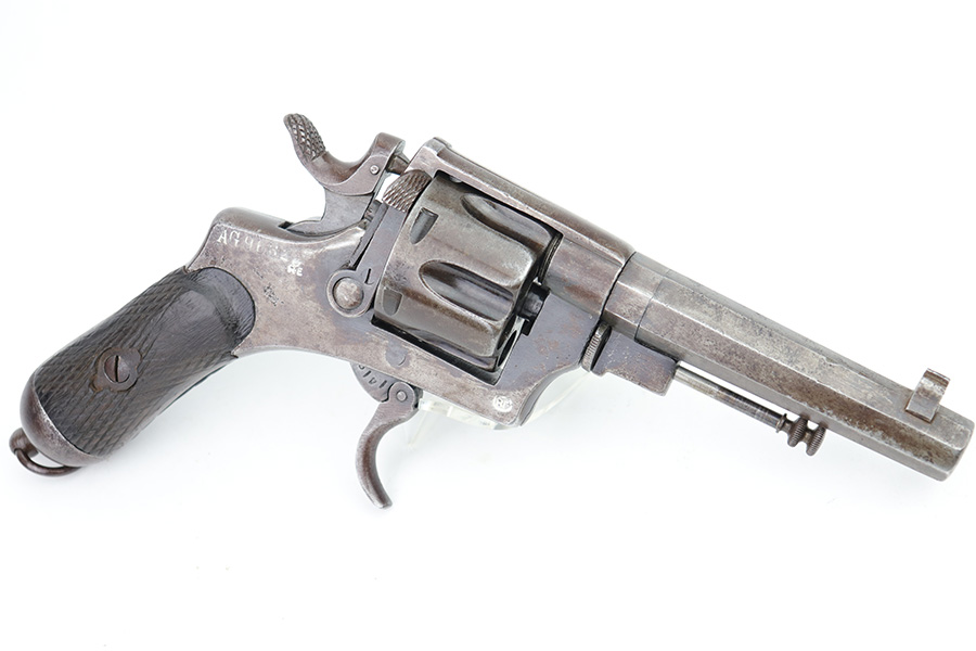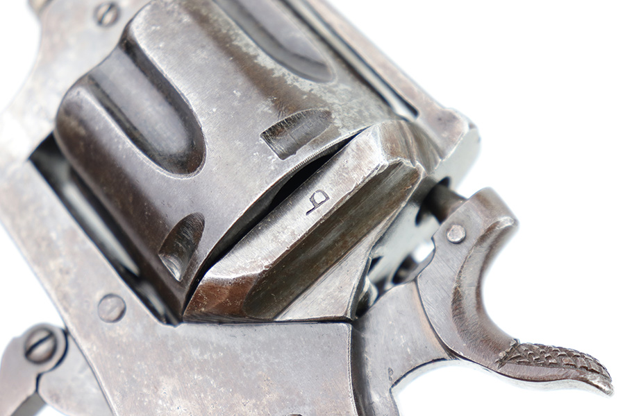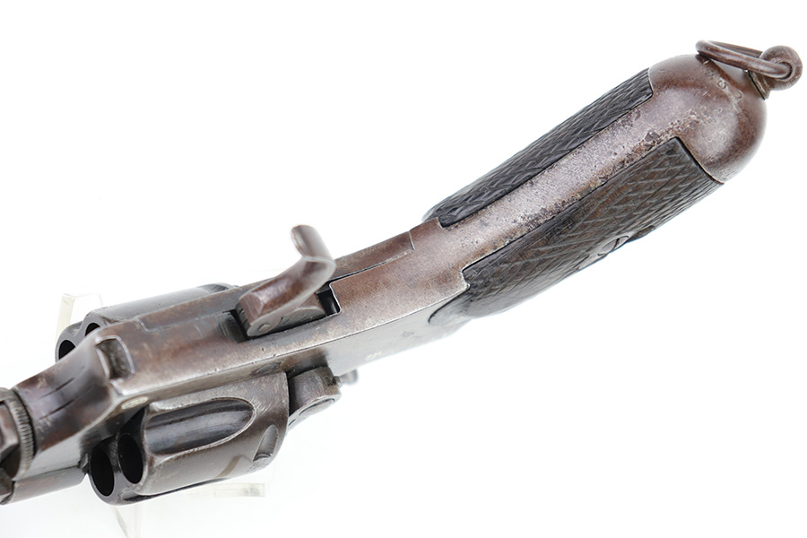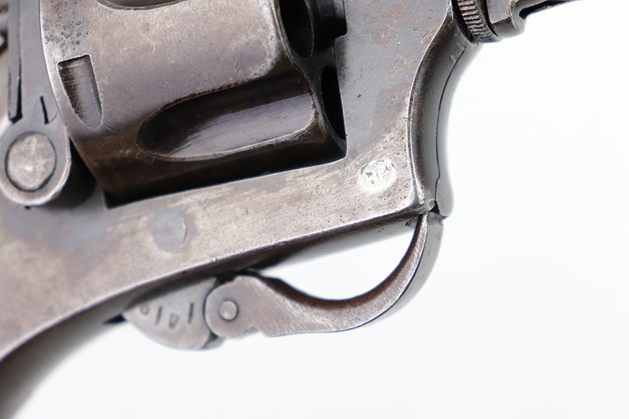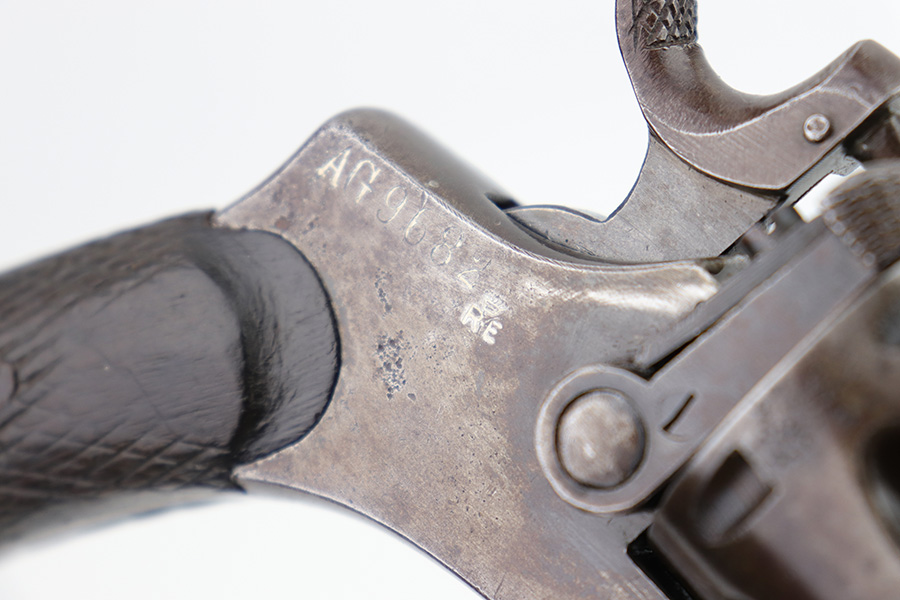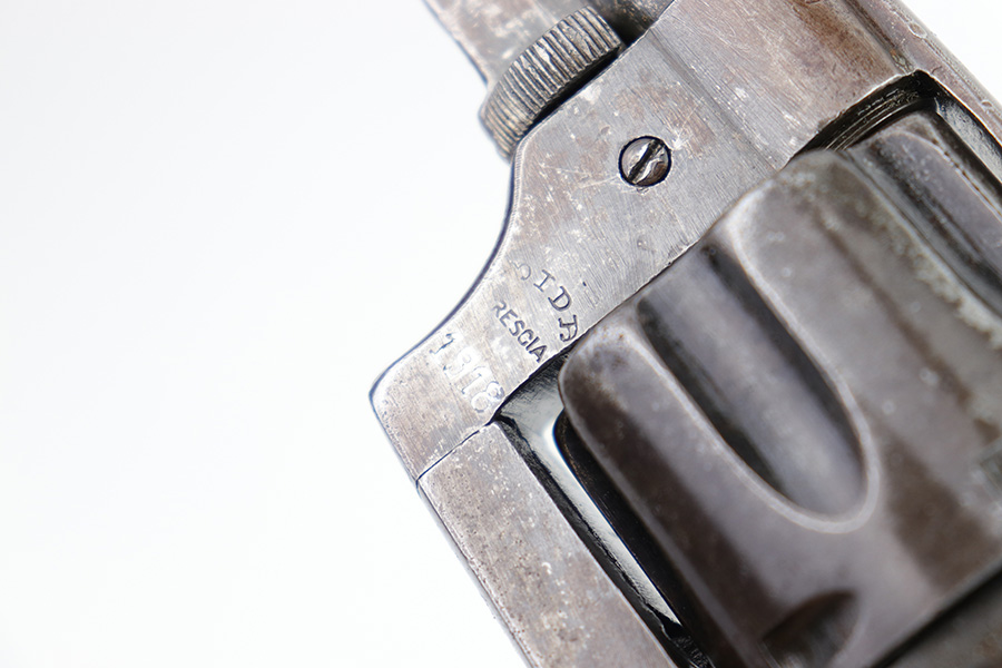 3/13/23 – This is a 1918 production Italian Bodeo M1889 Antique Revolver. These revolvers were used during WW1 and beyond, through WW2 by the Italian Army and Officers. This example was made at the end of WW1 and shows honest use and aging wear throughout. There’s dark surface patina and finish loss throughout this revolver. The right side shows a small area of pitting just below the unit stamp and “RE” Italian proof stamp. More pitting is found near the grips along the front strap, and in small areas of the cylinder. The wood grips are original and in great shape with no cracks or chips. Mechanically sound with good lockup and timing. The bore is surprisingly nice with strong rifling and some mild patina throughout, but no rust or pitting. Overall this is a mechanically nice piece with honest wear and aging throughout.