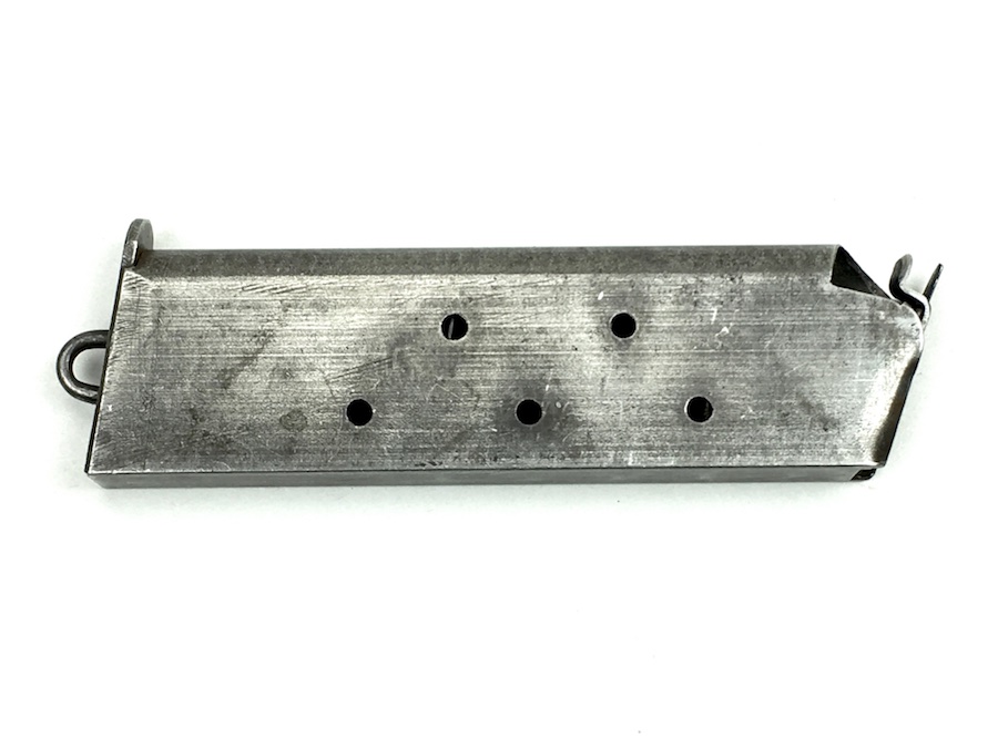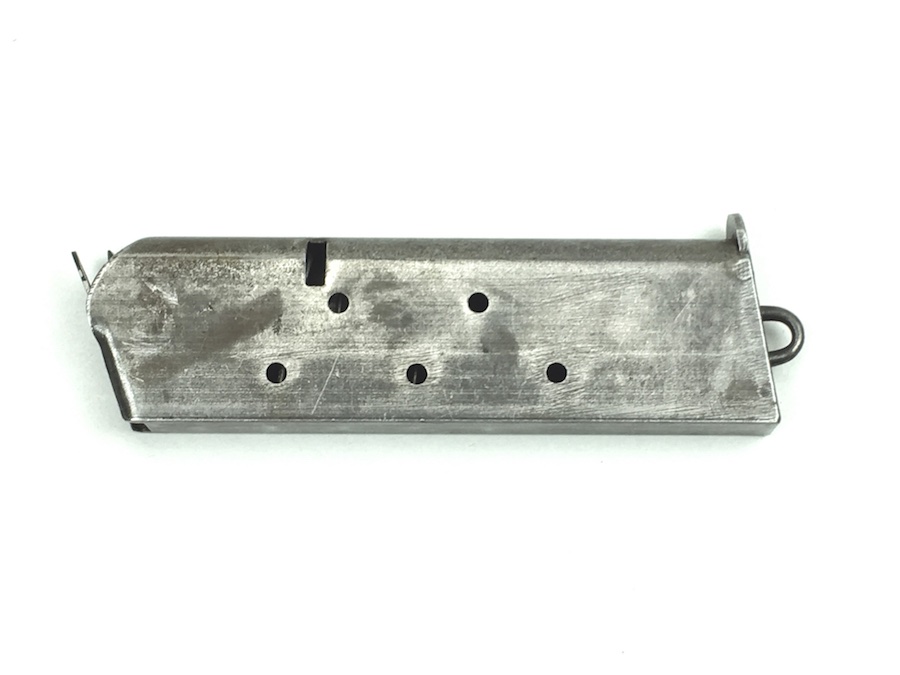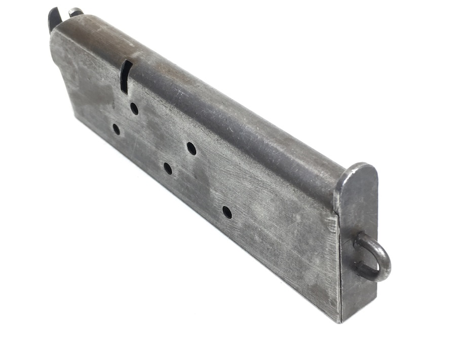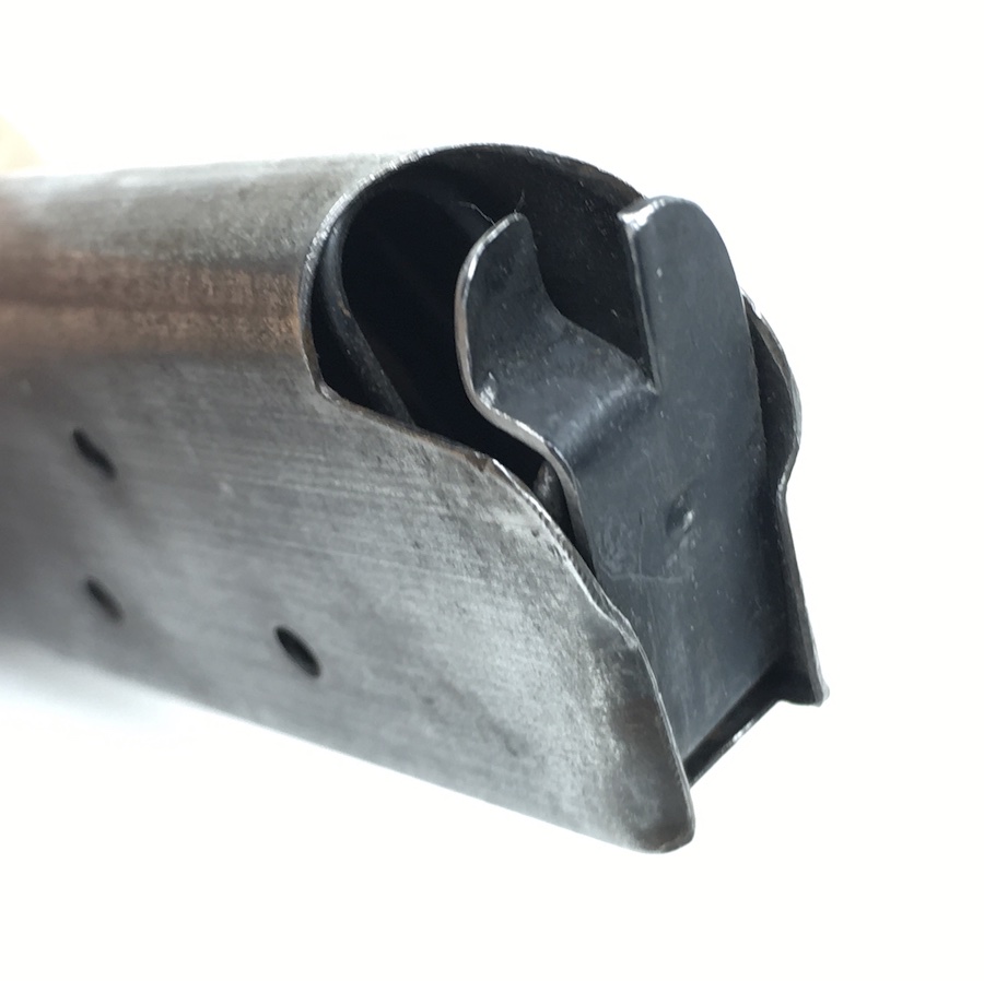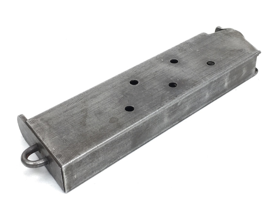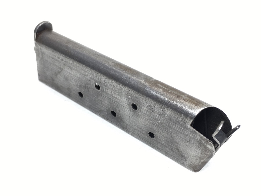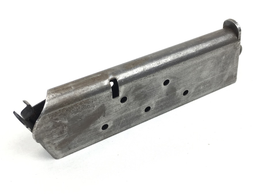 6/20/19 – This is an original model 1918 Norwegian Colt (also known as the Kongsberg Colt) pistol magazine. The magazine is very similar to, and would also work for a WW1 era 1911 Colt. The magazine holds 7 rounds of .45 caliber ammunition. Spring is excellent and fully functional. No rust or pitting on the magazine, but there is minor wear to the blued finish. Overall very good.