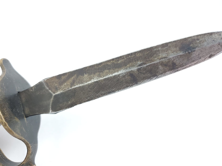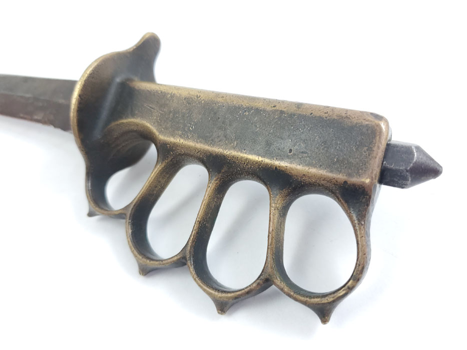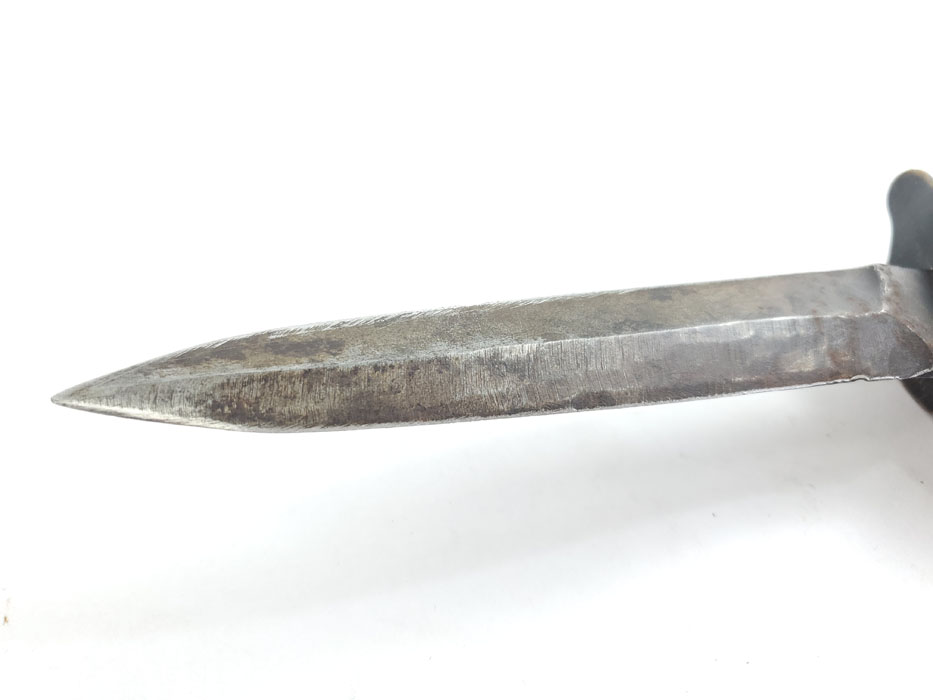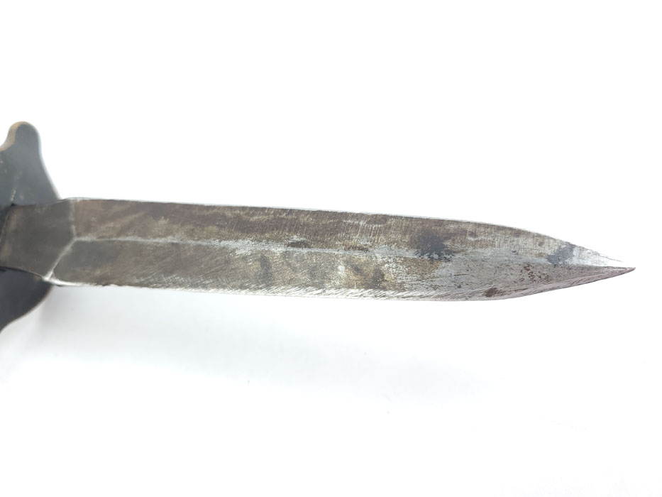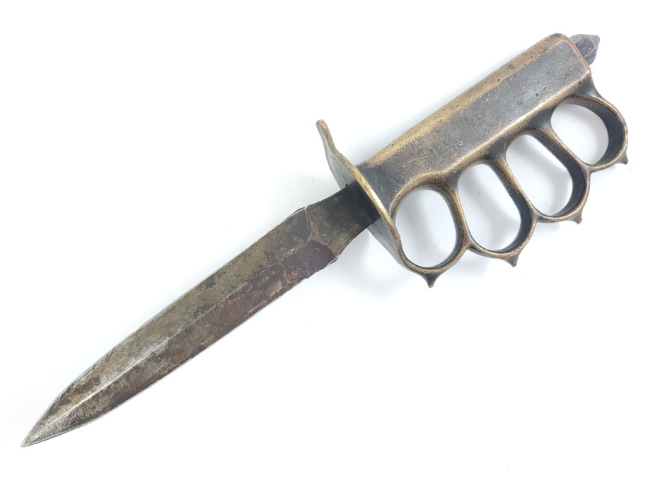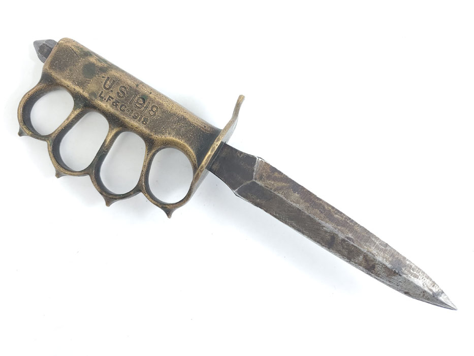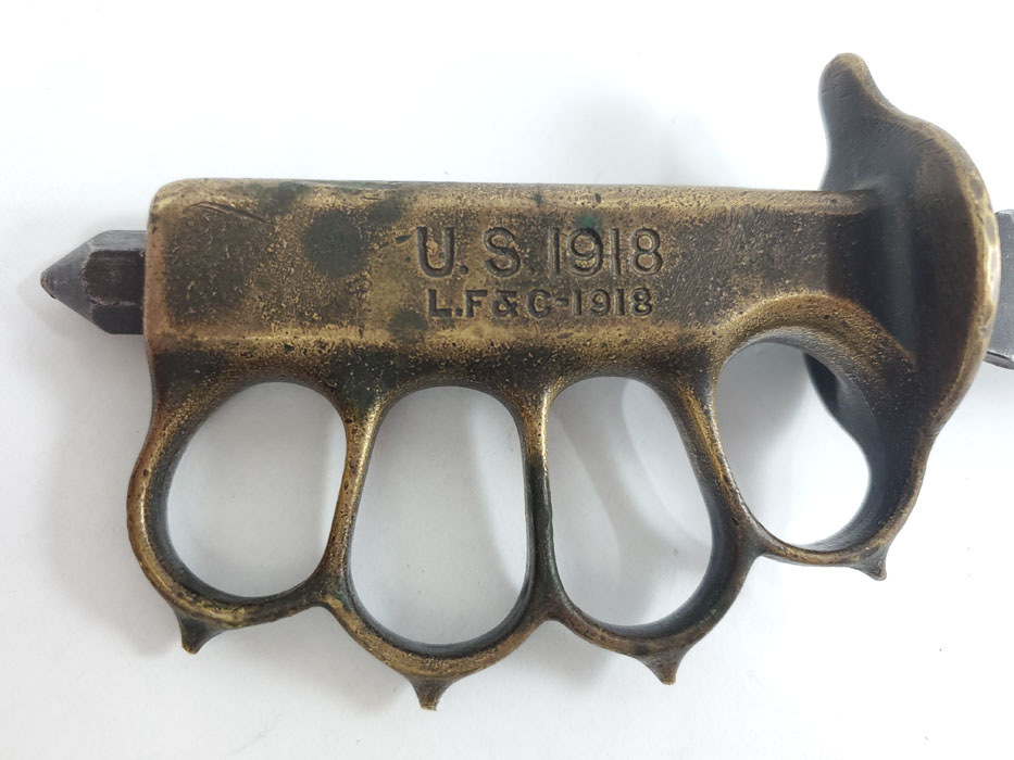 5/22/20 – This is an original WW1 production L.F&C trench fighting knife. The knuckle knife has the typical “U.S. 1918 L.F&C-1918” inscription on one side of the handle, and no other markings. The blade shows signs of use and wear, as shown. There are signs of sharpening as well as a few small nicks in the edge, showing this piece was used. There is no scabbard included, and the price has been adjusted accordingly.