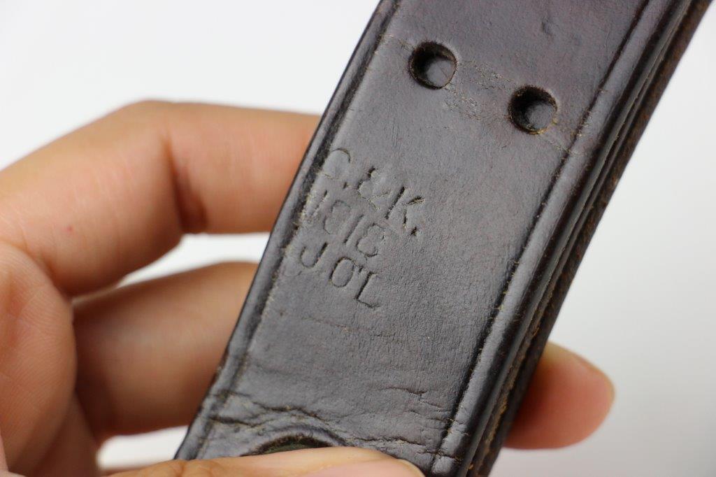 7/17/24 – This is an original WW1 production US M1907 Leather Rifle Sling. The leather is in excellent condition, especially for its age. Minimal wrinkling and no cracks or significant surface damage. The metal clips are similar in condition, but one is steel while the other is non-magnetic brass. Both leather retaining / adjustment loops are excellent with all original stitching. Maker stamped, dated, and inspector initial stamped as shown.