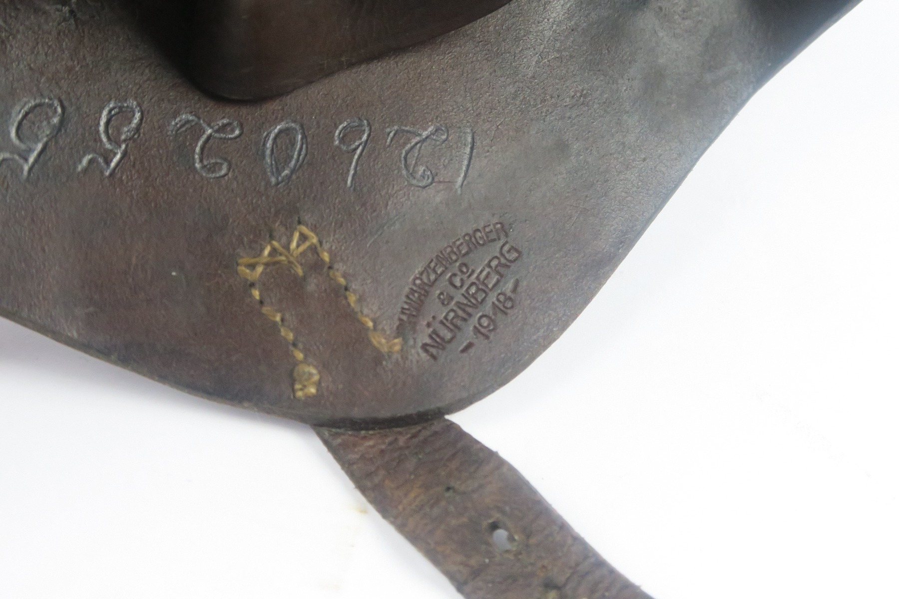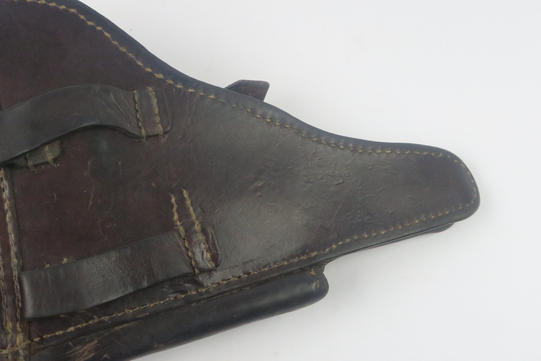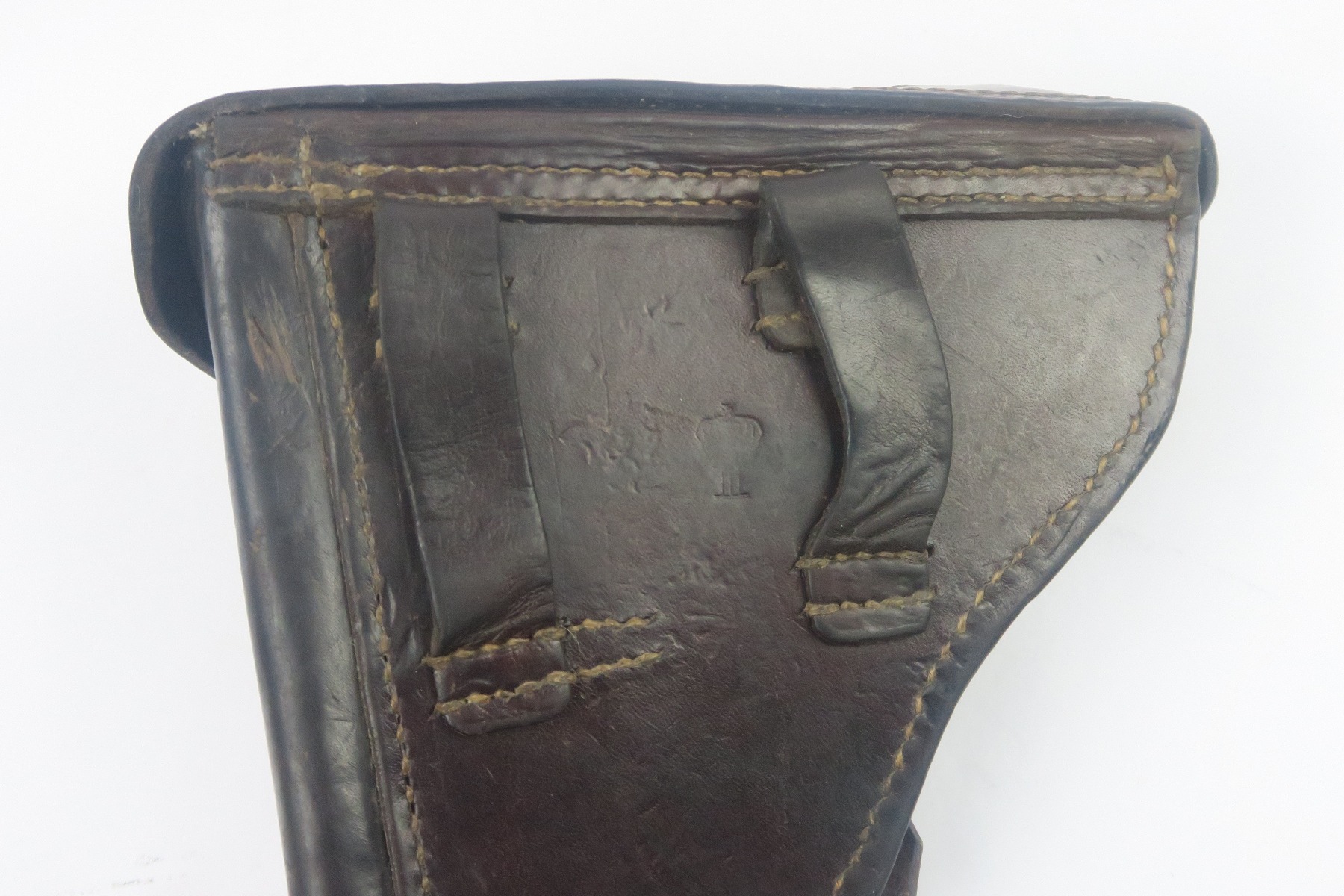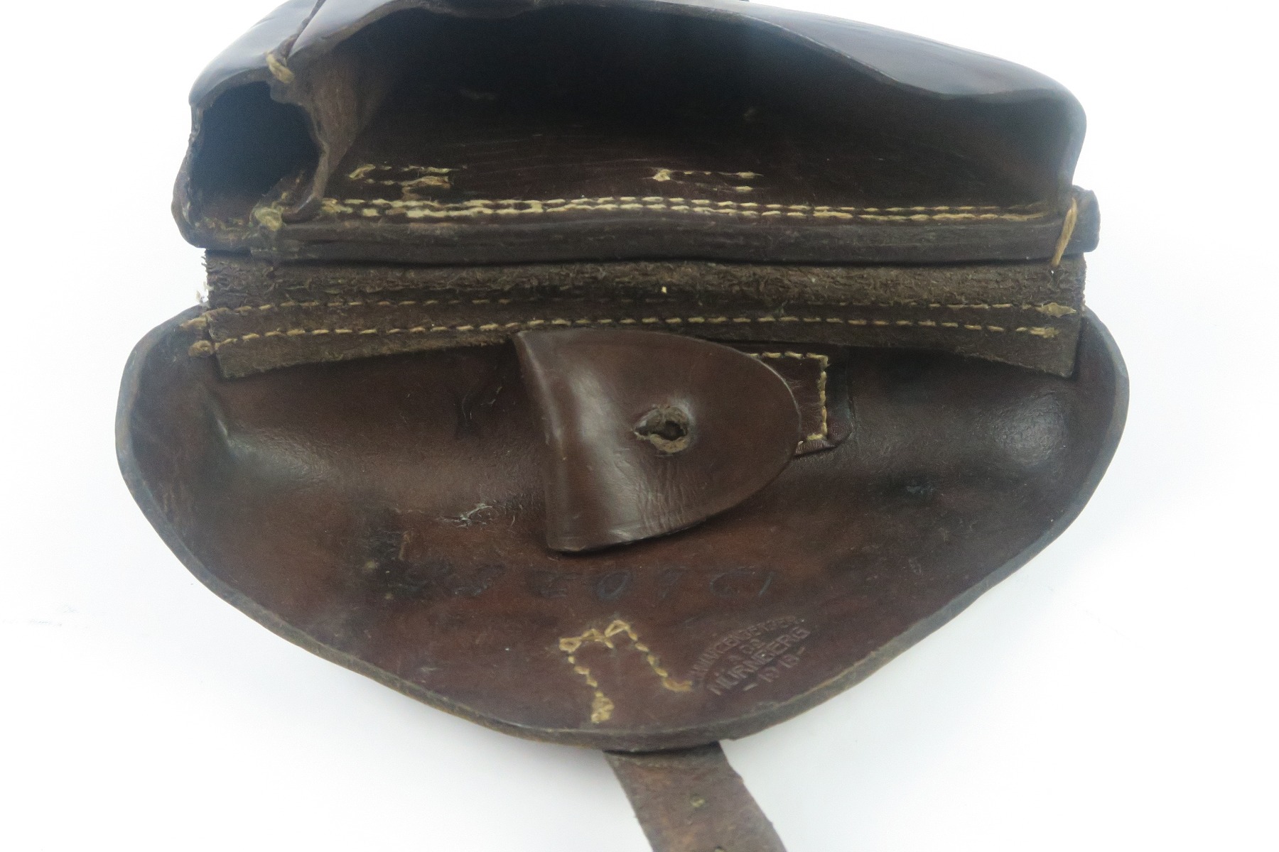 1/30/18 – This is an original 1918 dated Luger holster from WW1. The holster has nice leather with normal wear and pliability. The overall condition is excellent give the holster’s age. The stitching is all tight and original. The interior leather has a crisp maker stamp and date. The back leather has an imperial crown over roman numeral three. Guaranteed all original and authentic.