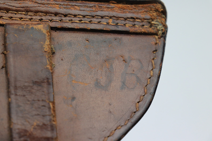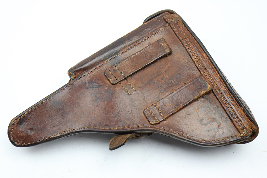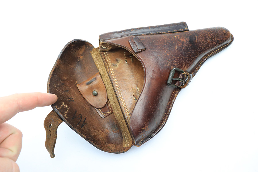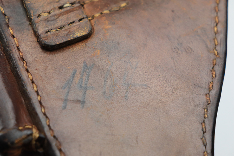 5/13/22 – This is an original 1918 dated Luger holster. The holster is maker stamped and dated on the interior leather lid. There’s also an ink stamp on the interior leather. The back leather has an imperial crown proof stamp, but this is very faint and hard to see / photo. The holster leather has surface cracking throughout the front leather, but this doesn’t go too deep into the leather beyond the surface. The leather has normal pliability throughout and holds shape nicely. No notable stitching flaws.
