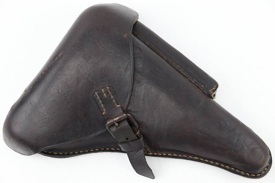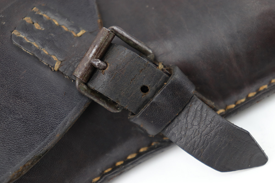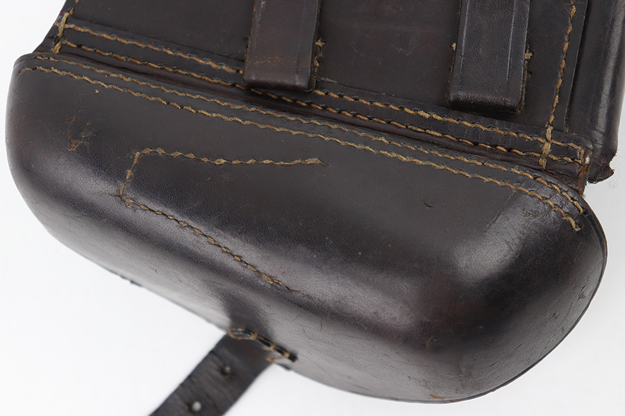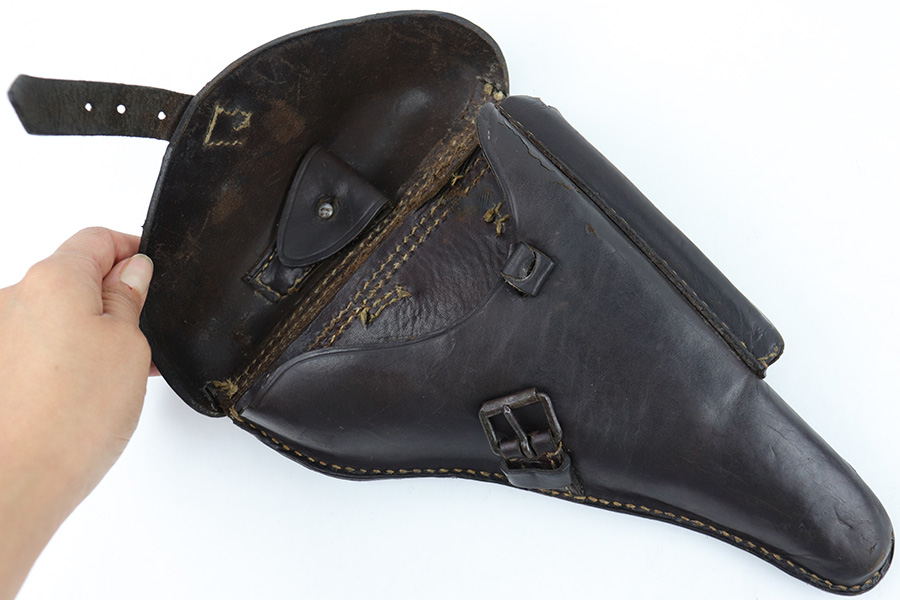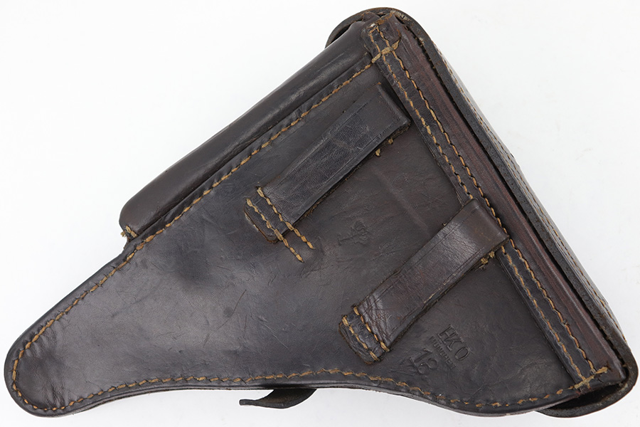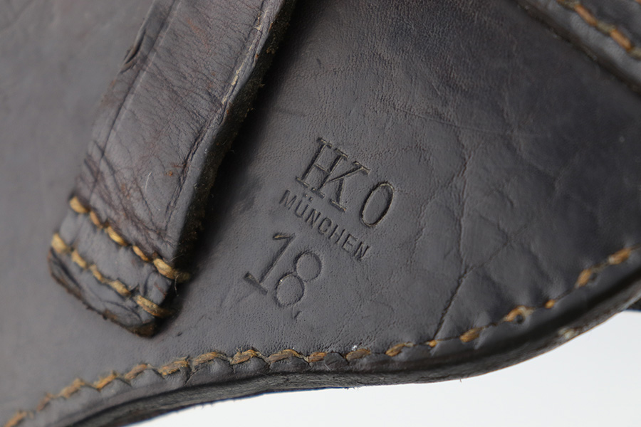 5/25/23 – This is an original 1918 dated Luger holster from WW1. The holster is in great overall condition with all original leather and stitching. Normal pliability and typical signs of previous use and aging throughout. The back leather is maker stamped with an Imperial proof stamp, and a 1918 date stamp.