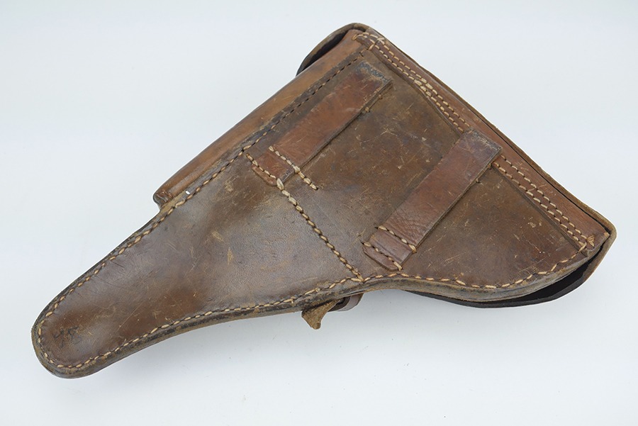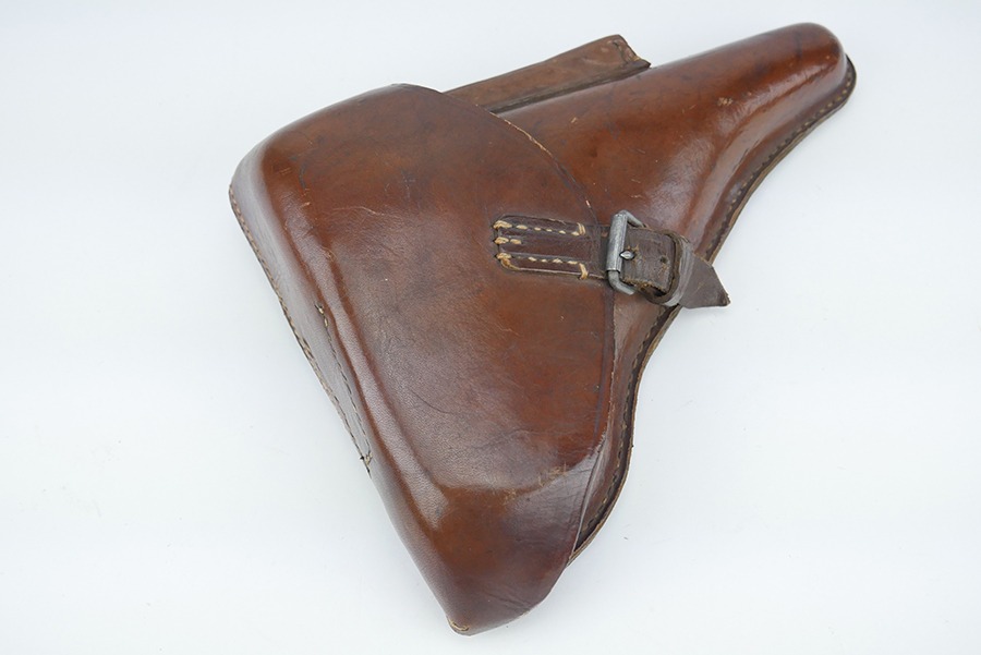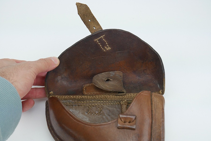 11/25/24 – This is a great condition 1918 dated Luger holster from WW1. The holster is maker stamped and date stamped in the inside of the flap. The exterior leather flap has what appears to be a serial number written on it “8462”. The leather is strong with mild pliability throughout. The exterior has light scuffs but no major issues. The closure strap is wrinkled and soft, but still completely intact. The stitching is excellent with no stitching issues of note. Interior leather shows typical use wear. A great WW1 example.