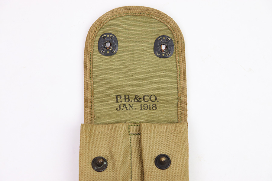 11/16/22 – This is an original WW1 production magazine pouch that holds two M1911 magazines. The pouch is in excellent condition with a minty ink stamp on the interior as shown.