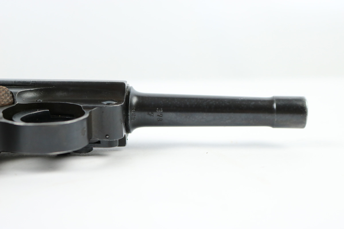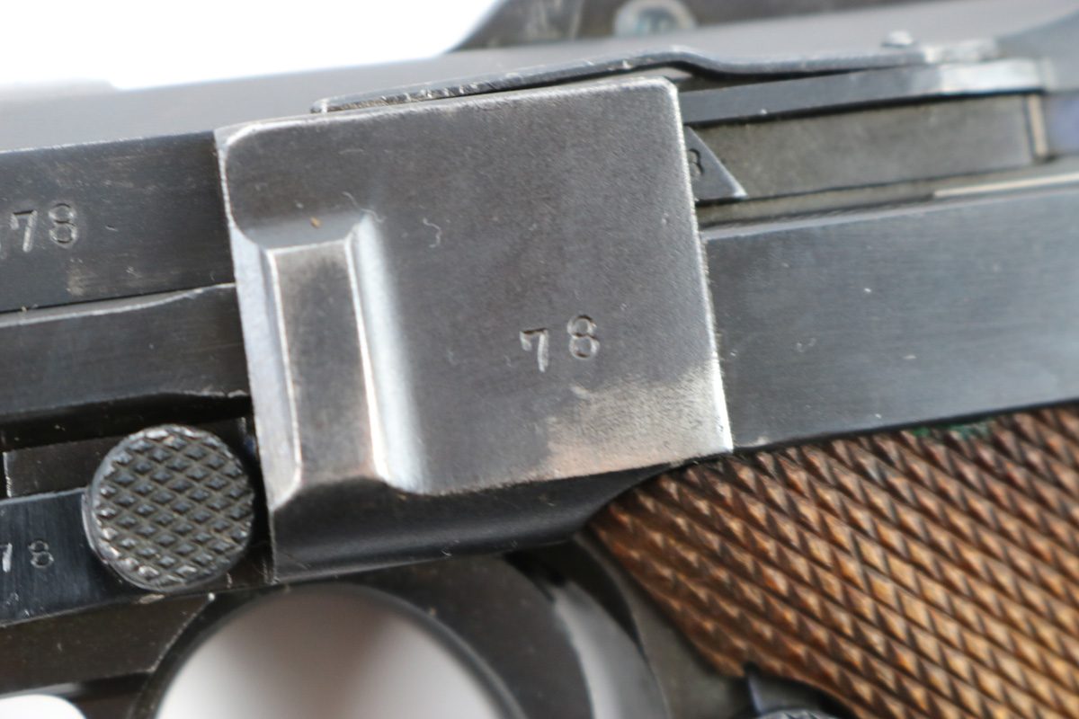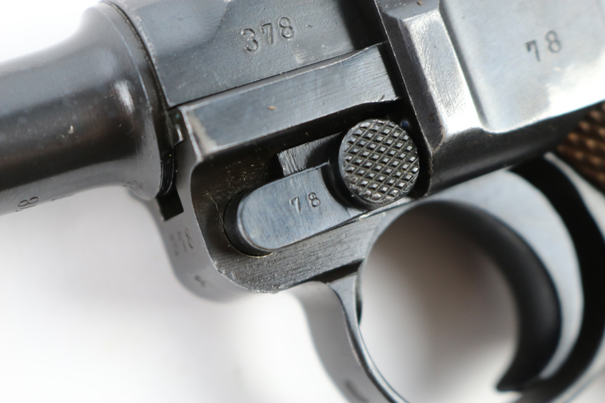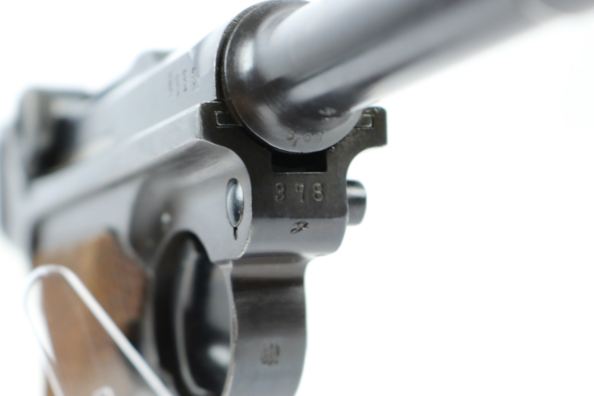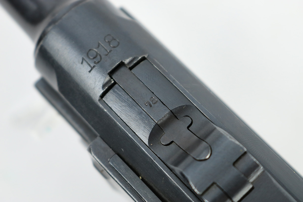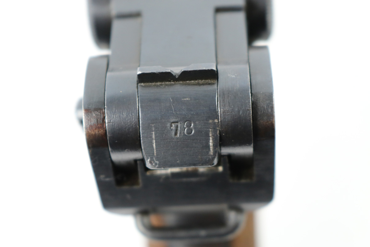 9/26/18 – This is a very interesting an unique 1918 DWM Luger that was later re-issued to the Police after WW1. The pistol comes with an original matching numbered magazine, matching numbered holster, and matching numbered tool. The holster and tool were likely unit stamped after the pistol was received and reworked (with the sear safety) in the police armory. The pistol is in great shape with some wear on the side plate and light bluing loss on the barrel. The straps are excellent, only showing trace amounts of browning / patina. Overall we rate at about 96% condition. The bore is excellent with minimal wear – a 9 out 10 overall. The grps are marked on the interior with “78” and the magazine has a small scuff mark, but ends in number “78” as well (matching from what we can see). The holster and tool are in great shape – the holster has been embellished with uniform emblems. Guaranteed all original and authentic.
