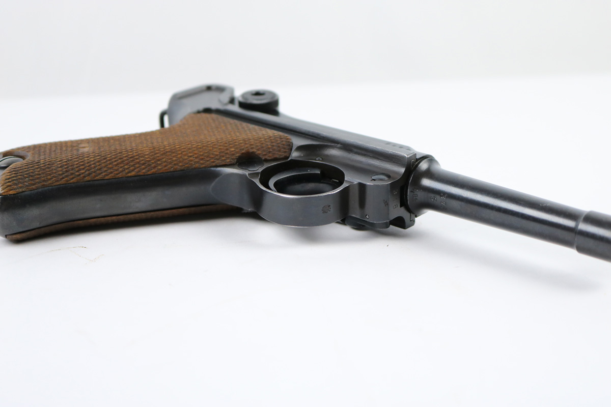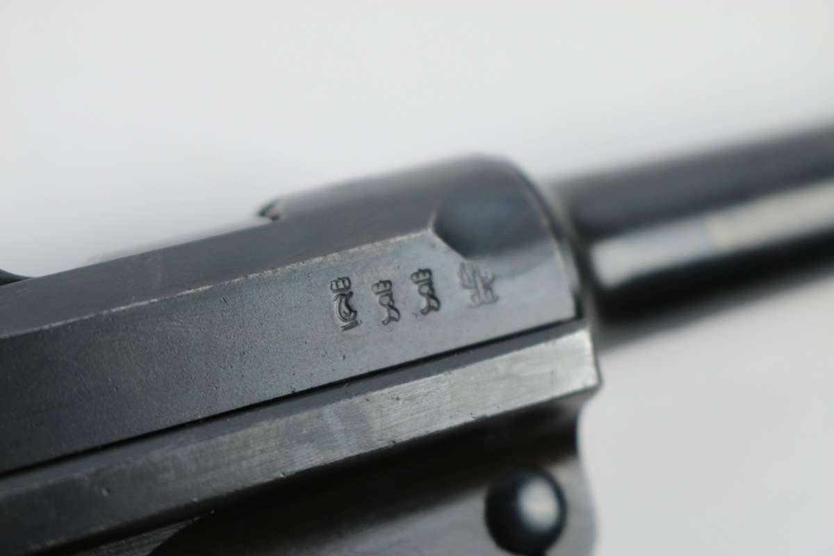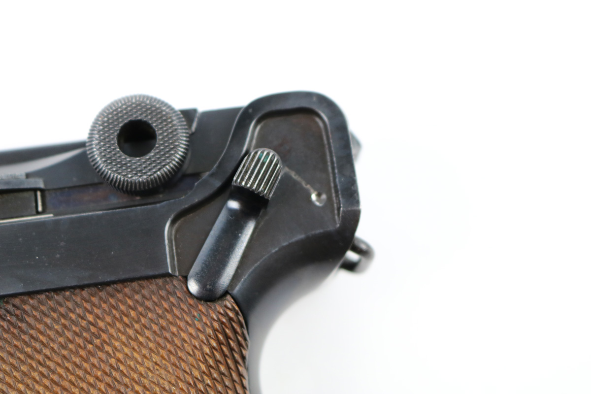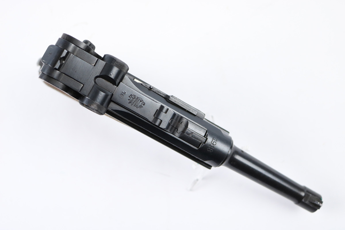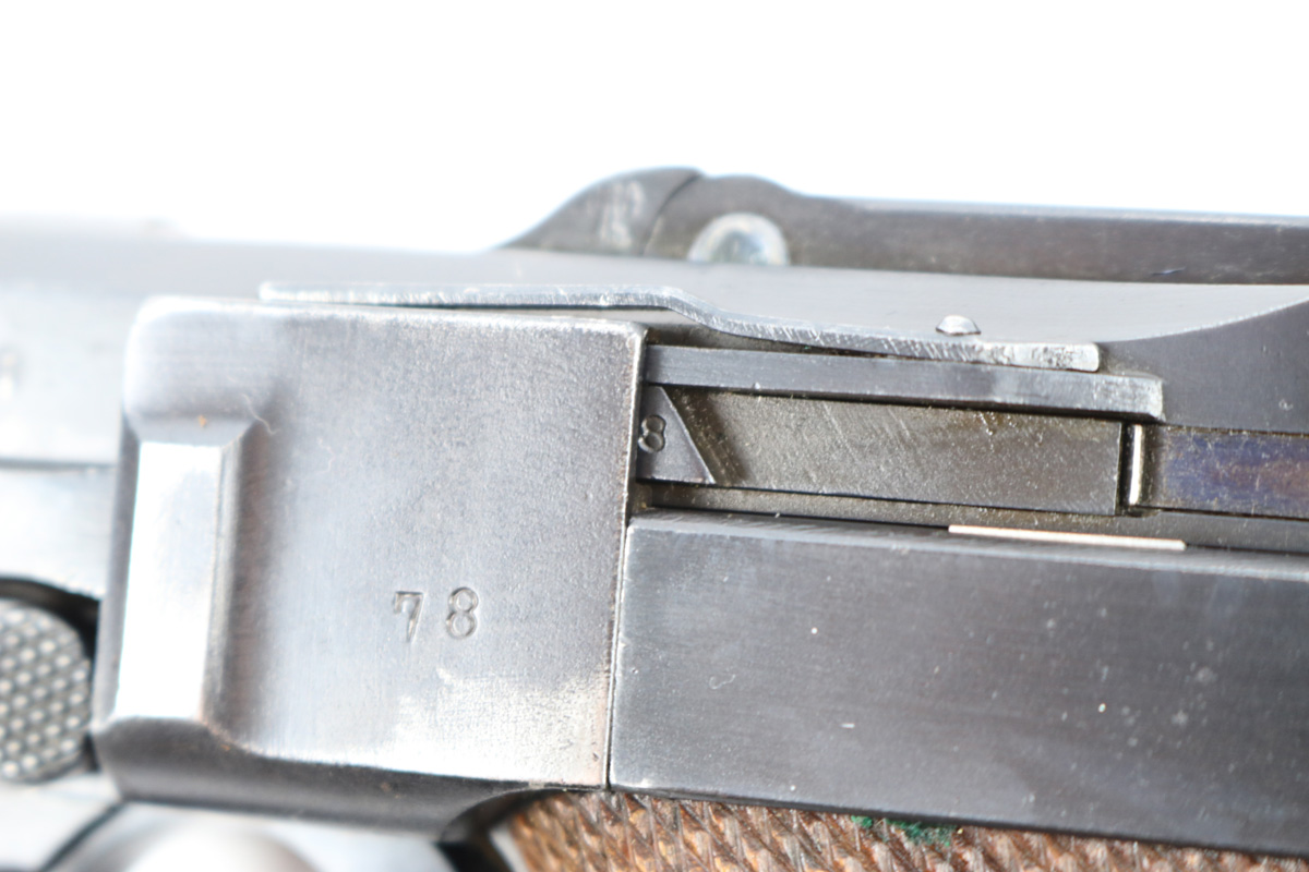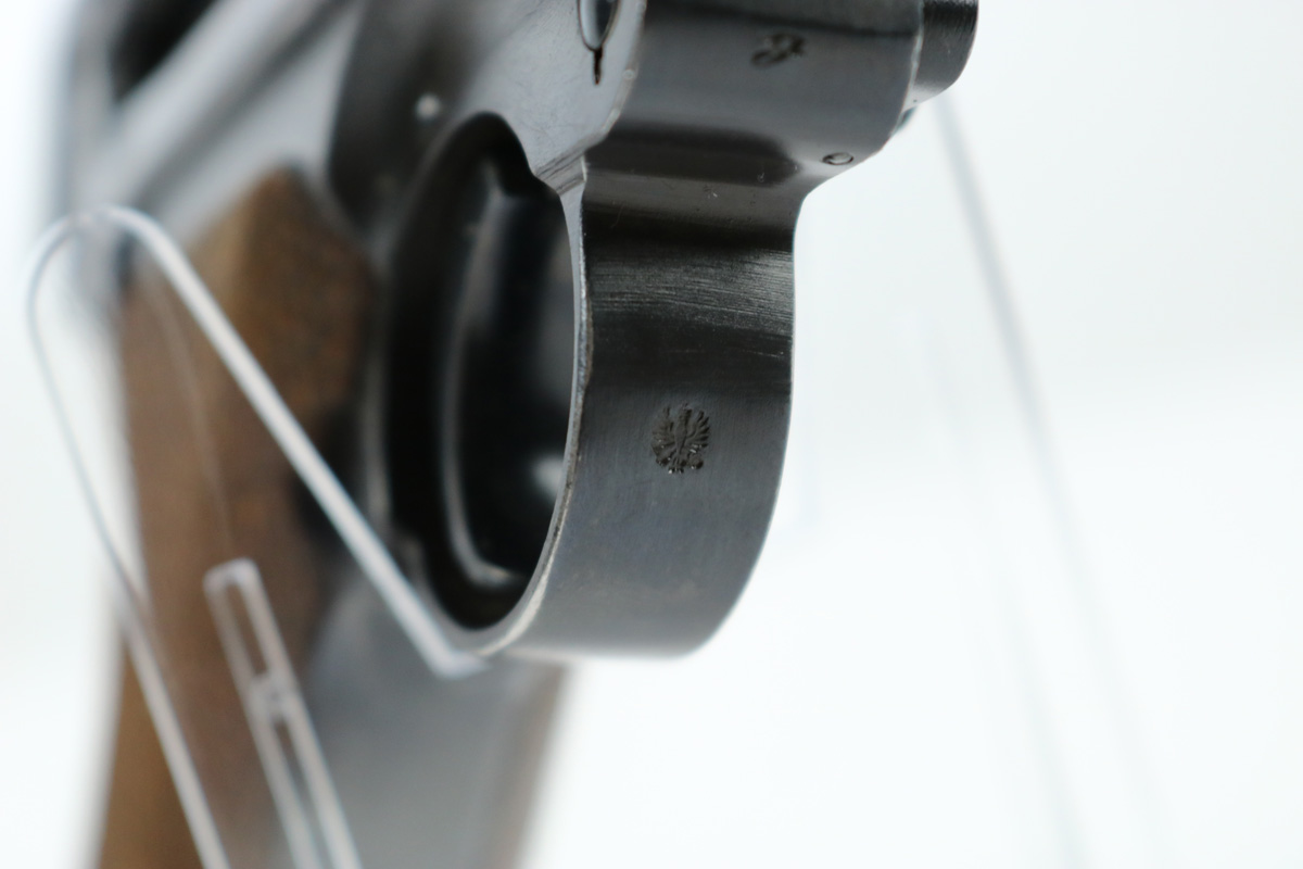 9/26/18 – This is a very interesting an unique 1918 DWM Luger that was later re-issued to the Police after WW1. The pistol comes with an original matching numbered magazine, matching numbered holster, and matching numbered tool. The holster and tool were likely unit stamped after the pistol was received and reworked (with the sear safety) in the police armory. The pistol is in great shape with some wear on the side plate and light bluing loss on the barrel. The straps are excellent, only showing trace amounts of browning / patina. Overall we rate at about 96% condition. The bore is excellent with minimal wear – a 9 out 10 overall. The grps are marked on the interior with “78” and the magazine has a small scuff mark, but ends in number “78” as well (matching from what we can see). The holster and tool are in great shape – the holster has been embellished with uniform emblems. Guaranteed all original and authentic.