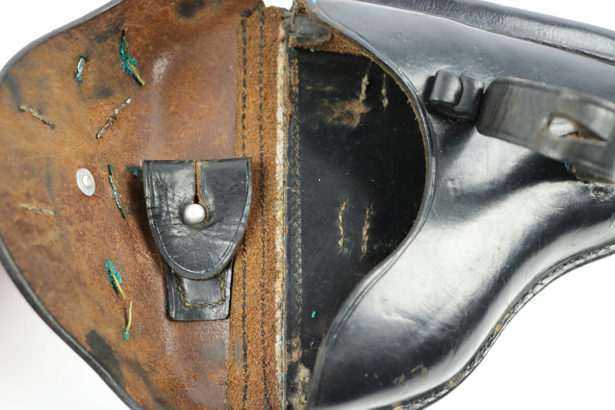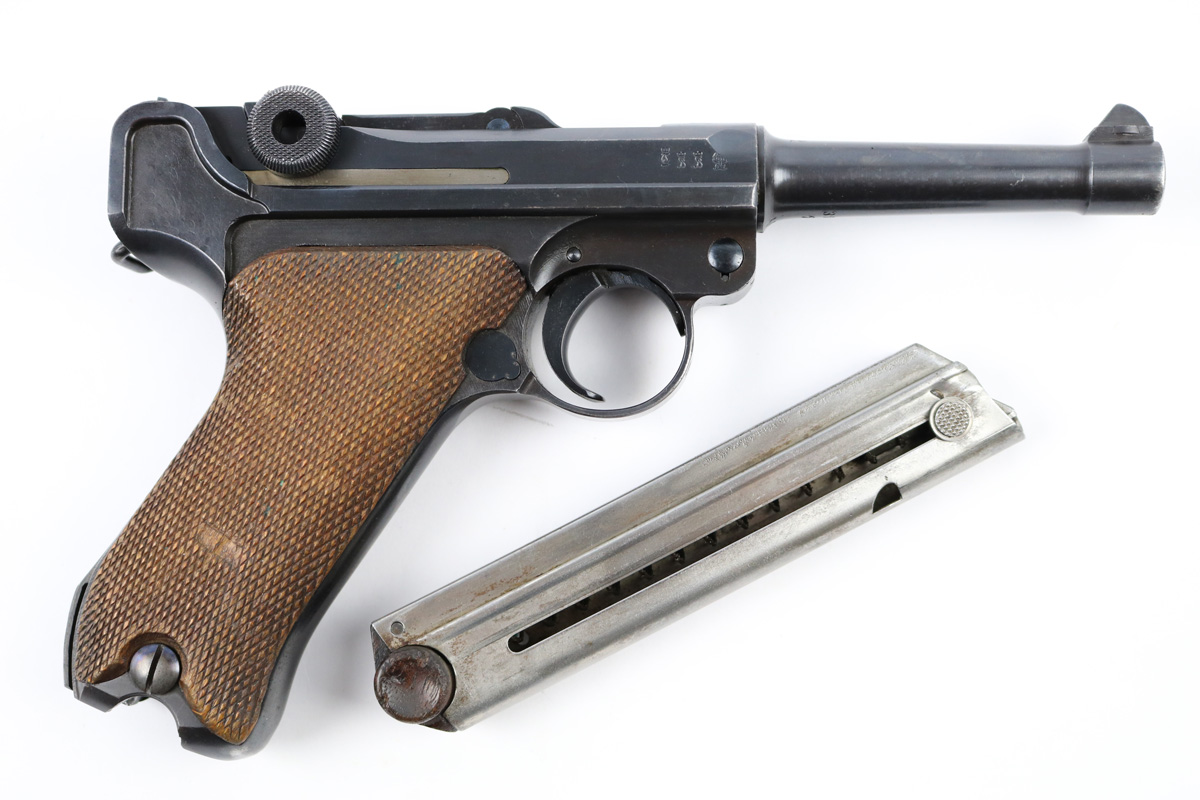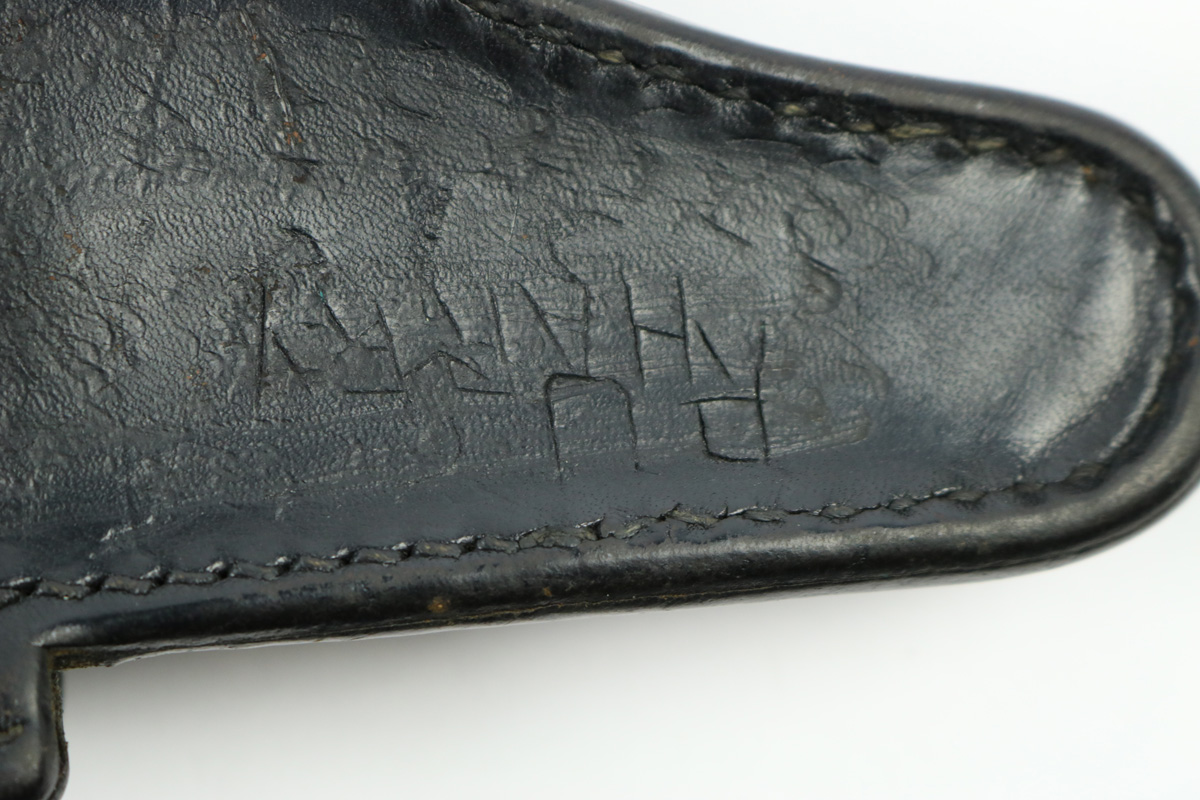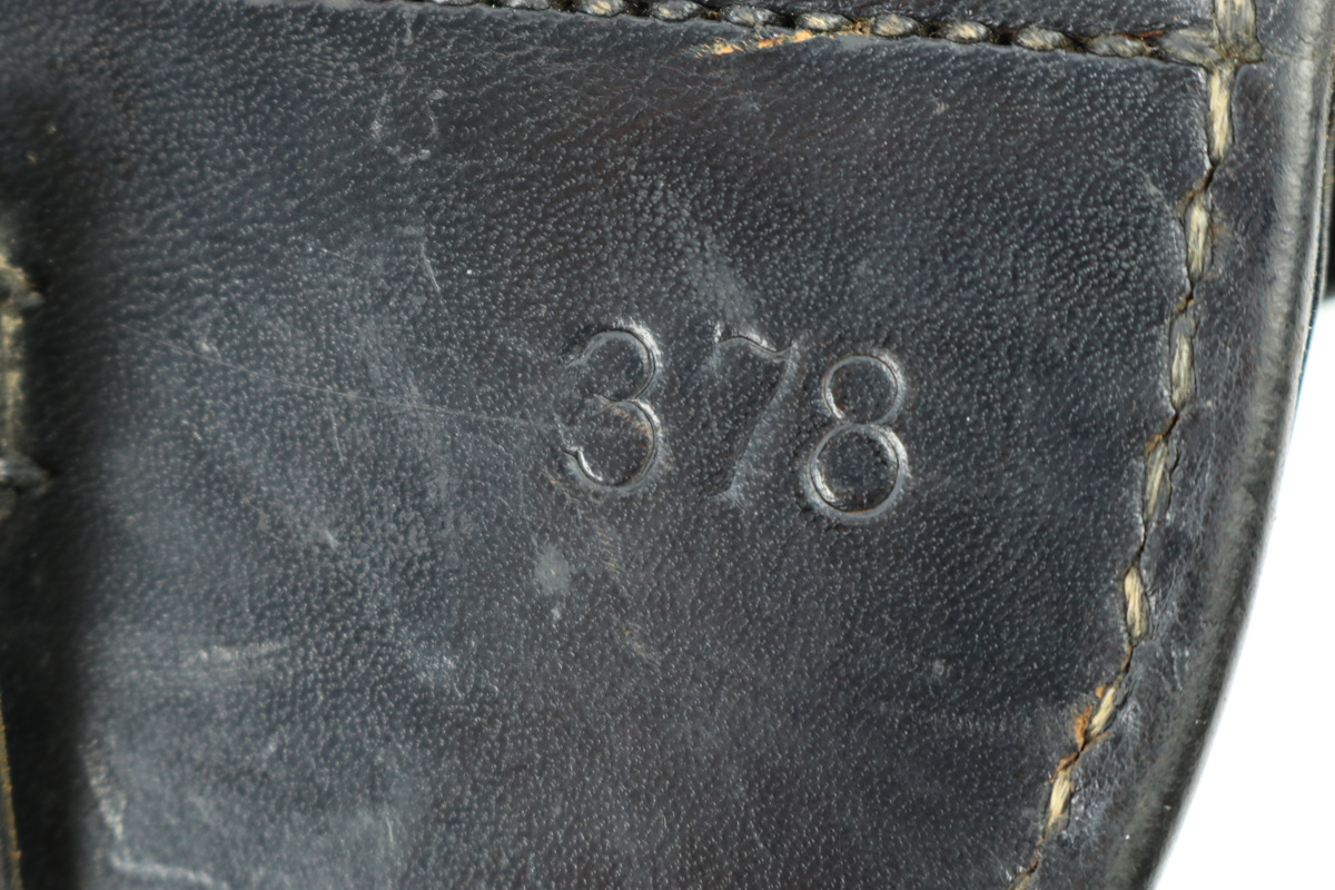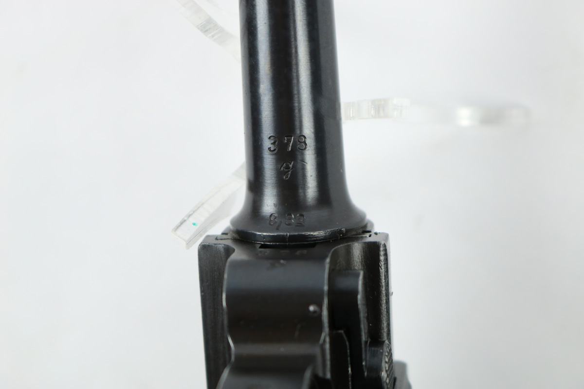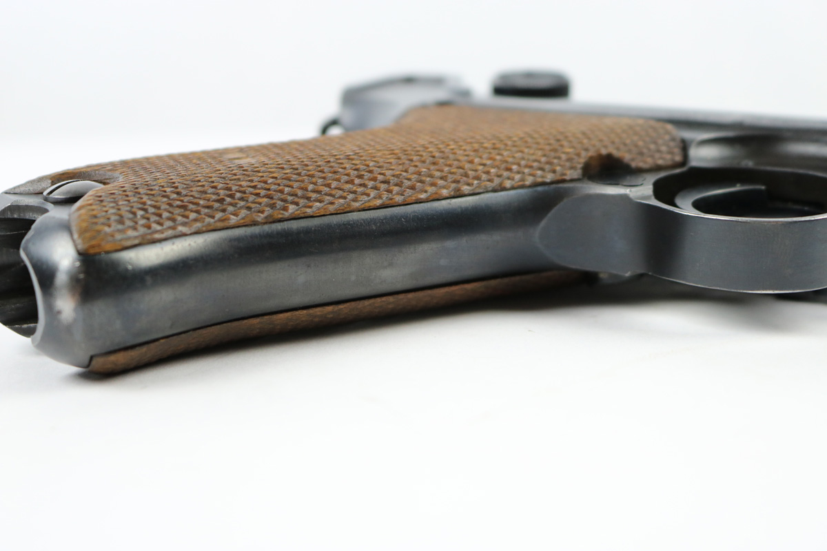 9/26/18 – This is a very interesting an unique 1918 DWM Luger that was later re-issued to the Police after WW1. The pistol comes with an original matching numbered magazine, matching numbered holster, and matching numbered tool. The holster and tool were likely unit stamped after the pistol was received and reworked (with the sear safety) in the police armory. The pistol is in great shape with some wear on the side plate and light bluing loss on the barrel. The straps are excellent, only showing trace amounts of browning / patina. Overall we rate at about 96% condition. The bore is excellent with minimal wear – a 9 out 10 overall. The grps are marked on the interior with “78” and the magazine has a small scuff mark, but ends in number “78” as well (matching from what we can see). The holster and tool are in great shape – the holster has been embellished with uniform emblems. Guaranteed all original and authentic.