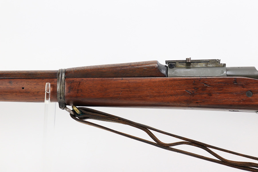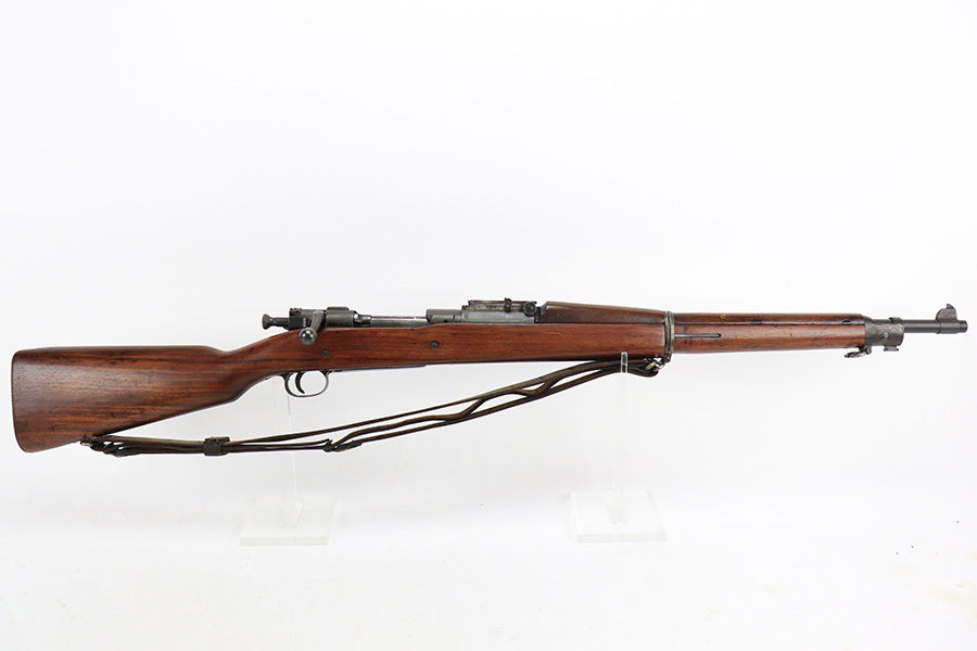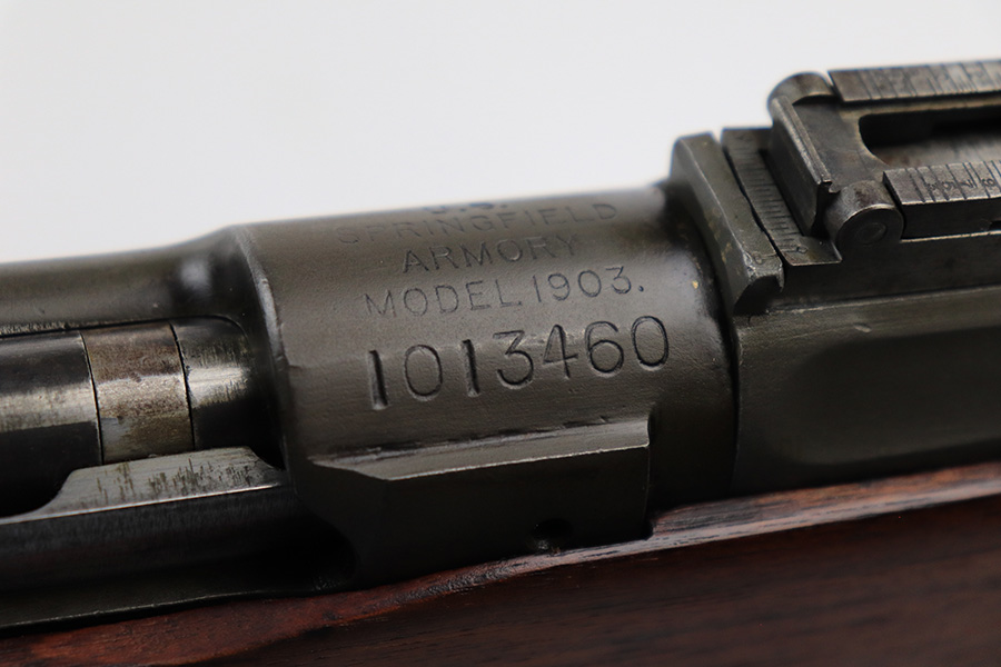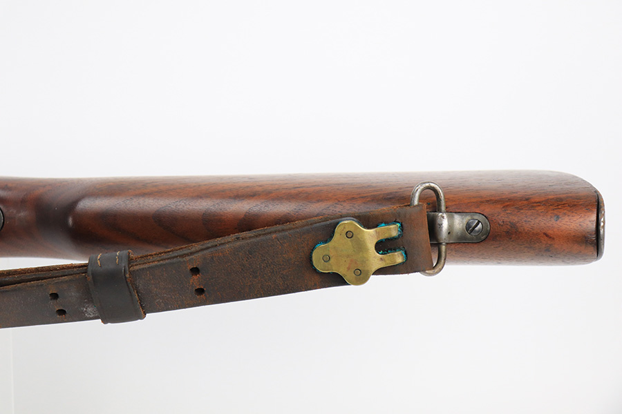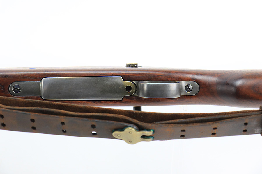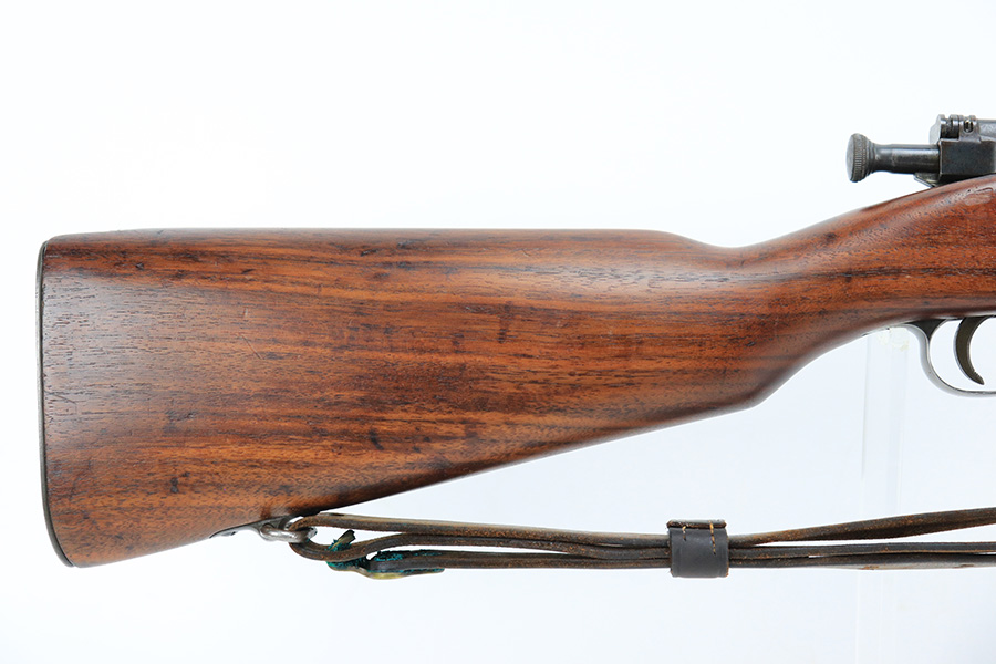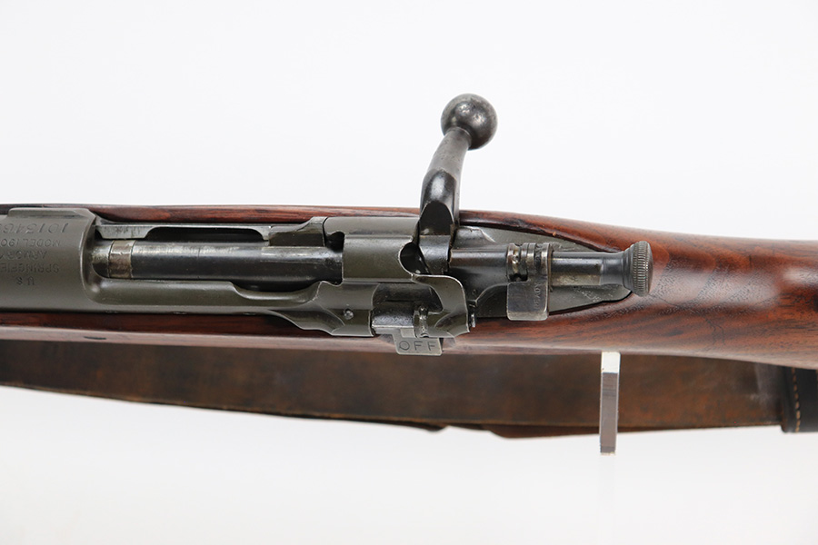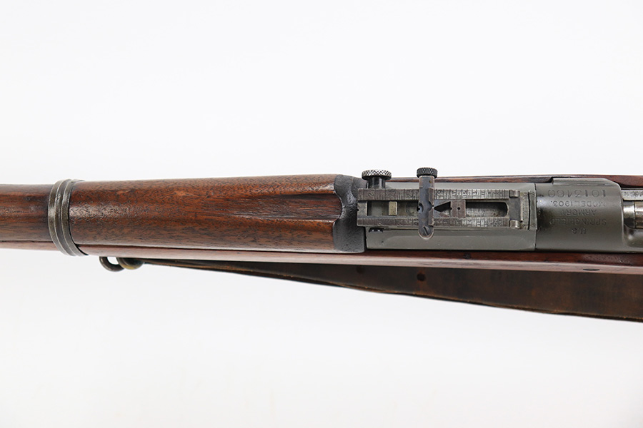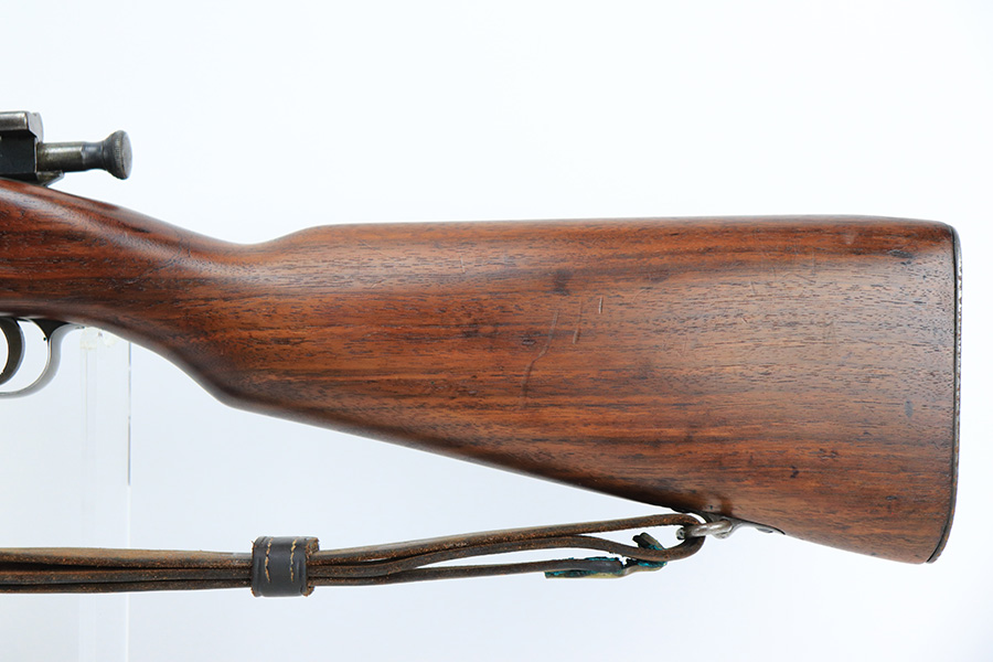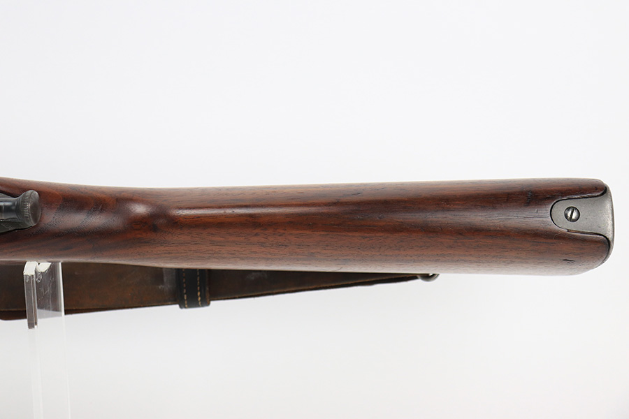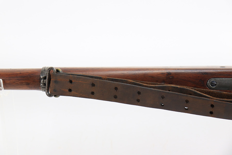 6/13/23 – This is an excellent example of a Springfield Model 1903 issued to the US military during WW1. The receiver dates to 1918. The barrel is also Springfield marked and dates to November of 1918. The wood stock is un-marked and was either sanded or replaced. The left side of the receiver has been tapped with 3 screw holes to receive an original Warner Swasey scope. The metal parts have retained about 95% of their parkerized finish with some thinning on the floor plate / trigger group and some dark discoloration on the receiver. Some spotty oxidation on the butt plate. Excellent wood stock. The rifling in the bore is slightly worn with some minor pitting here and there. Comes with a nice leather sling.