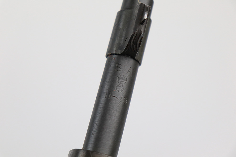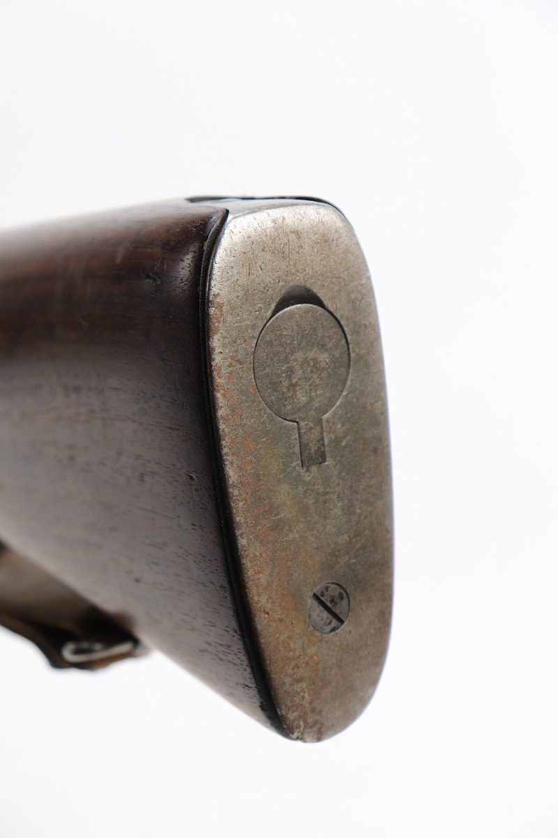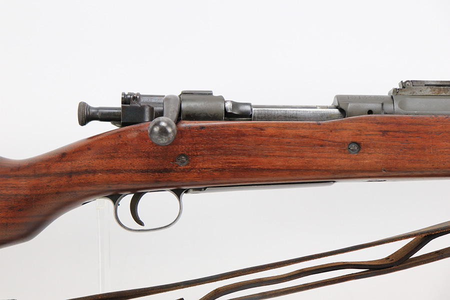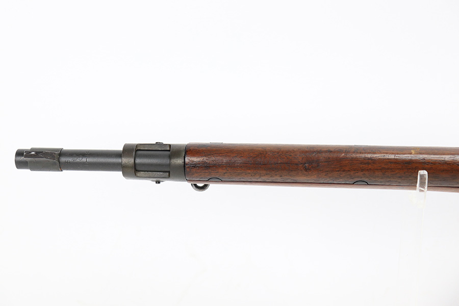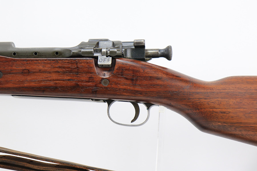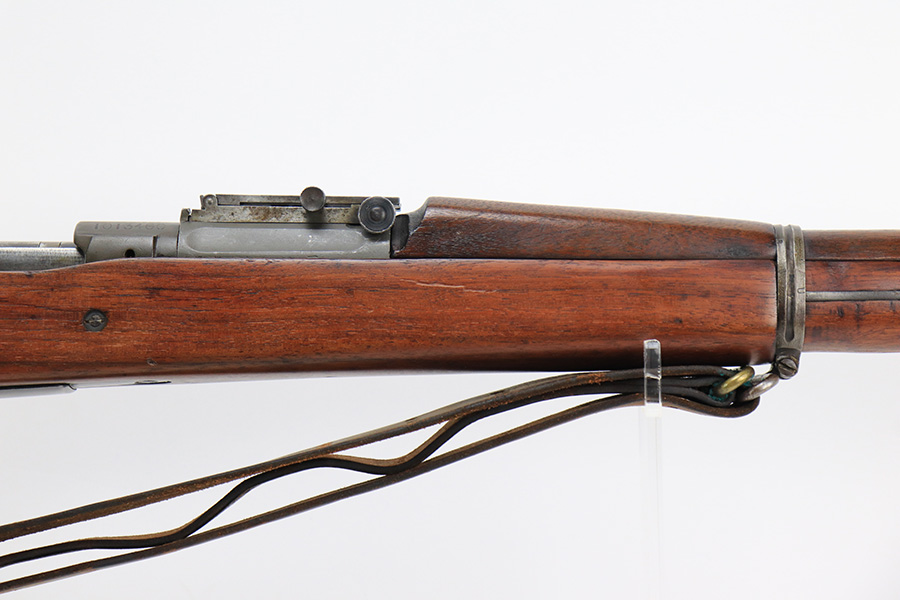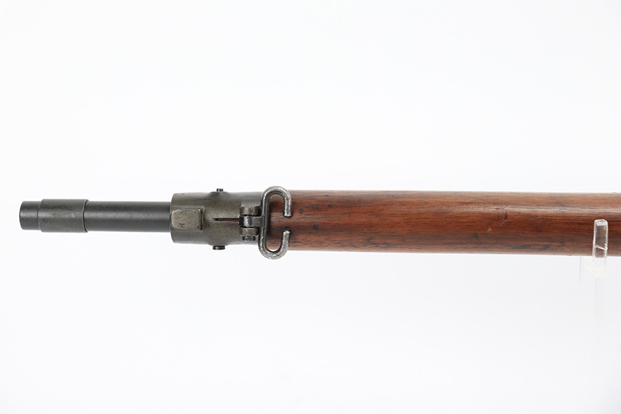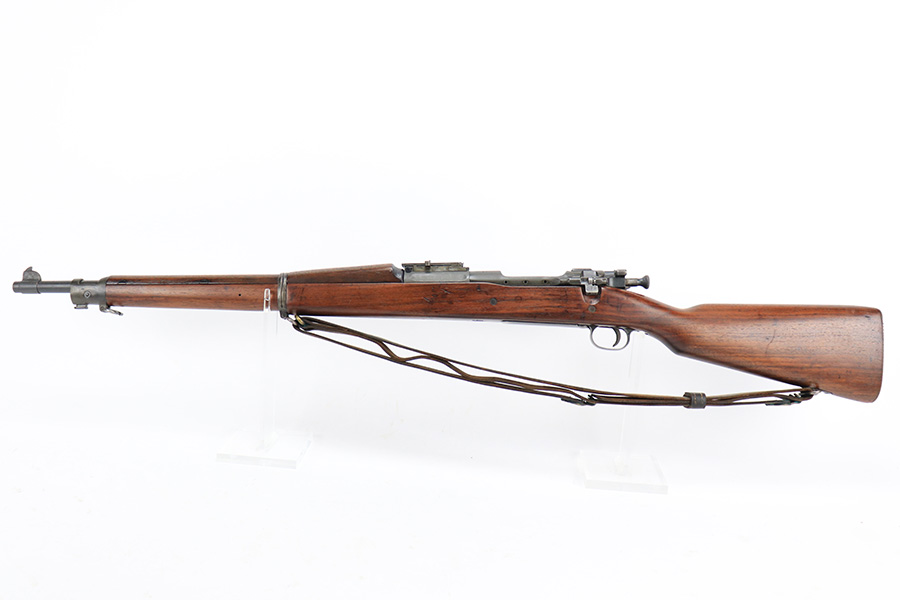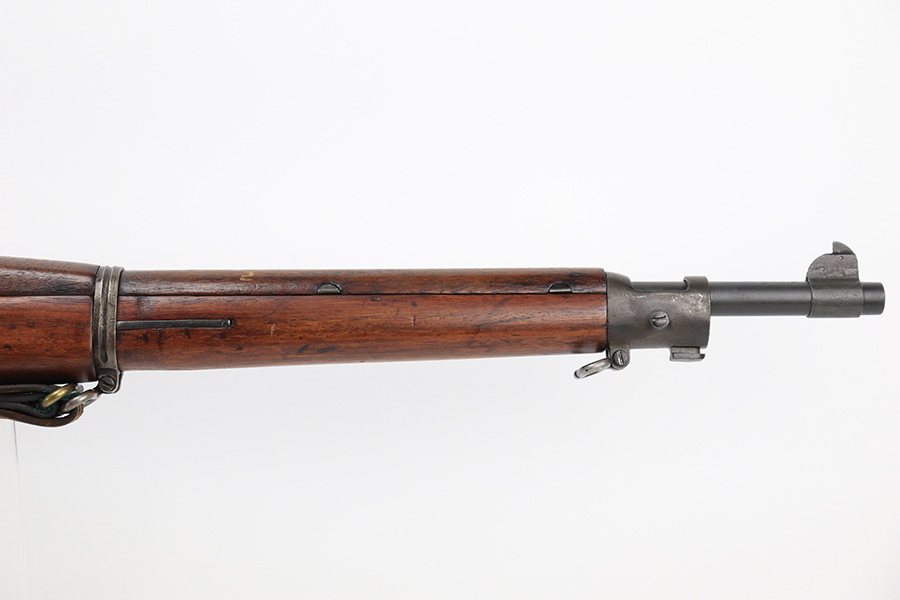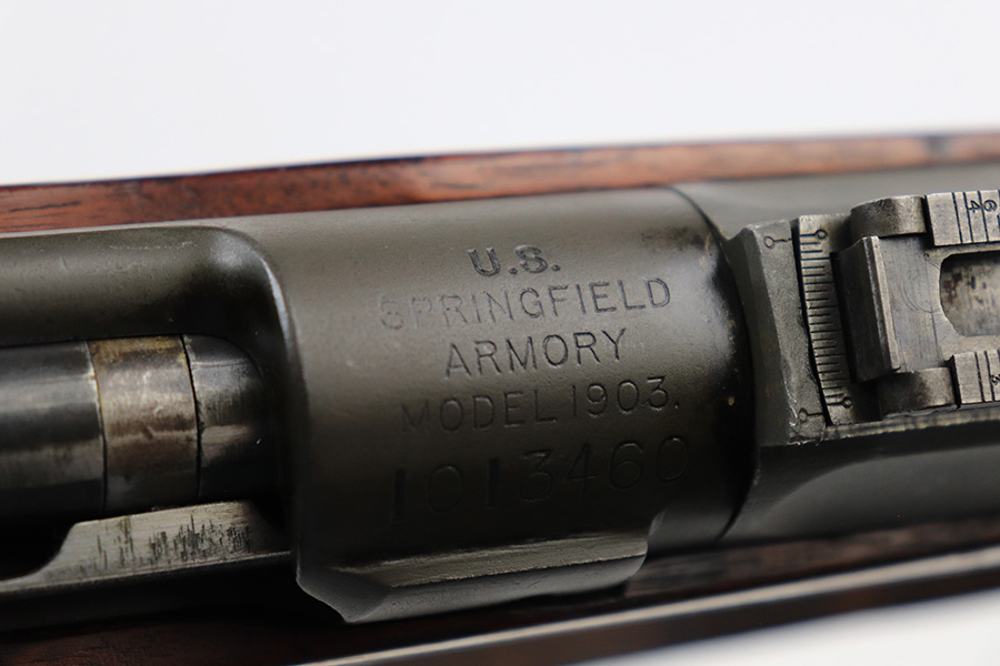 6/13/23 – This is an excellent example of a Springfield Model 1903 issued to the US military during WW1. The receiver dates to 1918. The barrel is also Springfield marked and dates to November of 1918. The wood stock is un-marked and was either sanded or replaced. The left side of the receiver has been tapped with 3 screw holes to receive an original Warner Swasey scope. The metal parts have retained about 95% of their parkerized finish with some thinning on the floor plate / trigger group and some dark discoloration on the receiver. Some spotty oxidation on the butt plate. Excellent wood stock. The rifling in the bore is slightly worn with some minor pitting here and there. Comes with a nice leather sling.