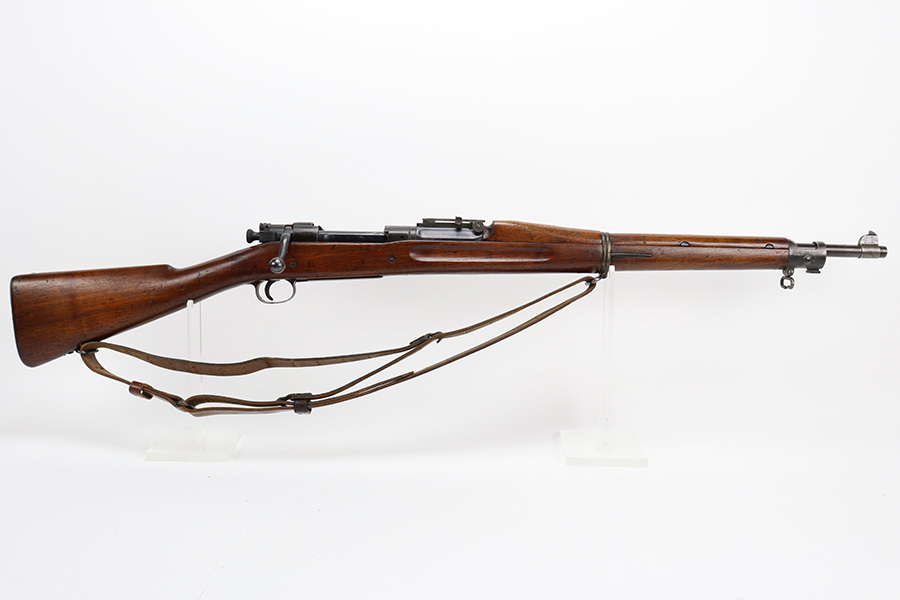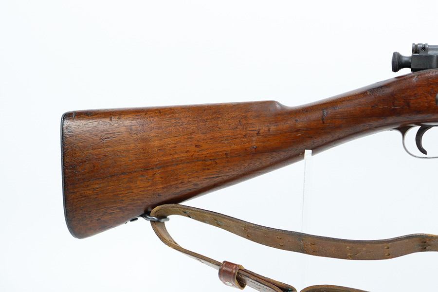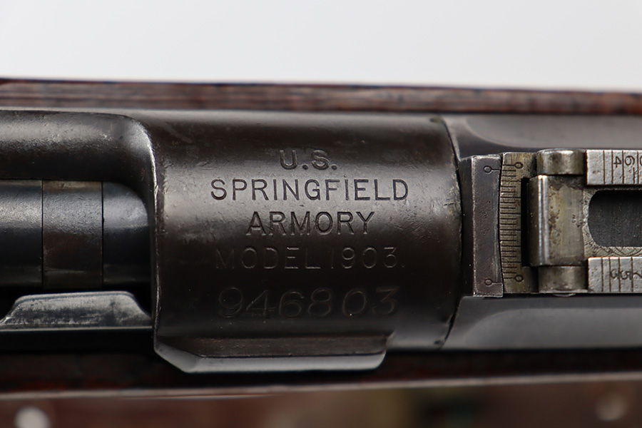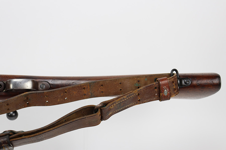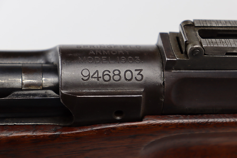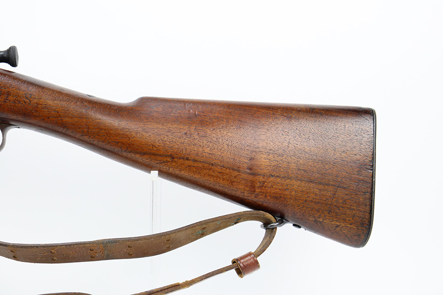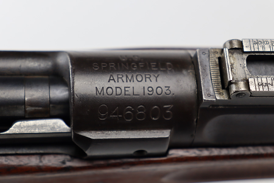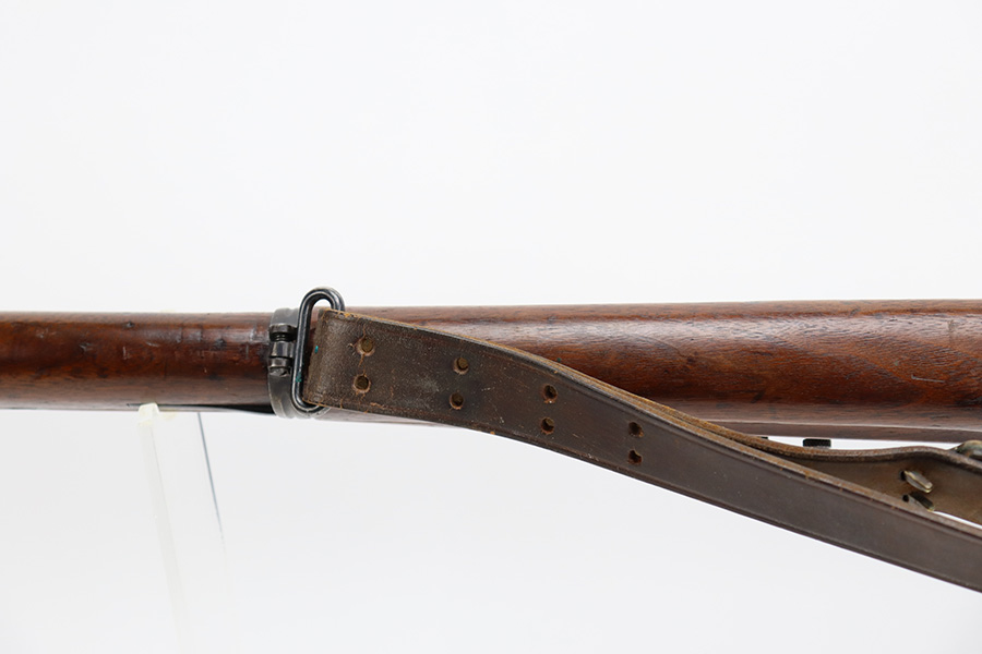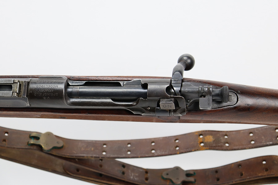 7/10/23 – This is a very nice example of a Springfield Model 1903 issued to the US military during WW1. The receiver dates to 1918. The barrel is also Springfield marked and dates to June of 1918. The left side of the wood stock has “JFC” inspection initials and what looks like an arsenal rework stamp. The metal parts have retained 80% of their finish. The majority of the wear is around the muzzle and along the barrel. Scratchy wear on the front barrel band. Obvious finish loss and brown patina on the floor plate and trigger guard. No major damage to the wood furniture, but there are minor scratches and bruises throughout. Comes with a nice leather sling. The bore has pretty good rifling, but there is some spotty surface oxidation around the muzzle end.