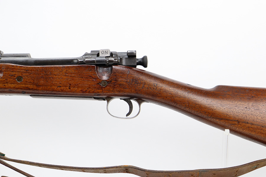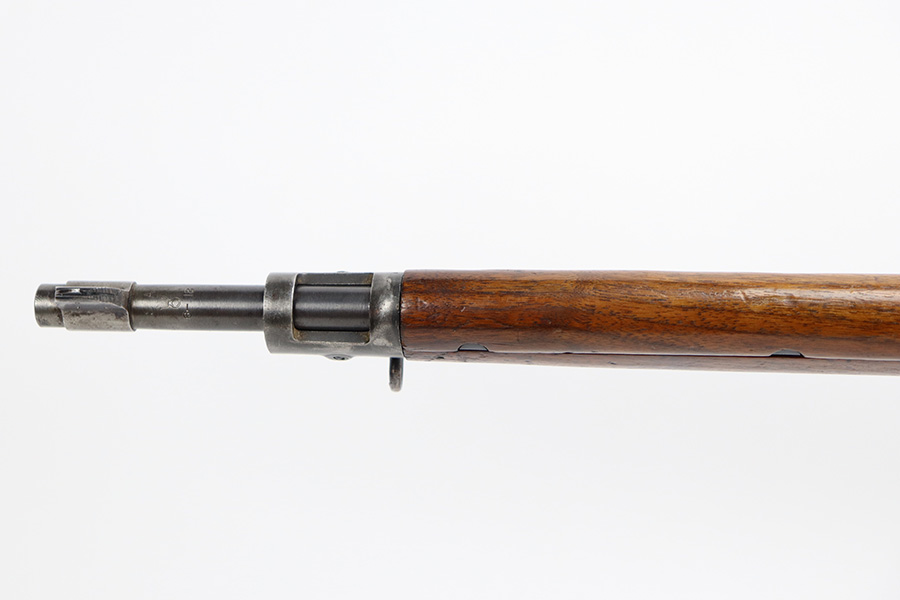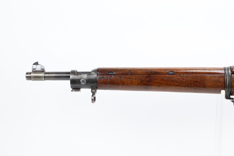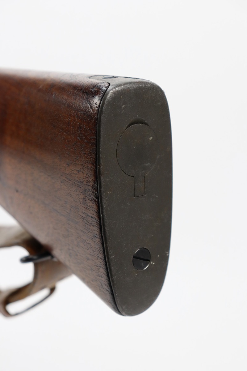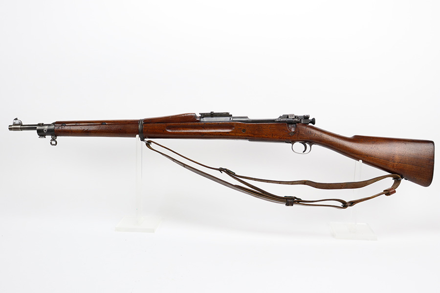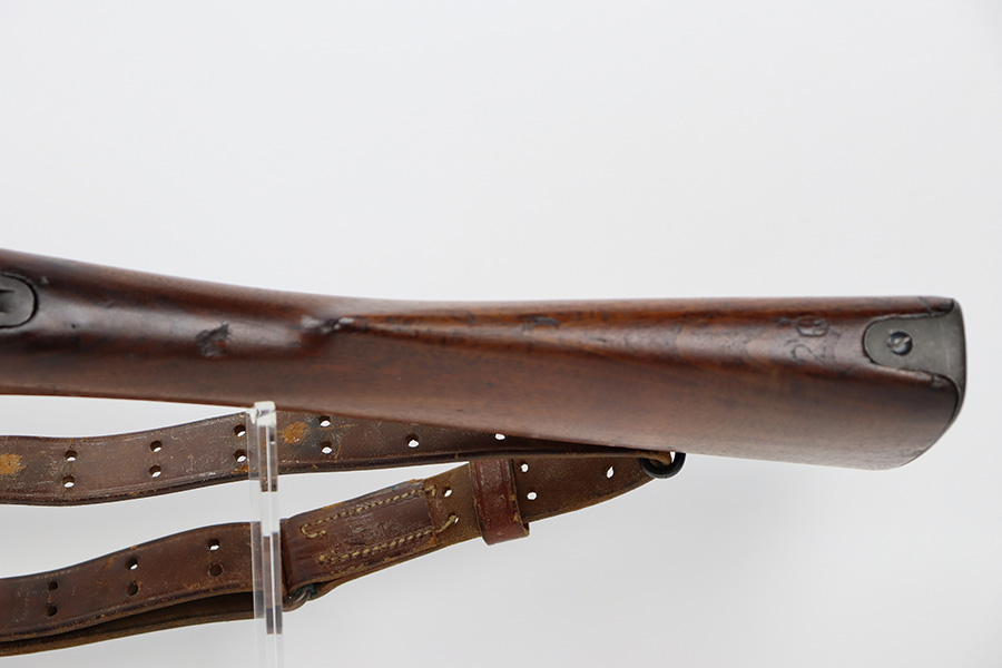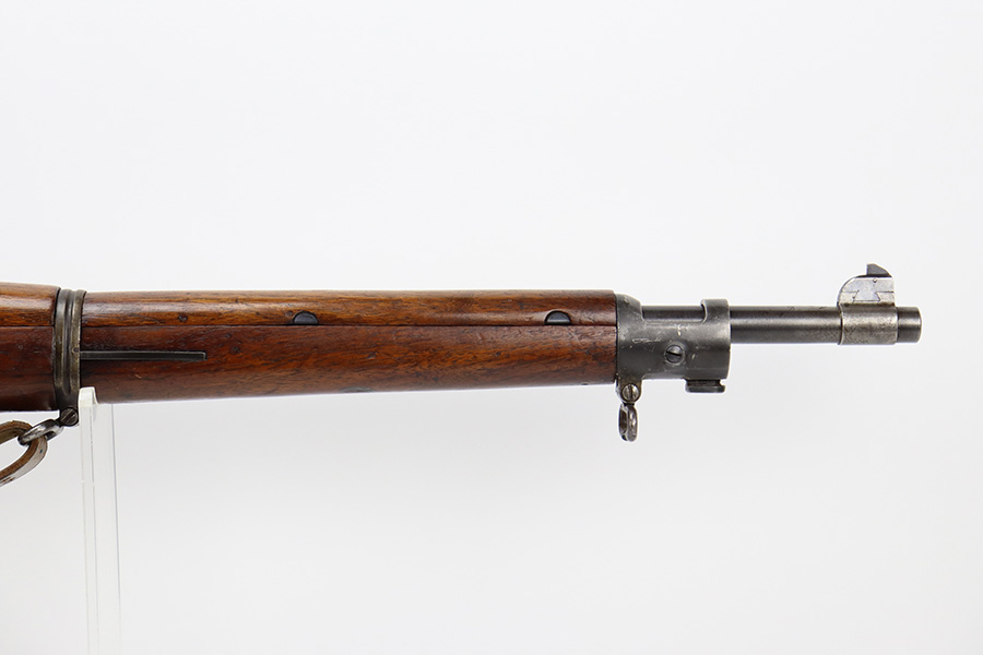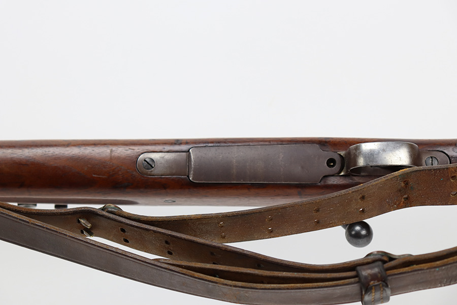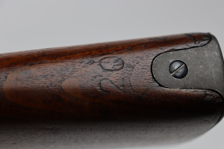 7/10/23 – This is a very nice example of a Springfield Model 1903 issued to the US military during WW1. The receiver dates to 1918. The barrel is also Springfield marked and dates to June of 1918. The left side of the wood stock has “JFC” inspection initials and what looks like an arsenal rework stamp. The metal parts have retained 80% of their finish. The majority of the wear is around the muzzle and along the barrel. Scratchy wear on the front barrel band. Obvious finish loss and brown patina on the floor plate and trigger guard. No major damage to the wood furniture, but there are minor scratches and bruises throughout. Comes with a nice leather sling. The bore has pretty good rifling, but there is some spotty surface oxidation around the muzzle end.