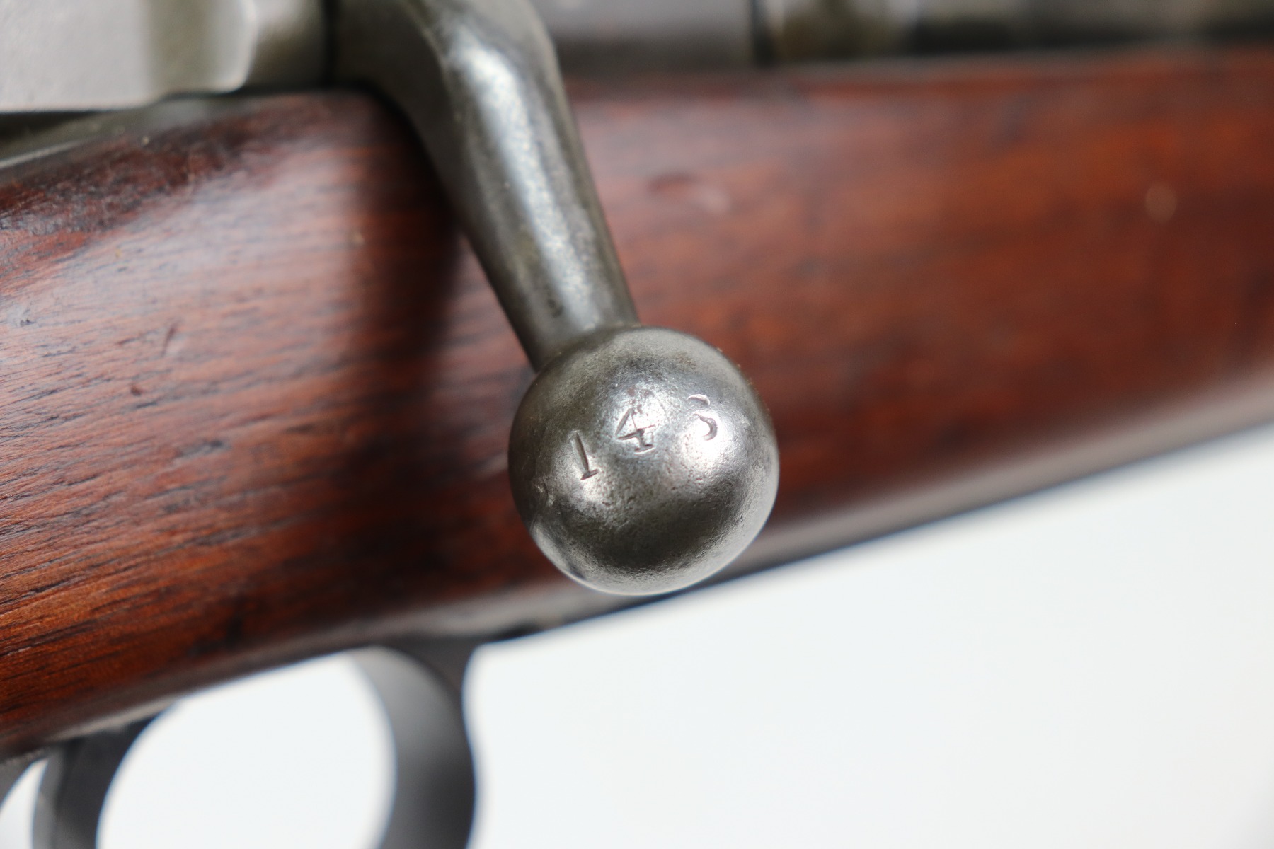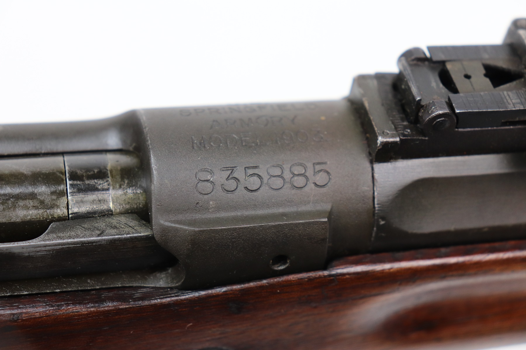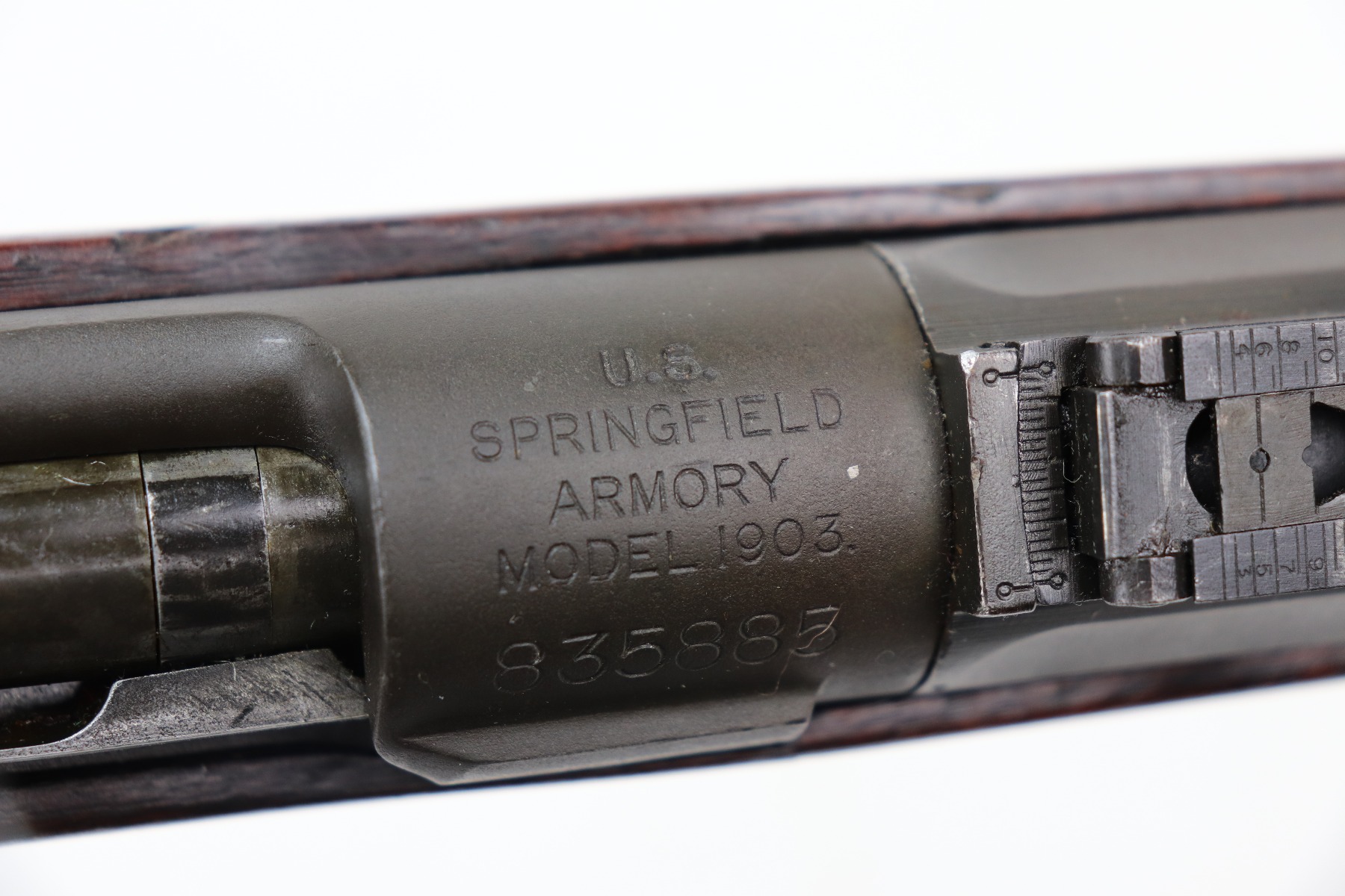 3/26/21 – This is an excellent example of a Springfield Model 1903 Rifle issued to the US military during WW1. The receiver dates to 1918 and the barrel is dated October of 1918. The gun is in excellent condition, but it we believe it was refinished. There is wear on the barrel bands, top of the receiver, and on the bolt. The stock has a very faint proof on the wrist. We believe it was lightly sanded. It is in nice condition with minor dings and scratches throughout. The bore is excellent – shiny with strong rifling.