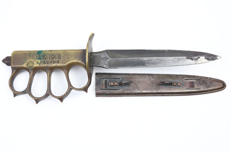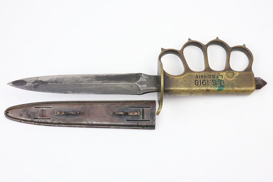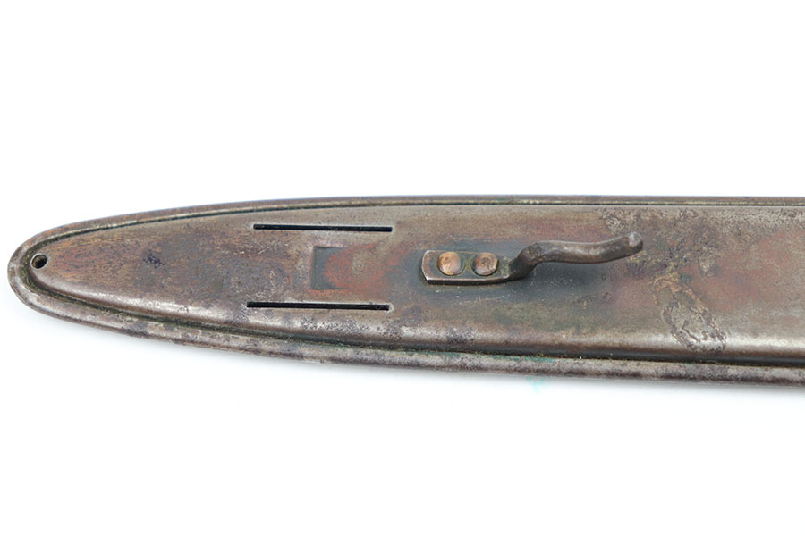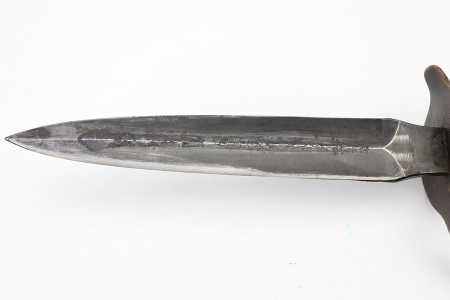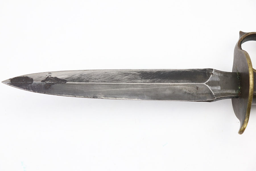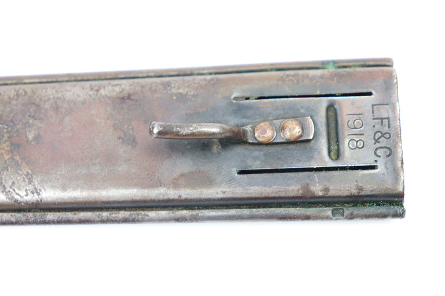 1/27/21 – This is a WW1 production trench fighting knife made by L.F.&C. in 1918. Comes with a sheath in seldom seen condition. The sheath still has both of the original hooks in tact, and is strongly stamped with a maker and date stamp. There’s browning patina and discoloration throughout, but that’s expected from these 100+ year old knives. The blade is in great shape considering its’ age and doesn’t show signs of sharpening. The handle still has some faint remnants of the original black finish.