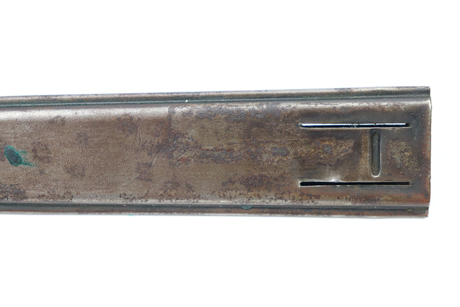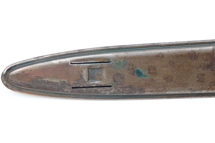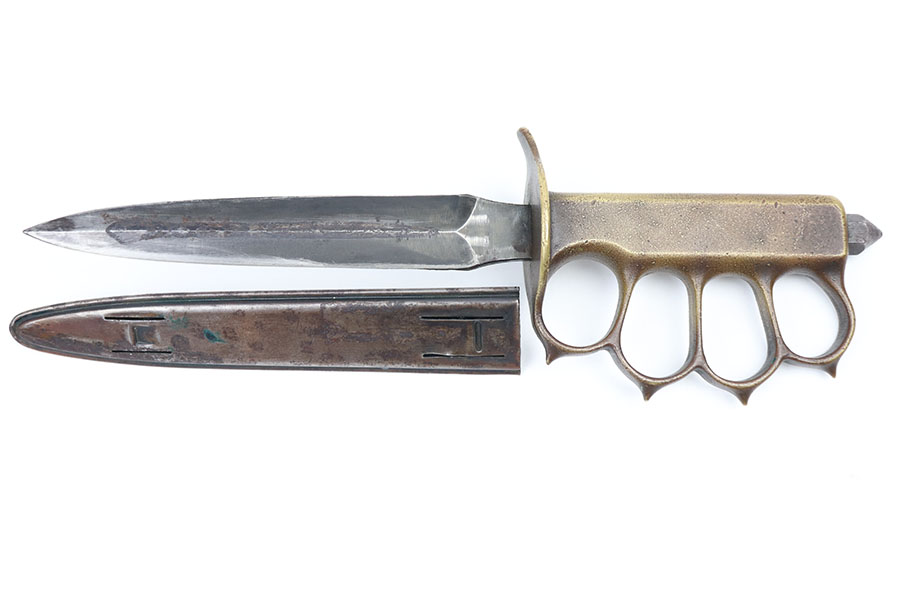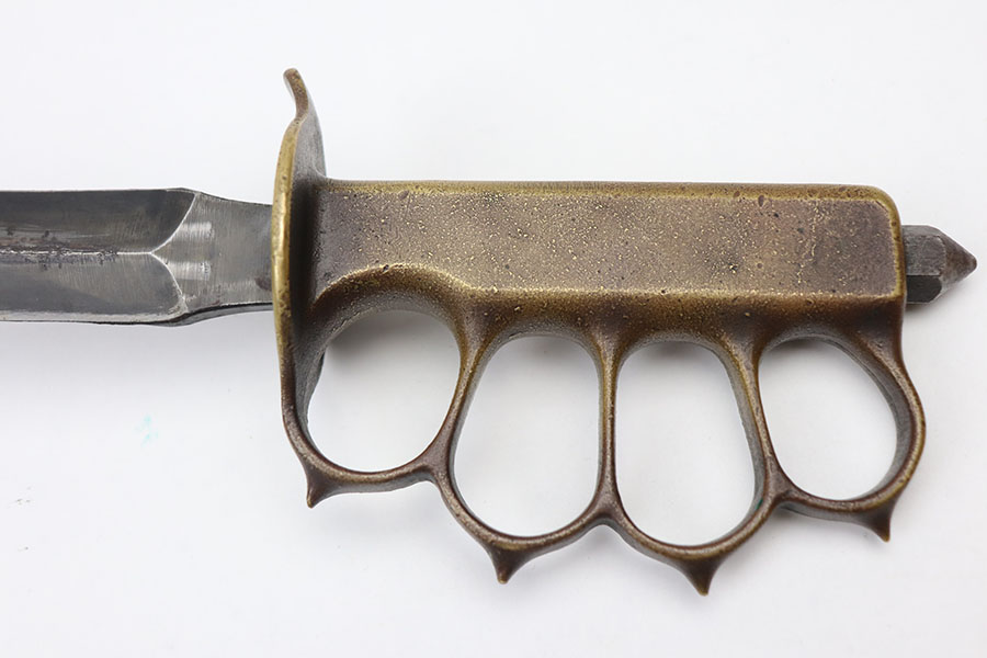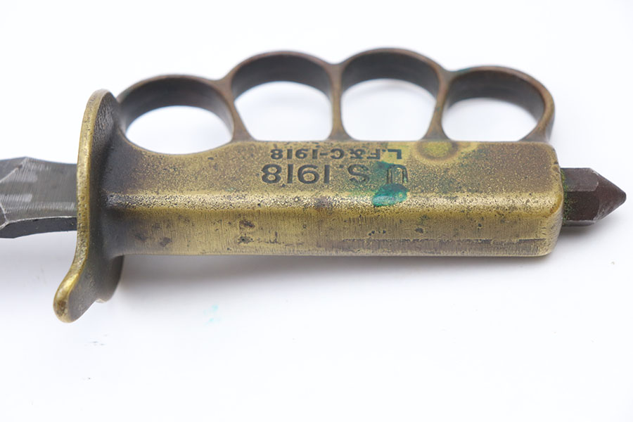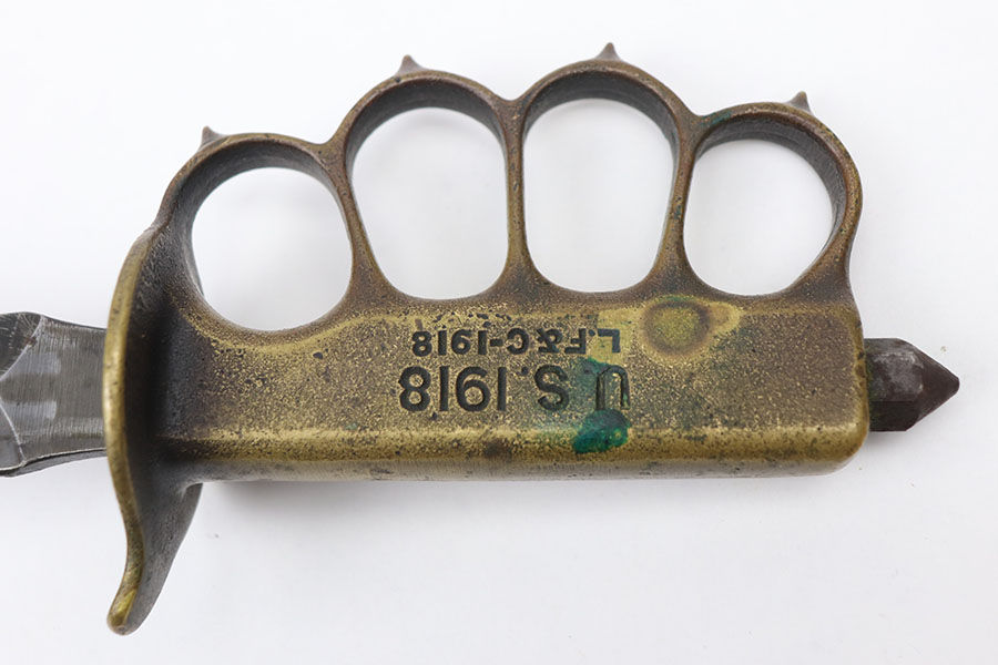1/27/21 – This is a WW1 production trench fighting knife made by L.F.&C. in 1918. Comes with a sheath in seldom seen condition. The sheath still has both of the original hooks in tact, and is strongly stamped with a maker and date stamp. There’s browning patina and discoloration throughout, but that’s expected from these 100+ year old knives. The blade is in great shape considering its’ age and doesn’t show signs of sharpening. The handle still has some faint remnants of the original black finish.