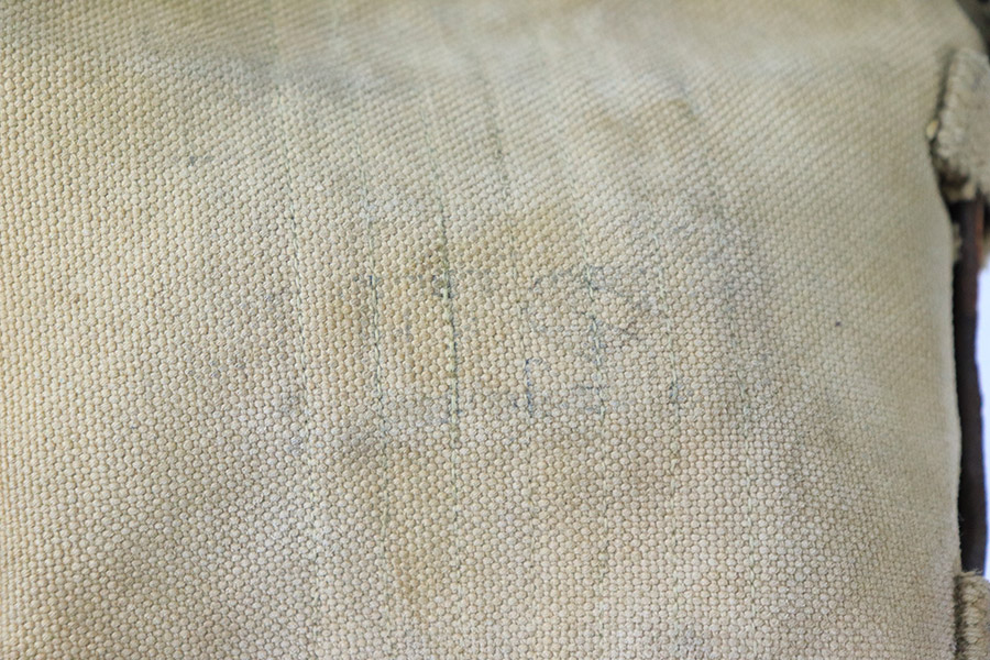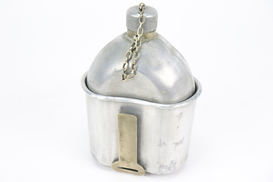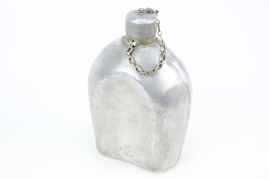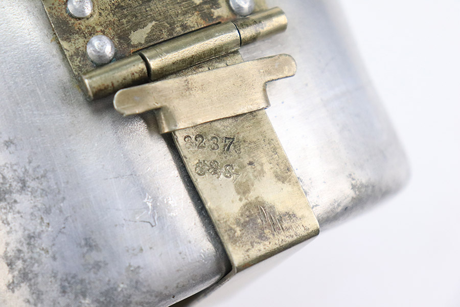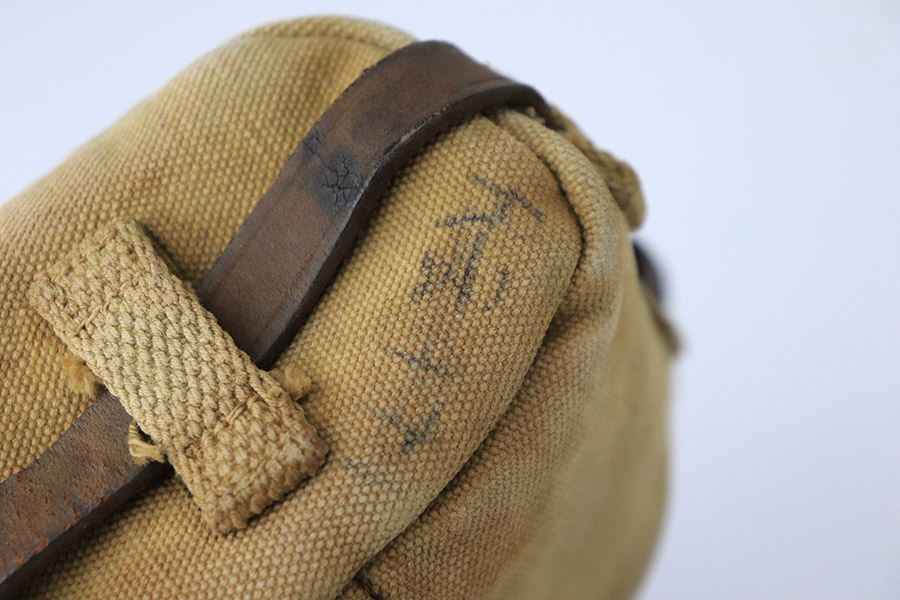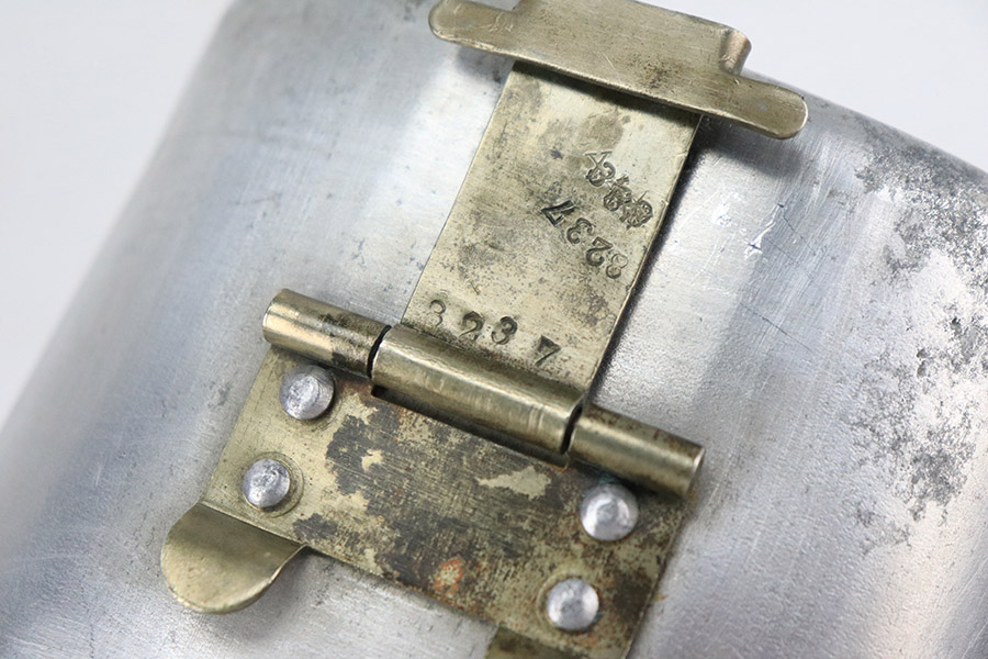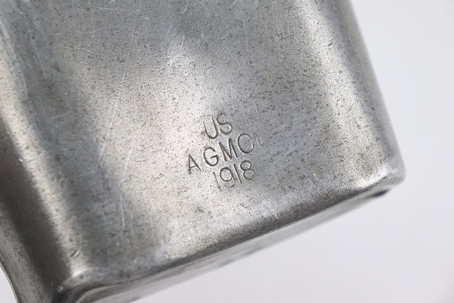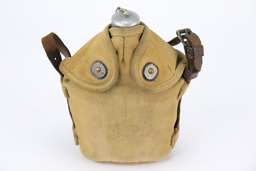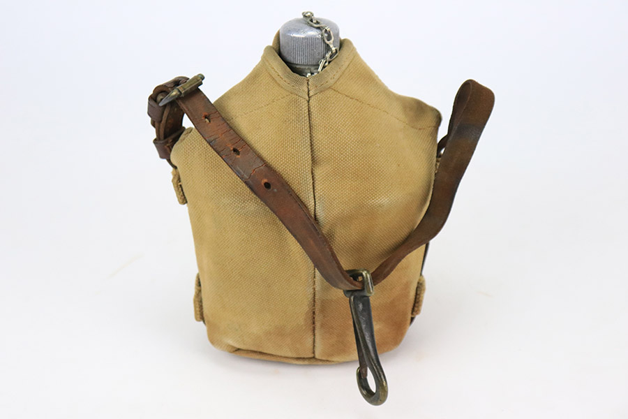 11/3/22 – This is an original WW1 US canteen with a leather carry strap and hanging clip. Remarkably, the leather is all original and intact with some mild surface cracking and a few scratches but no major issues. The canvas exterior cover has a faint US ink stamp on the front and some mild stains on the back. The canteen is dented slightly near the top, but is in great overall condition with a maker marking and date stamp. Cup and carry handle included as shown.
