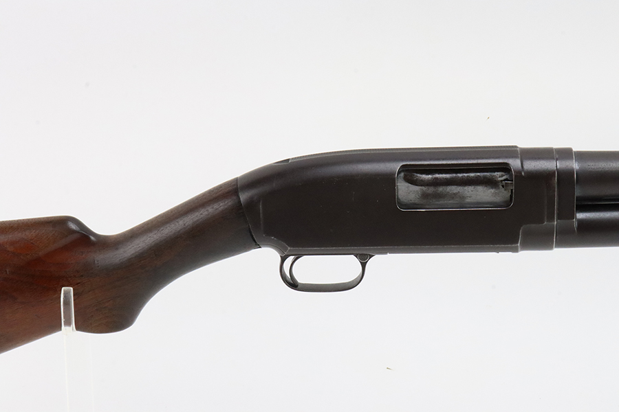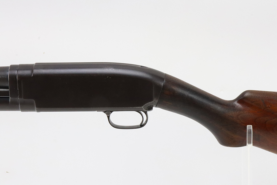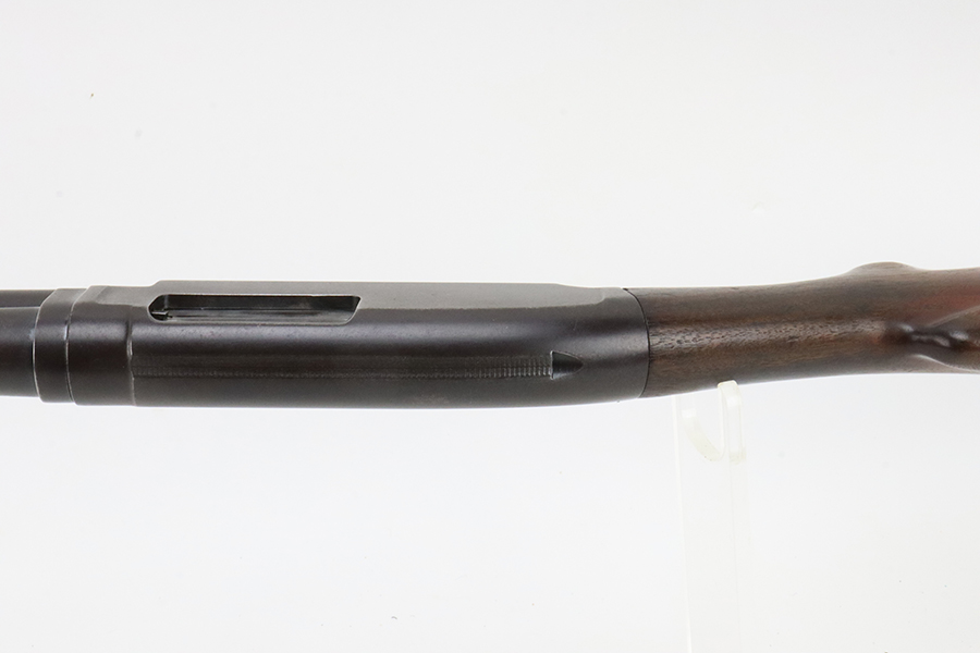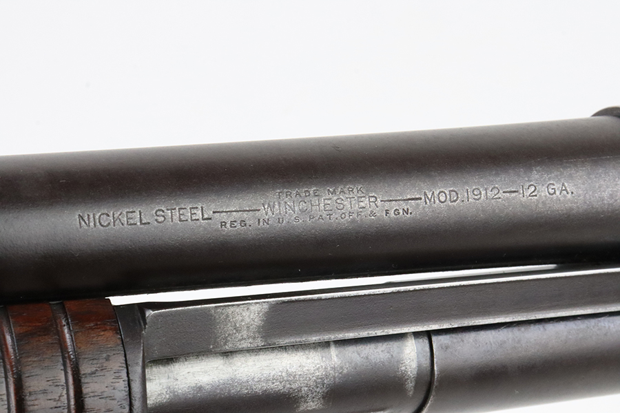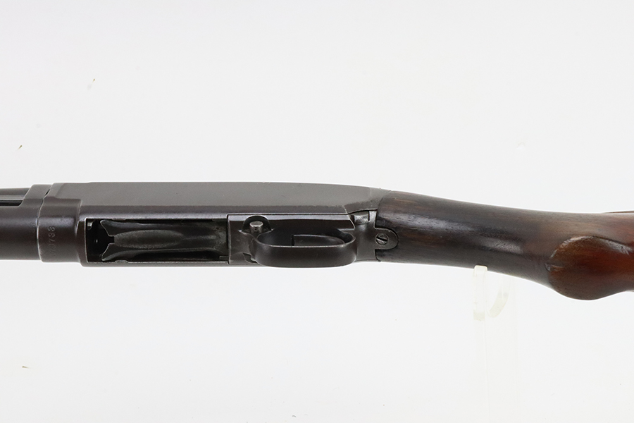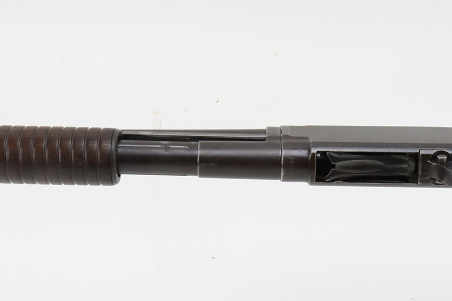 3/11/24 – This is a nice example of a Winchester Model 12 from 1918. It is in a riot configuration with a shorter 19 inch barrel. 14 inch LOP. Chambered in 12 GA. It is all matching and has retained about 90% of its original finish. While there is not much actual finish loss, there is noticeable brown patina under the finish and very light pin-pricking on all of the metal parts. Very nice wood furniture for its age – just light scratches and dings. The bore is in decent condition, but there are small spots of minor pitting throughout. Nice action.