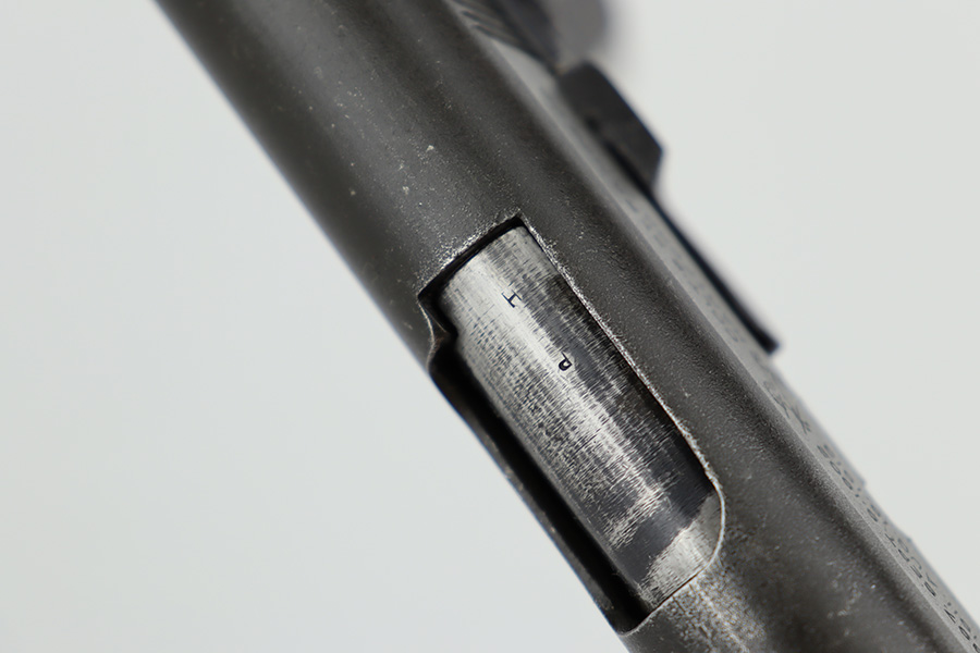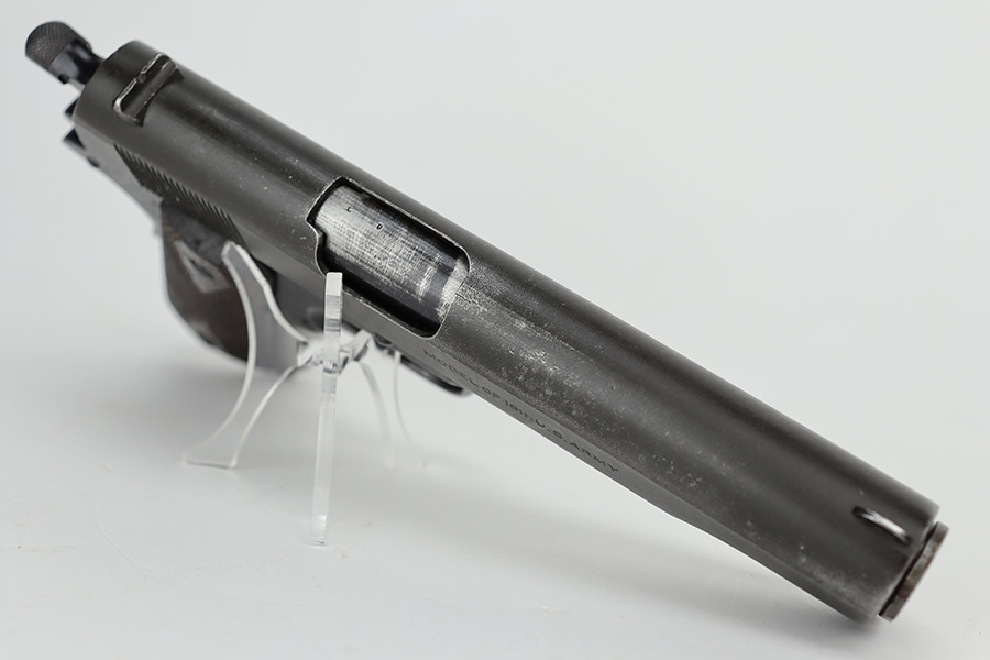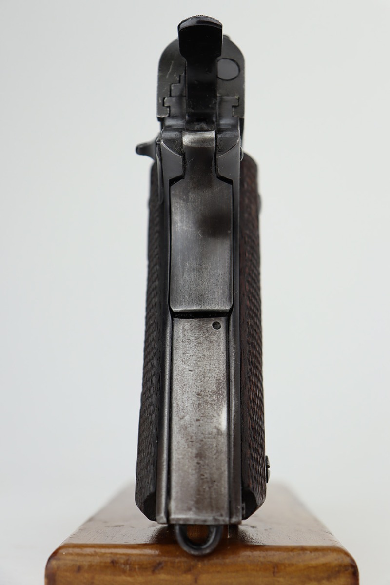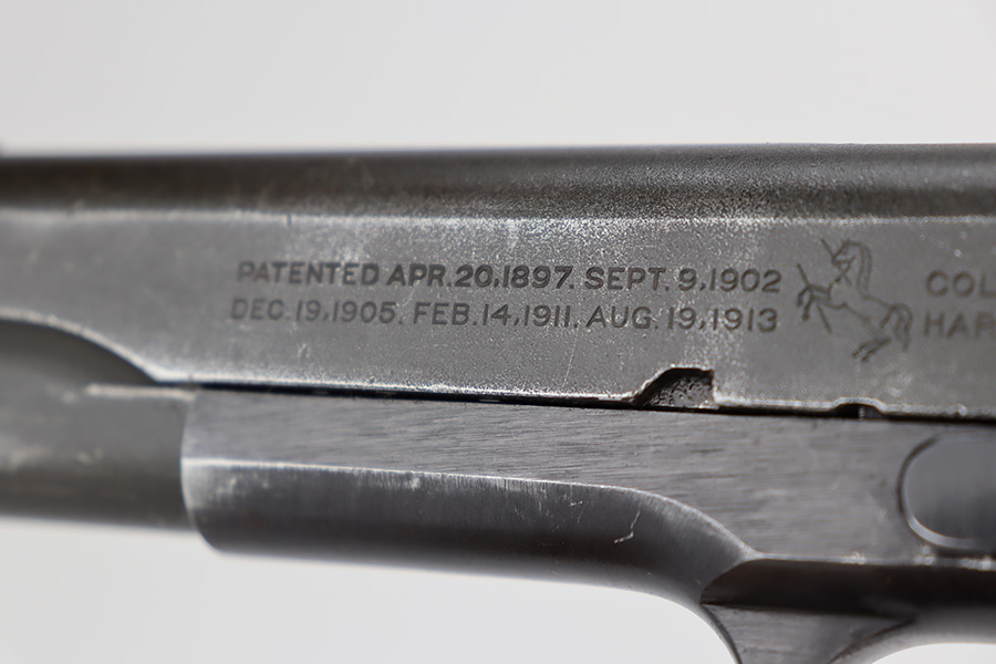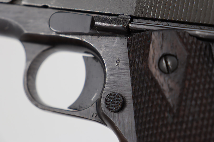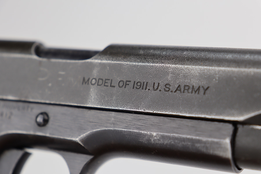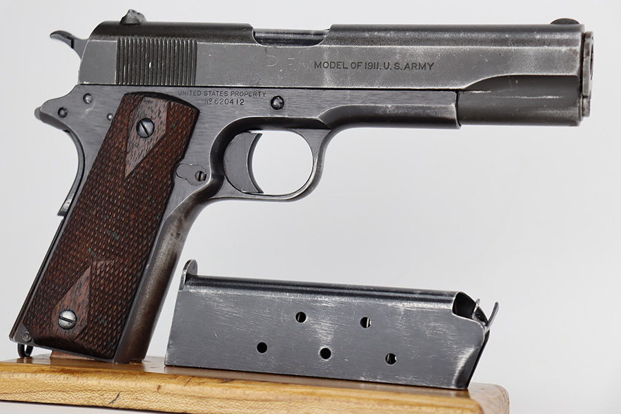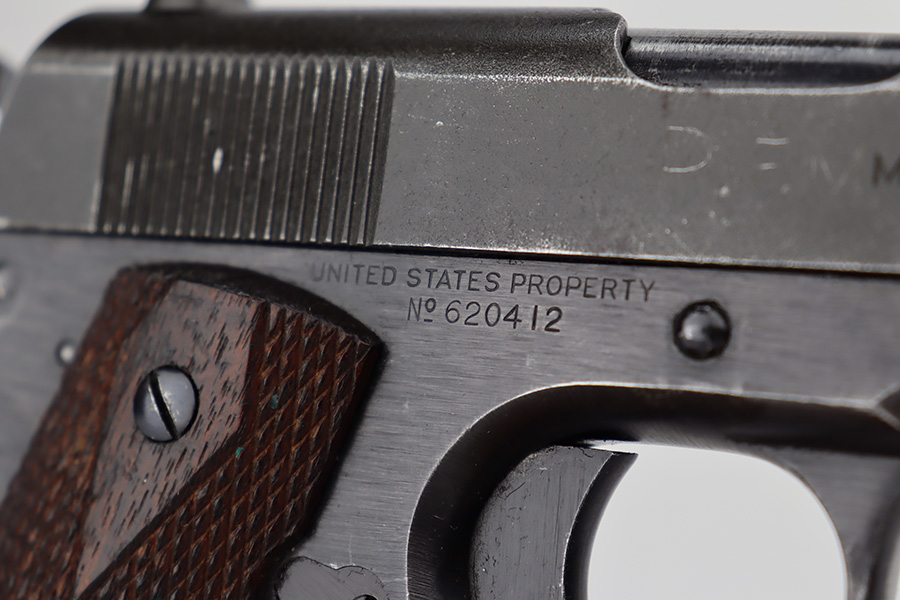 6/21/23 – This is a nice example of a Colt Model 1911 issued to the US military in 1919. It is “United States Property” marked and has an “Eagle Head 4” military acceptance proof. Period-correct “H P” barrel. Unfortunately, the slide has been parkerized, and the initials “R.F.M.” are lightly scratched onto the right side. It has retained roughly 75% of its finish. The majority of the wear is on the grip straps, but there is also wear around the muzzle and along the high edges of the slide. Fitted with very nice wood grips and comes with a WW2-era “R” marked magazine. Very nice bore with great rifling.