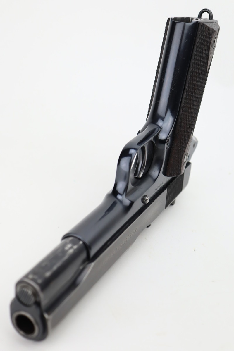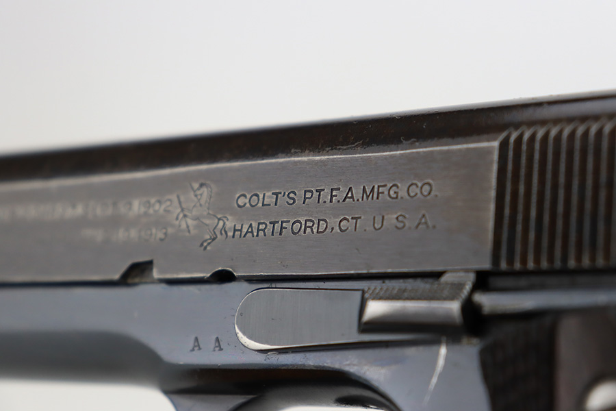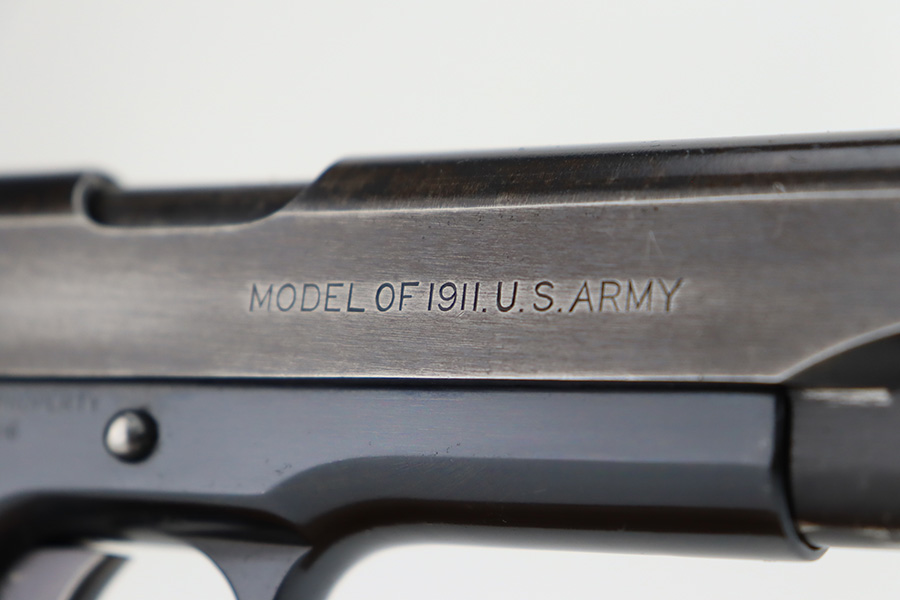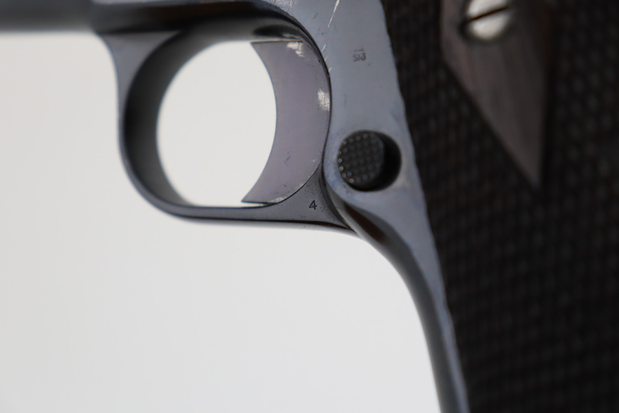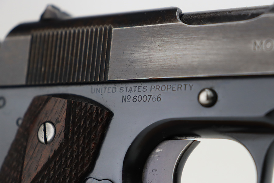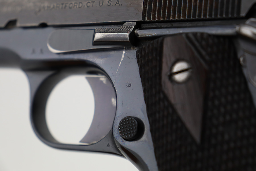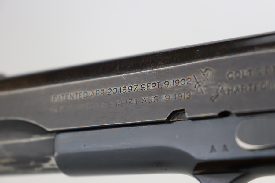 12/26/23 – This is a Colt 1911 originally issued to the US military in 1919. It was later reworked at the Augusta Arsenal, as evidenced by the “AA” marking on the left side of the frame. “HP” Colt barrel. The entire frame has been refinished. Noticeable thinning along the slide. Fitted with period-correct wood grips and comes with a proper two-tone magazine. The bore has good rifling, but there is noticeable spotty surface oxidation throughout.