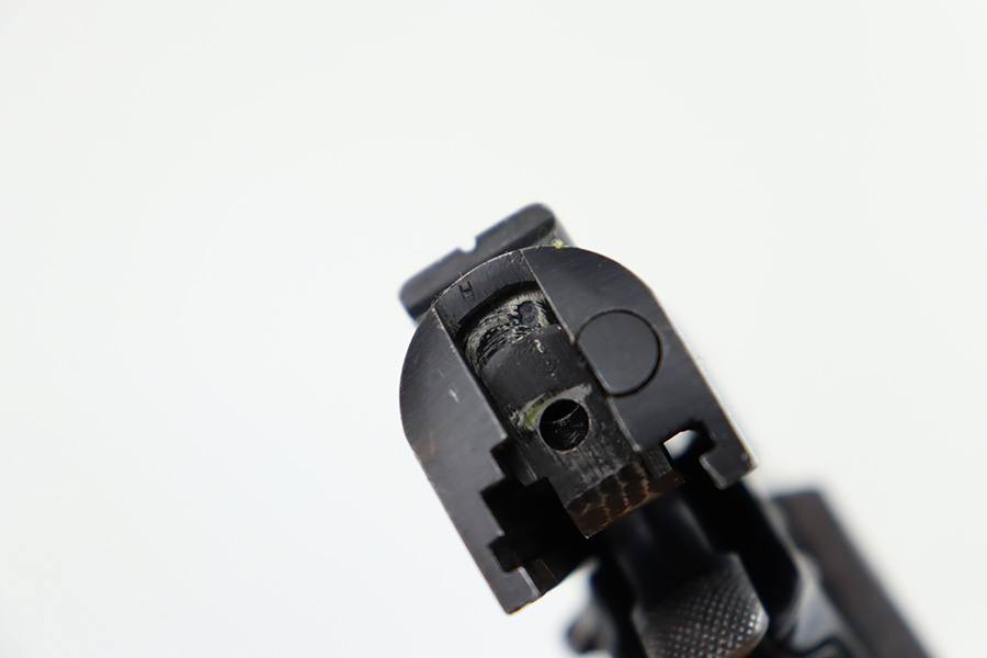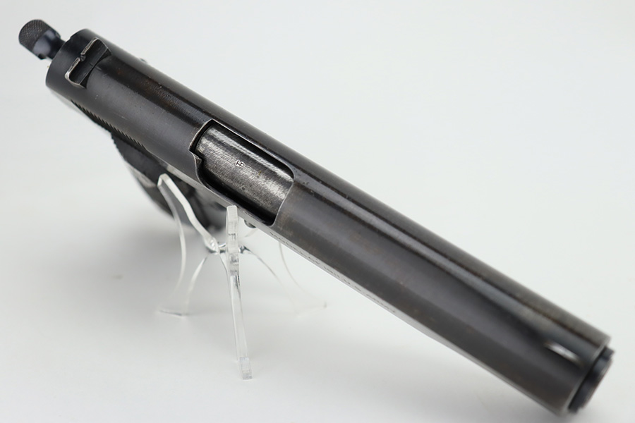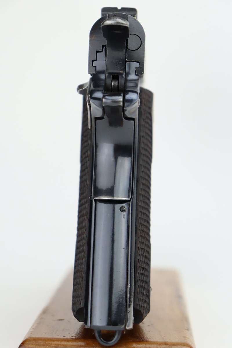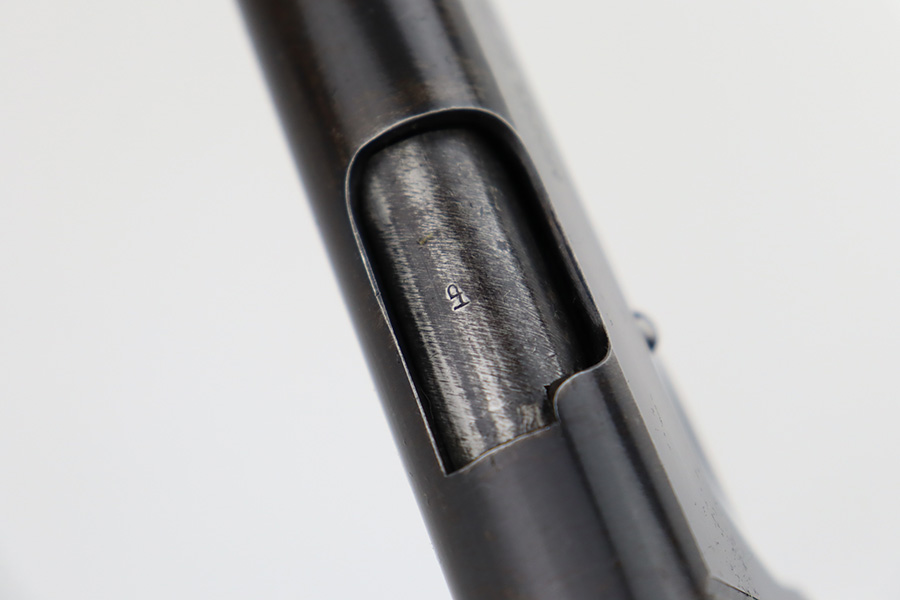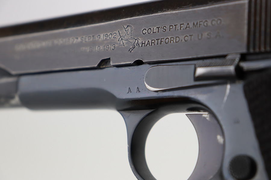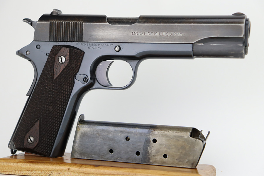 12/26/23 – This is a Colt 1911 originally issued to the US military in 1919. It was later reworked at the Augusta Arsenal, as evidenced by the “AA” marking on the left side of the frame. “HP” Colt barrel. The entire frame has been refinished. Noticeable thinning along the slide. Fitted with period-correct wood grips and comes with a proper two-tone magazine. The bore has good rifling, but there is noticeable spotty surface oxidation throughout.