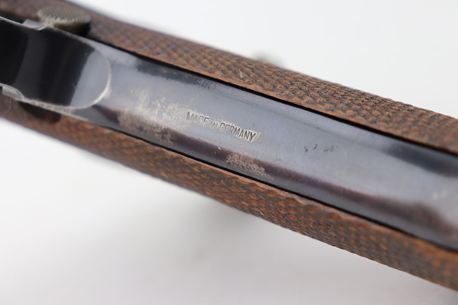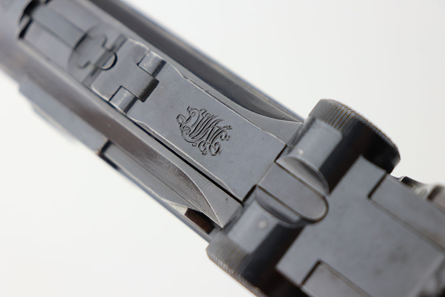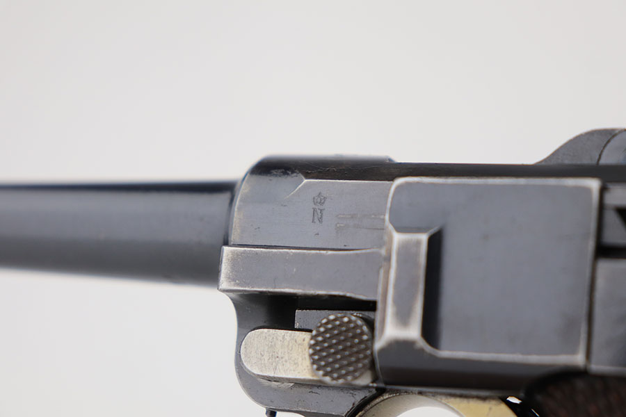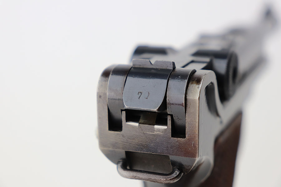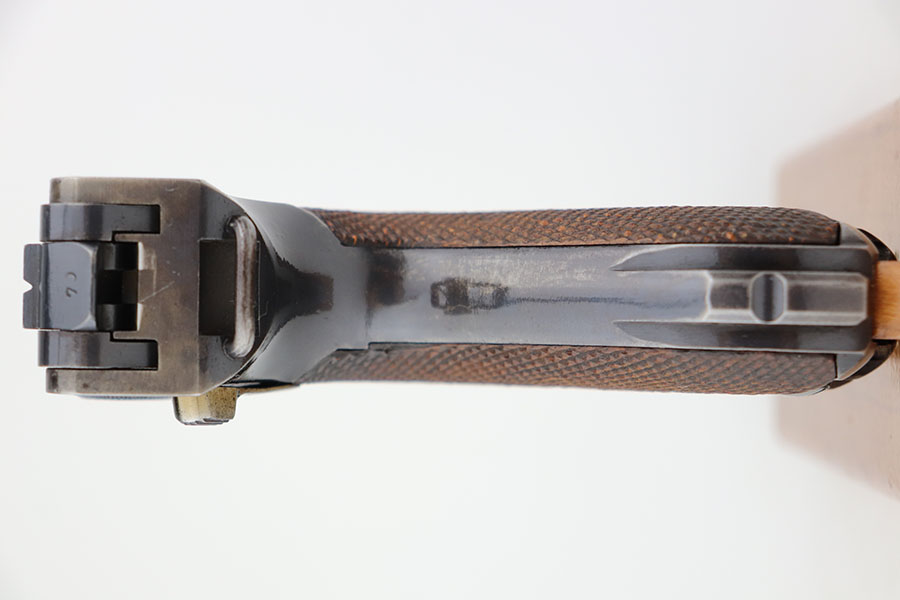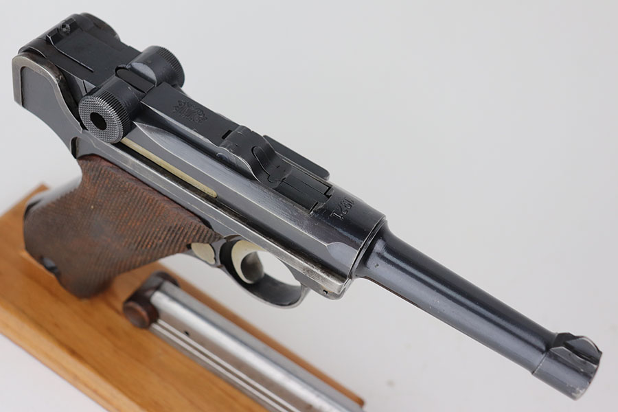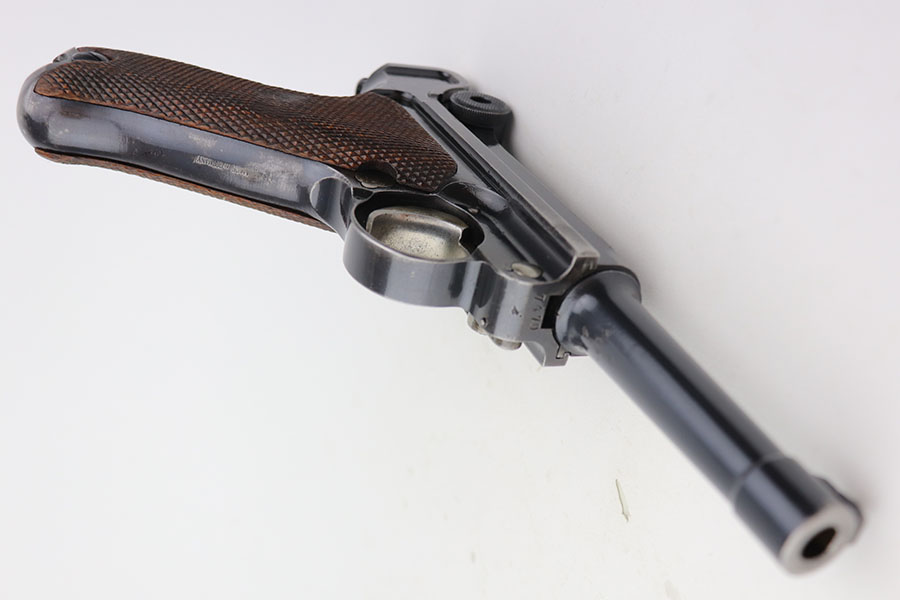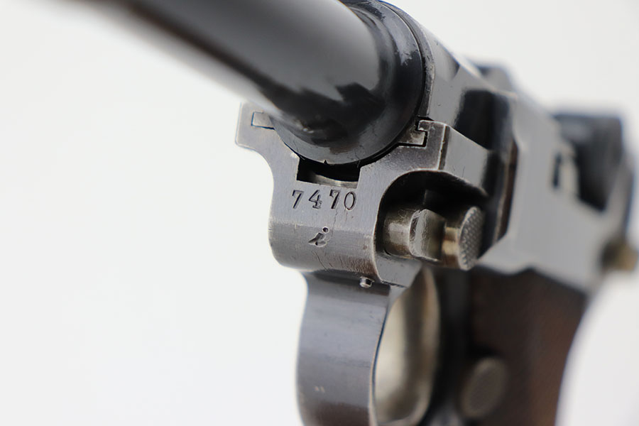 4/23/21 – This is a 1920 model DWM commercial Luger with 1921 arsenal proof over chamber. All matching and original with 85-88% of the blue remaining. Wear on the high edges, sideplate, right side rail and straps. German export marking on front strap. Strong, shiny bore. Excellent strawed small parts. Unmarked grips with no cracks or chips. Period original magazine with ‘GERMANY’ marked wood base.