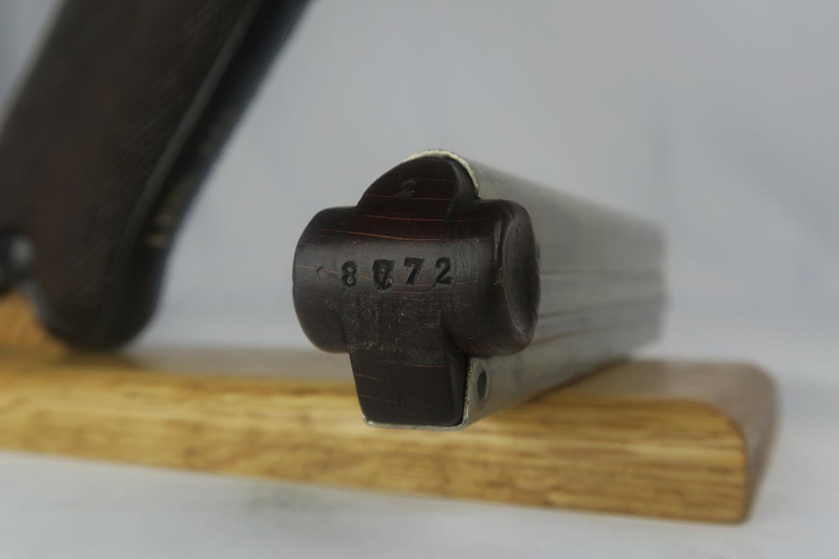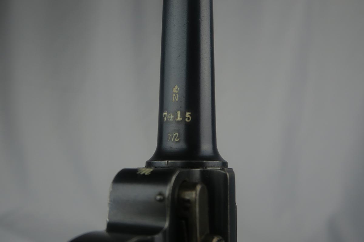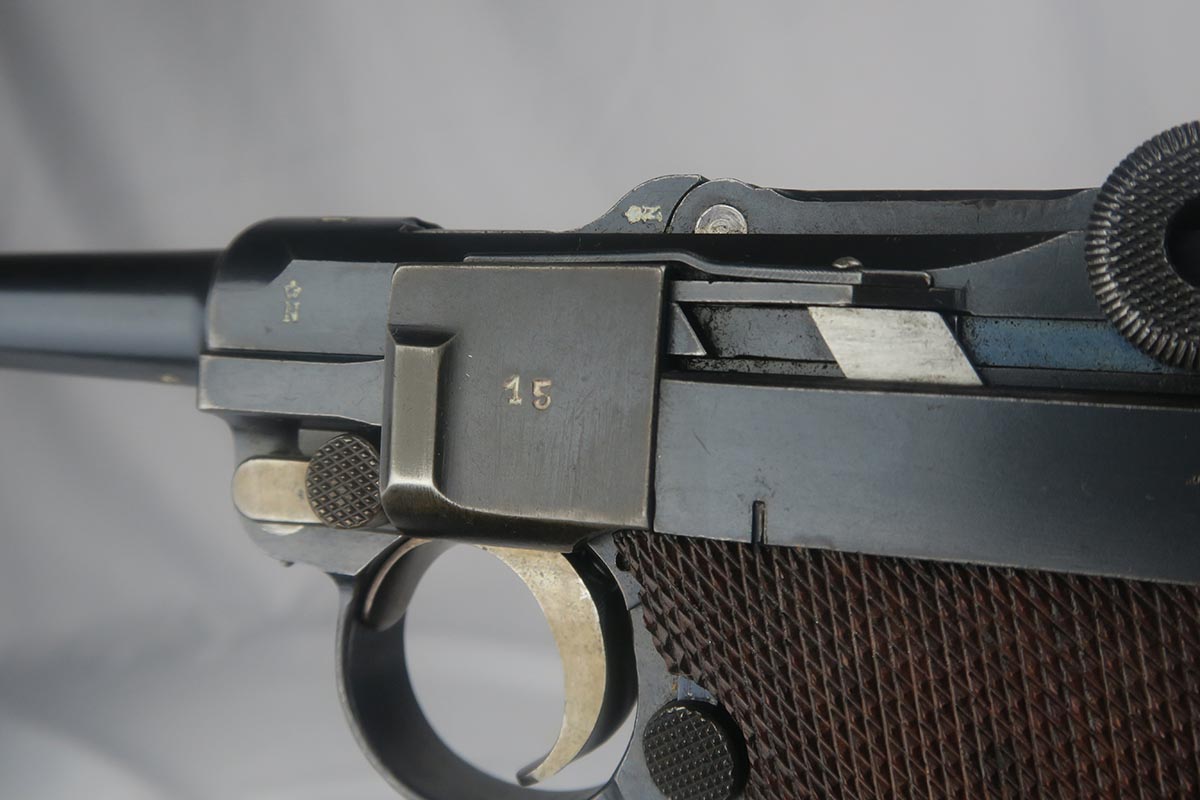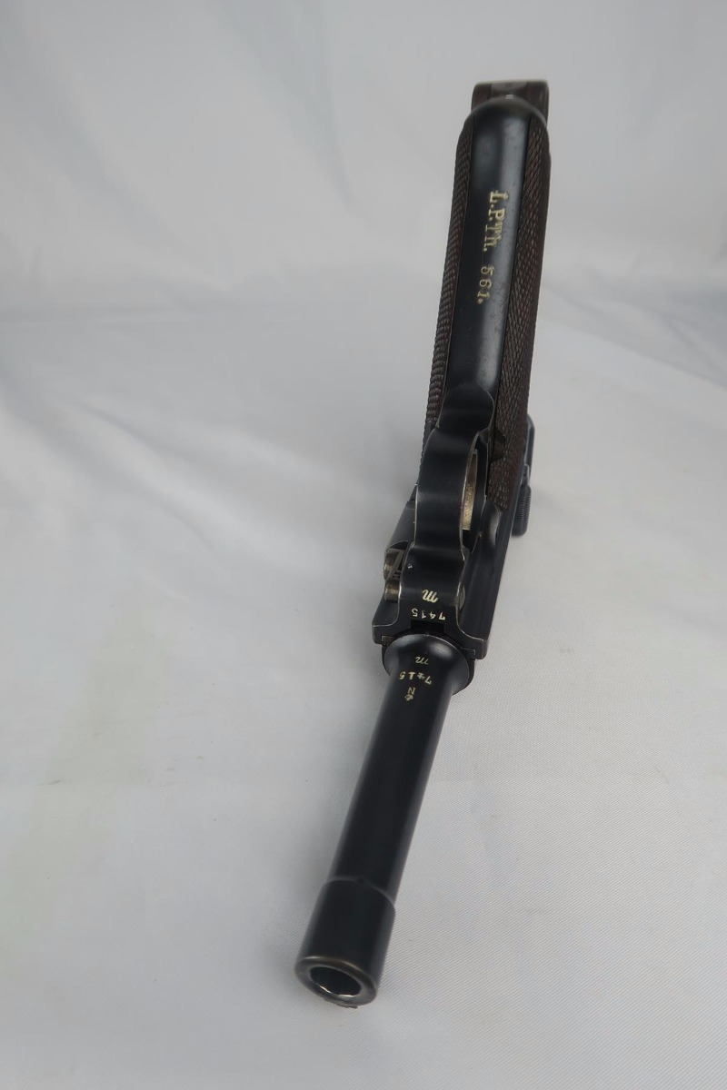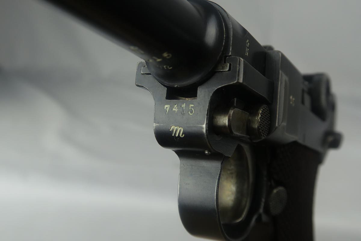 9/1/17 – Not too many lugers were ordered for the Police in the 1920’s as they were destroying or exporting most of their lugers during this time. This luger comes in 9mm, and is all matching and original except for a non-matching police magazine. The original finish is about 94-95% with some patina showing thru the finish and a little wear on the sideplate and bottom of front strap. The straw color small parts are at about 50%. The gun has commercial Crown/N proofs and also police characteristics. Most notably there is a police unit marking on the front strap – L.P Th. 561. We will let a more knowledgeable collector tell us the meaning of the marking and add that information when we get it. The gun also has the added police sear safety and intact magazine safety that was used in the 1920 era. The grips are excellent and numbered to the gun. The bore is also shiny and excellent. This is an excellent example of a “between the wars” Police luger.