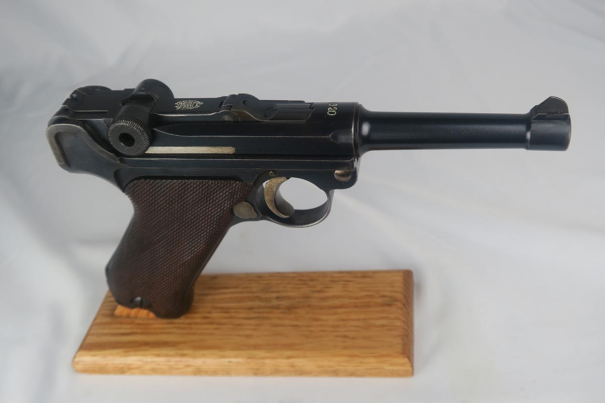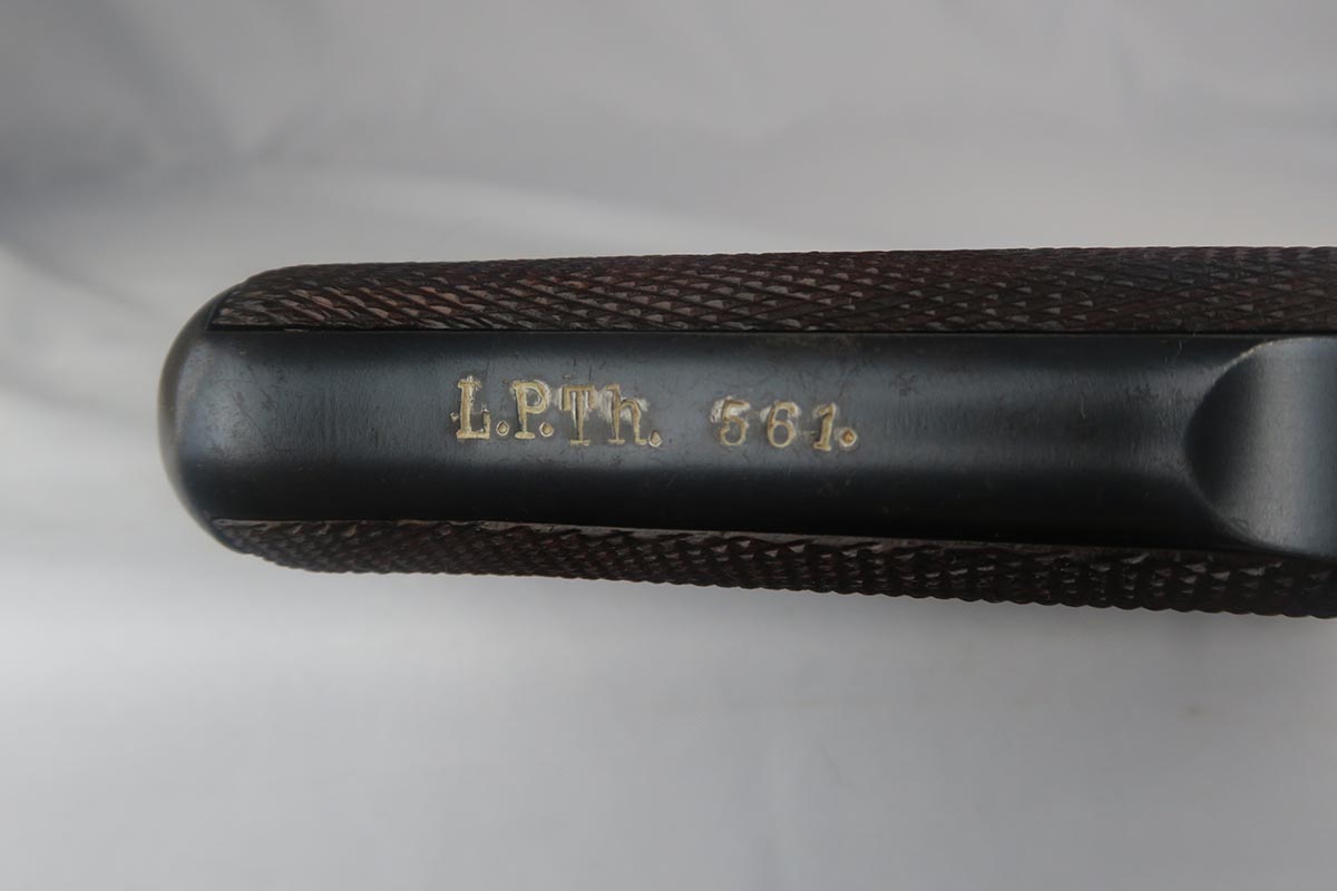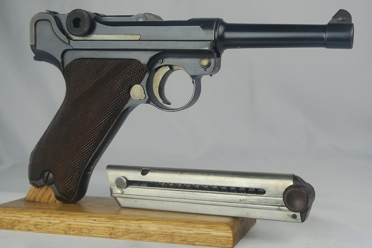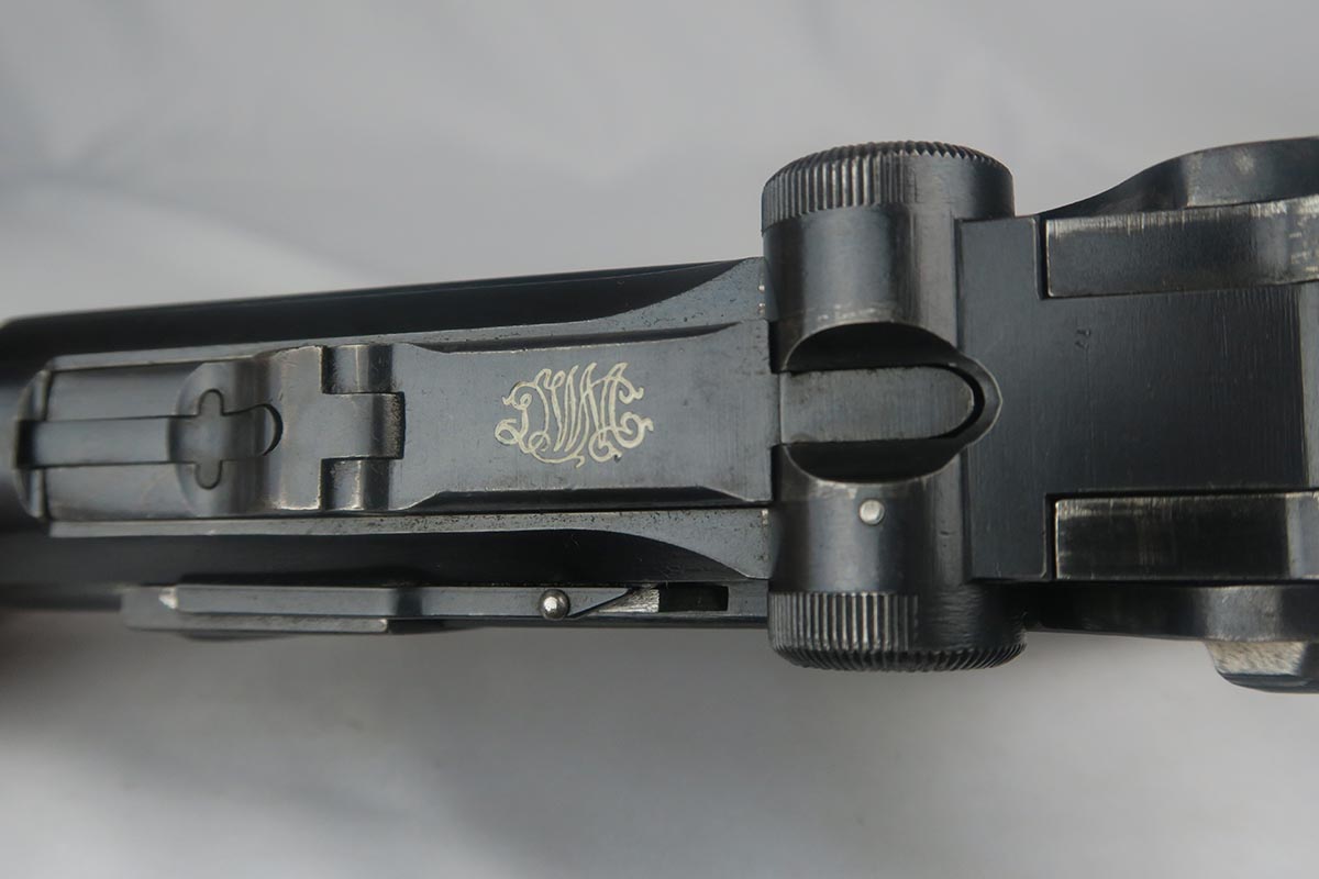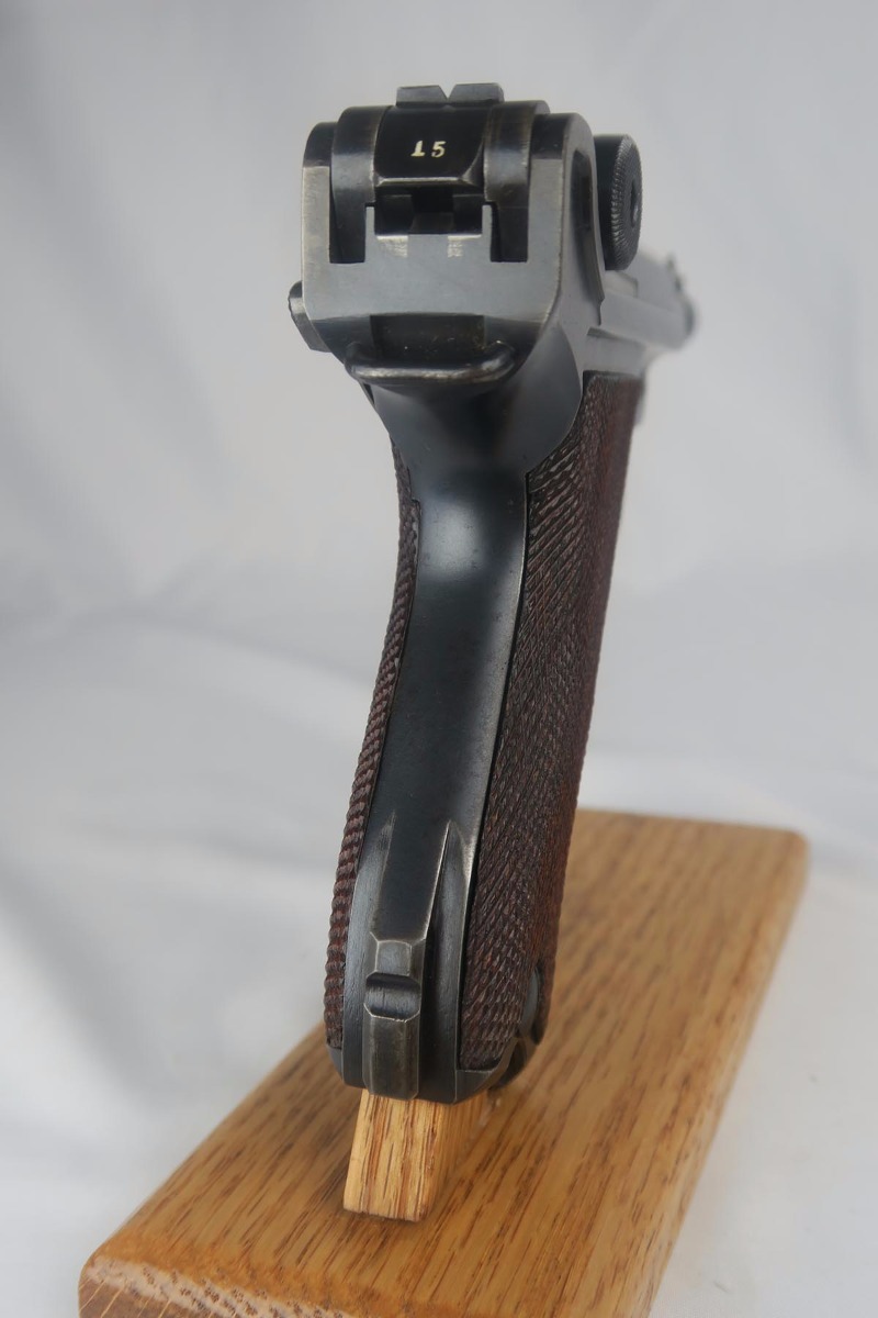 9/1/17 – Not too many lugers were ordered for the Police in the 1920’s as they were destroying or exporting most of their lugers during this time. This luger comes in 9mm, and is all matching and original except for a non-matching police magazine. The original finish is about 94-95% with some patina showing thru the finish and a little wear on the sideplate and bottom of front strap. The straw color small parts are at about 50%. The gun has commercial Crown/N proofs and also police characteristics. Most notably there is a police unit marking on the front strap – L.P Th. 561. We will let a more knowledgeable collector tell us the meaning of the marking and add that information when we get it. The gun also has the added police sear safety and intact magazine safety that was used in the 1920 era. The grips are excellent and numbered to the gun. The bore is also shiny and excellent. This is an excellent example of a “between the wars” Police luger.