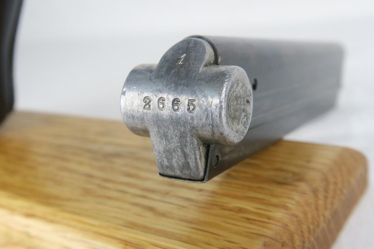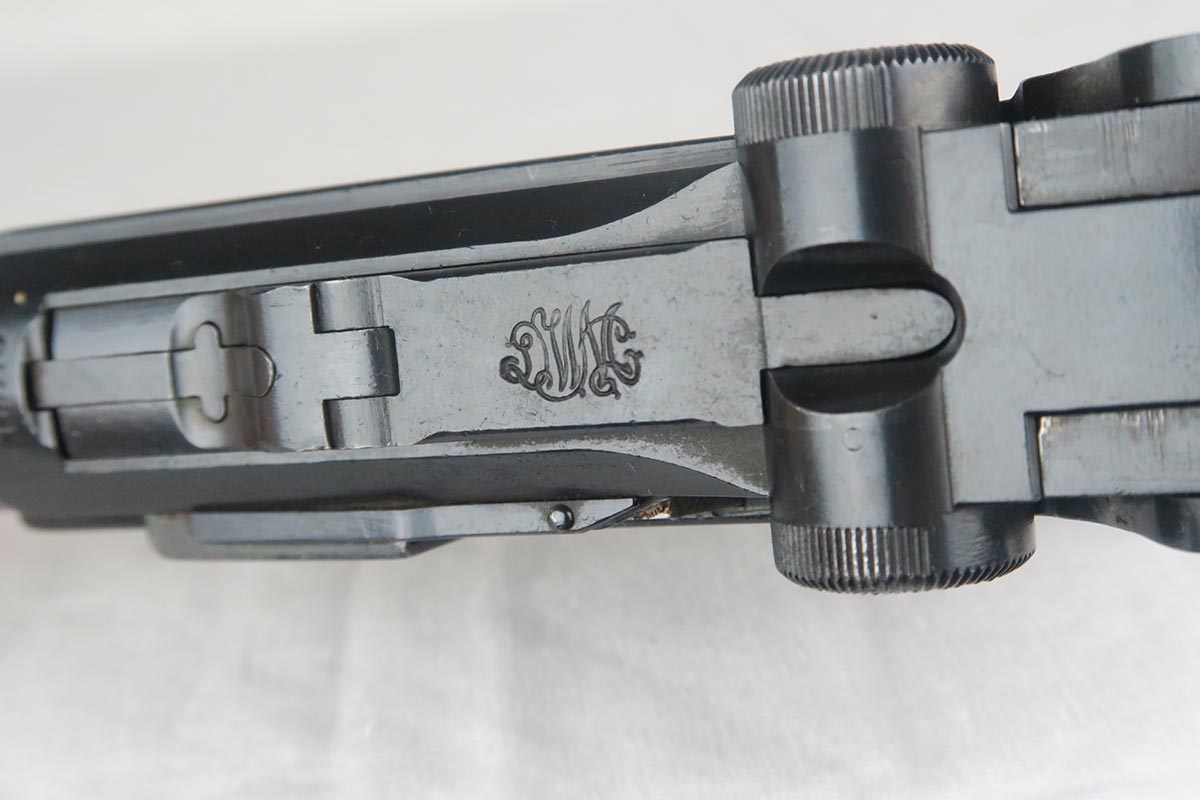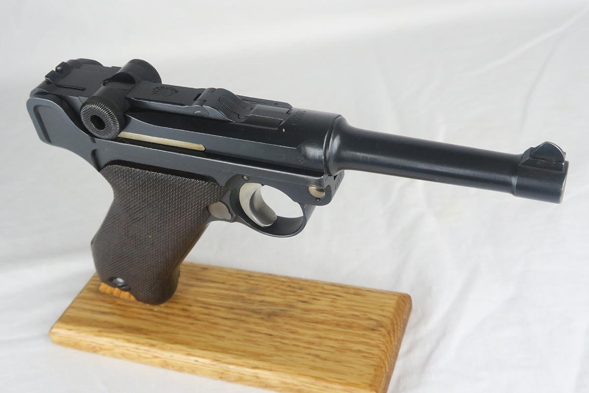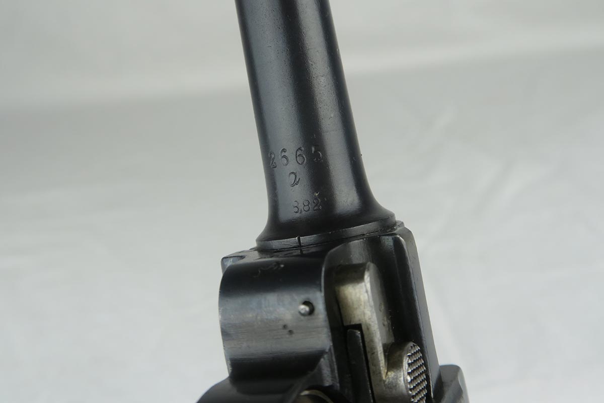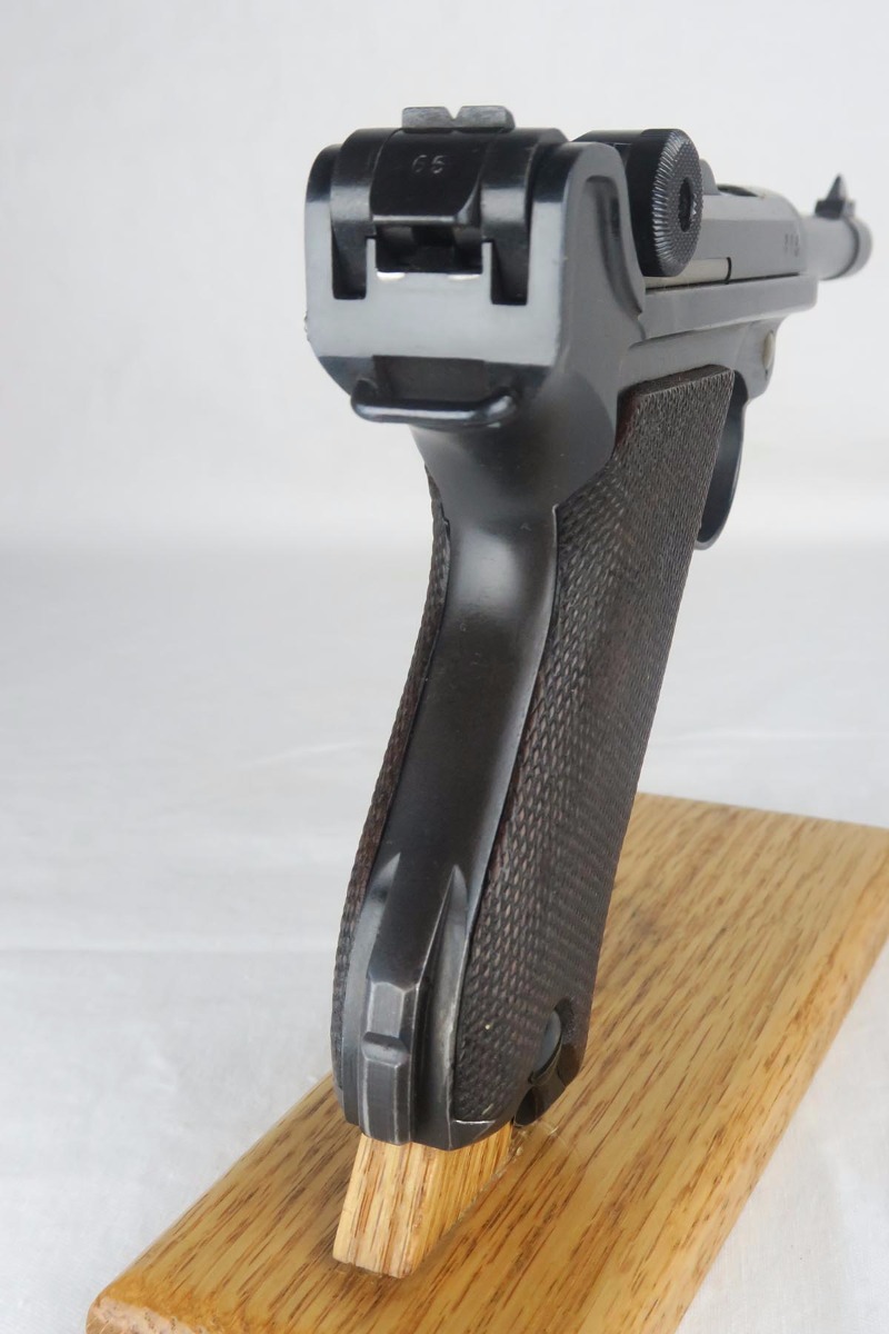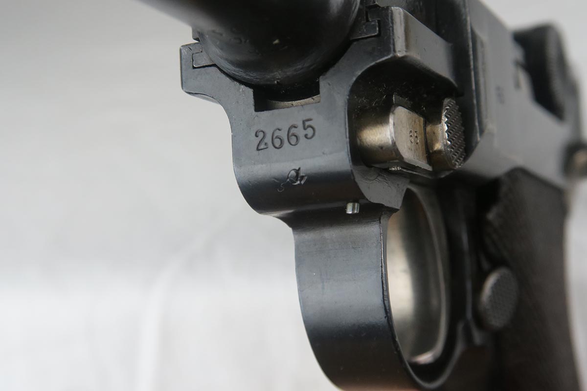 11/29/17 – This is a 1920 DWM luger that was issued to the German police.  It comes with the matching police magazine and original matching grips, though the left panel has a chip under the safety lever.  The bluing rates at about 95-96% with most finish loss on the high edges.  Police sear safety is intact above the sideplate.  Excellent bore.