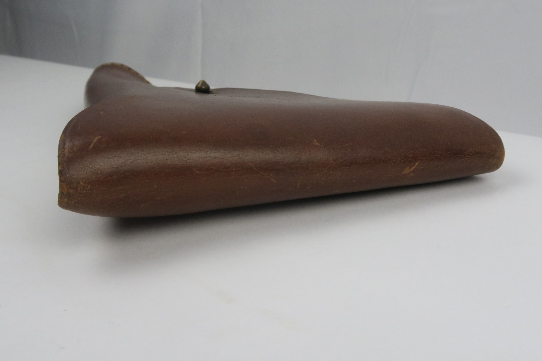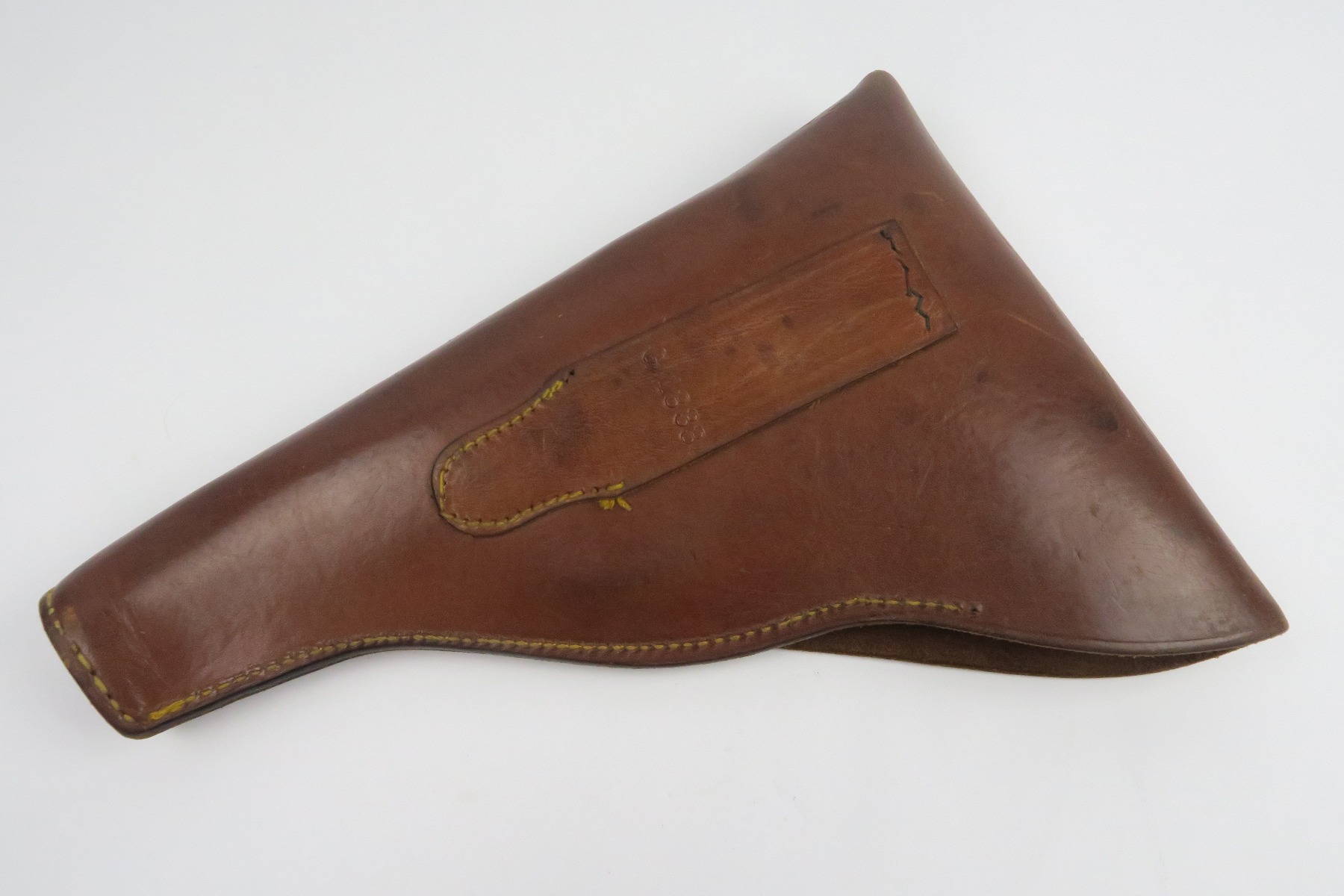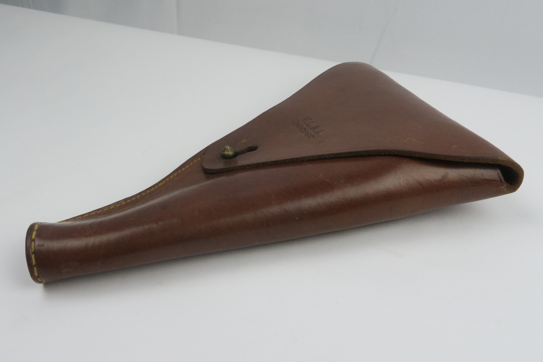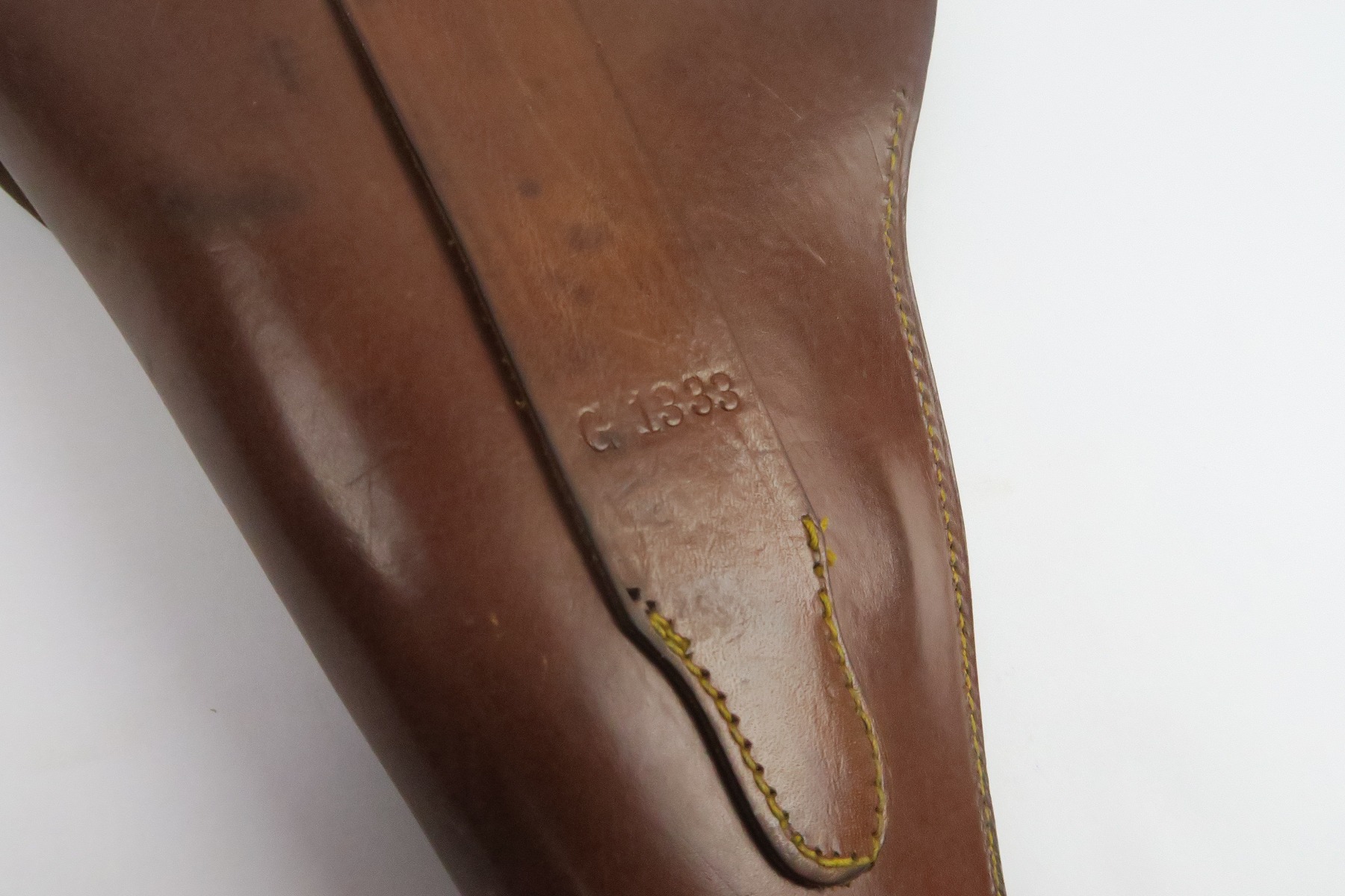 12/19/17 – This is a 1920s US production Luger holster. The holster was made in Chicago and fits a Luger – made during a time where there were a few Lugers for commercial sale in the United States, as well as some that were brought back from WW1. The holster is maker stamped on the front leather, and has number “G 1333” on the back belt loop. The top of the belt loop has some replacement stitching but the rest of the holster has all original stitching in excellent condition. The leather is also excellent and clean overall. Guaranteed original and authentic.