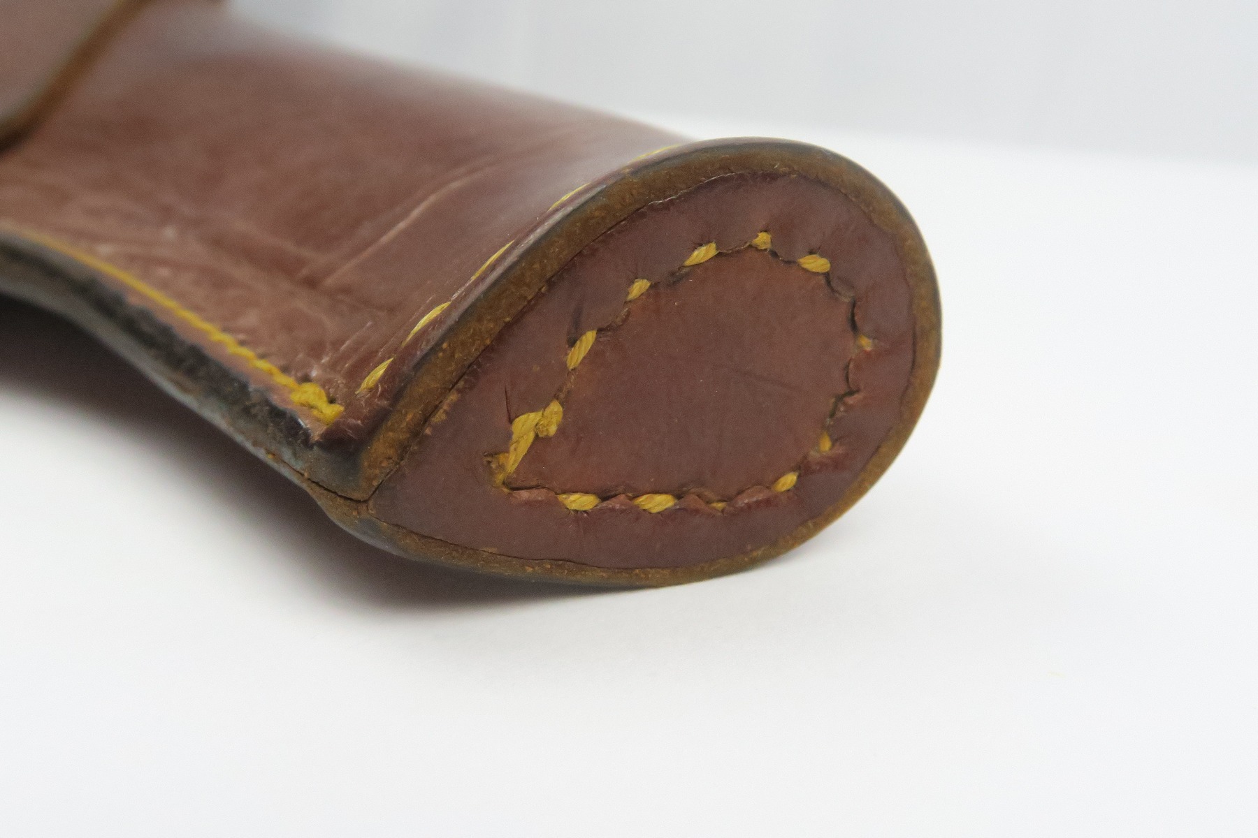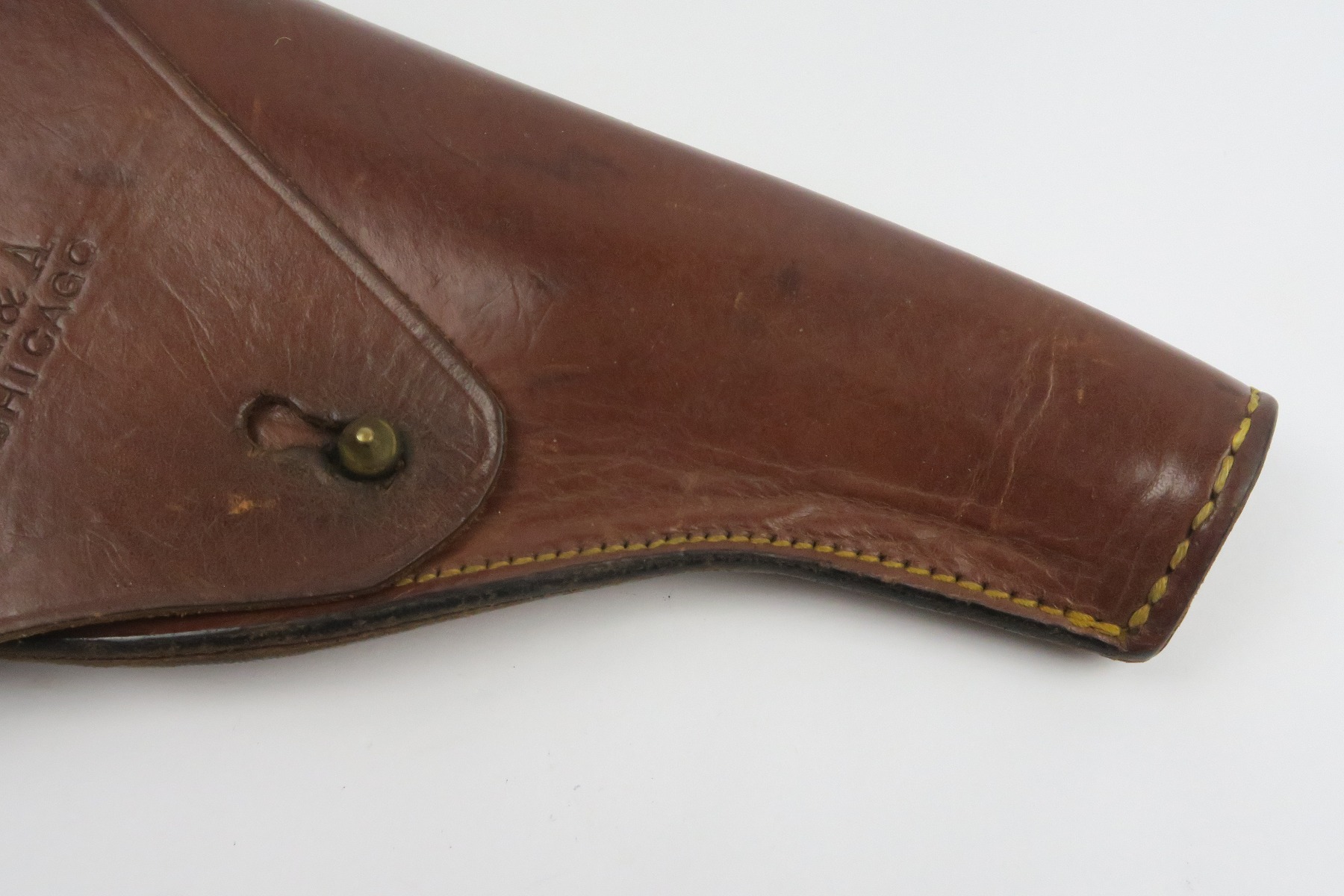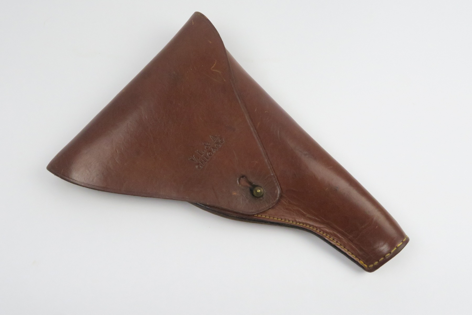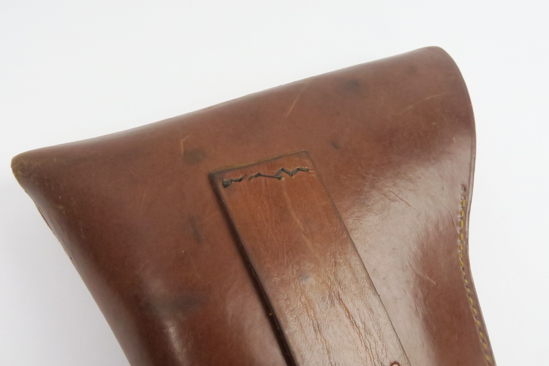 12/19/17 – This is a 1920s US production Luger holster. The holster was made in Chicago and fits a Luger – made during a time where there were a few Lugers for commercial sale in the United States, as well as some that were brought back from WW1. The holster is maker stamped on the front leather, and has number “G 1333” on the back belt loop. The top of the belt loop has some replacement stitching but the rest of the holster has all original stitching in excellent condition. The leather is also excellent and clean overall. Guaranteed original and authentic.