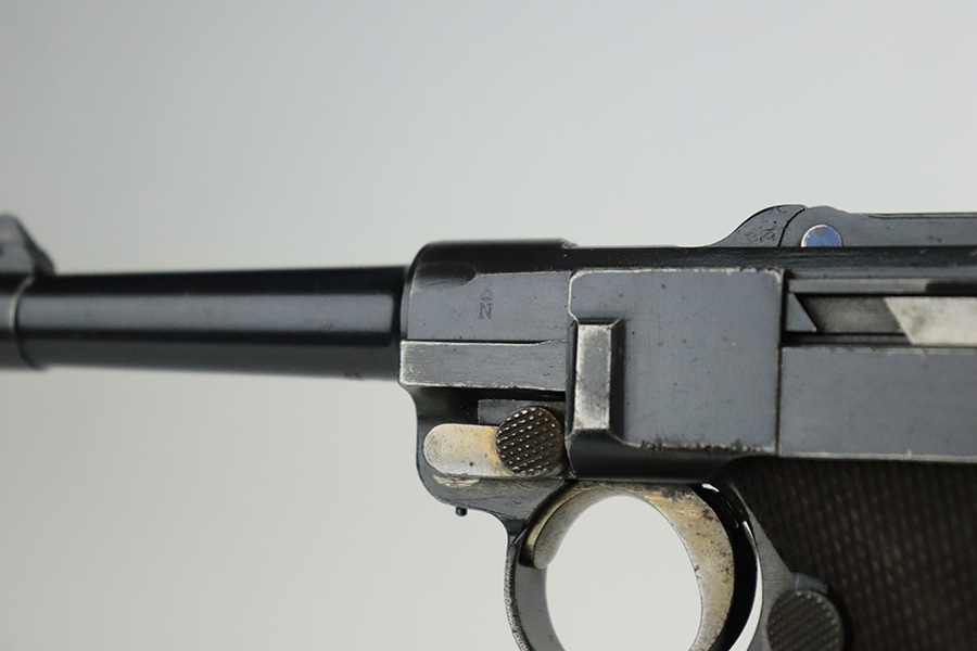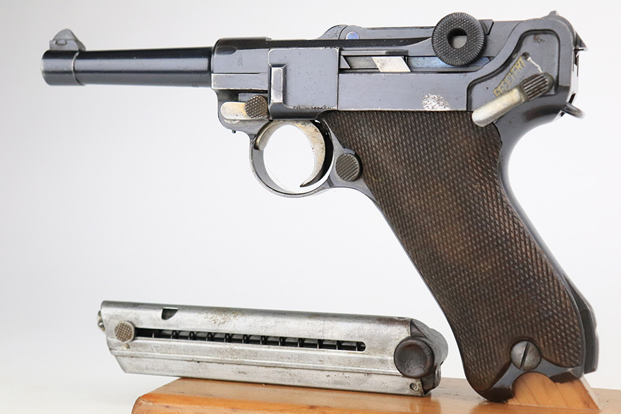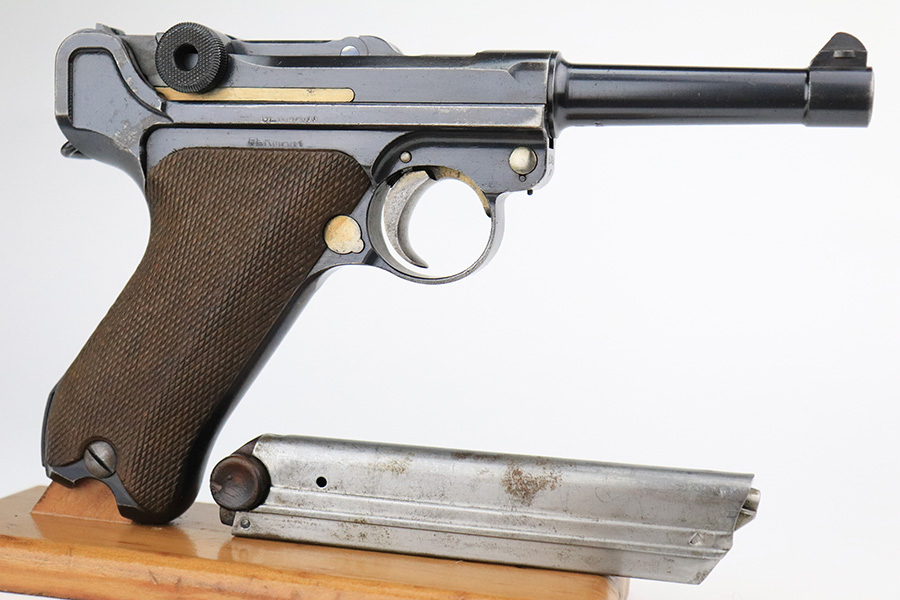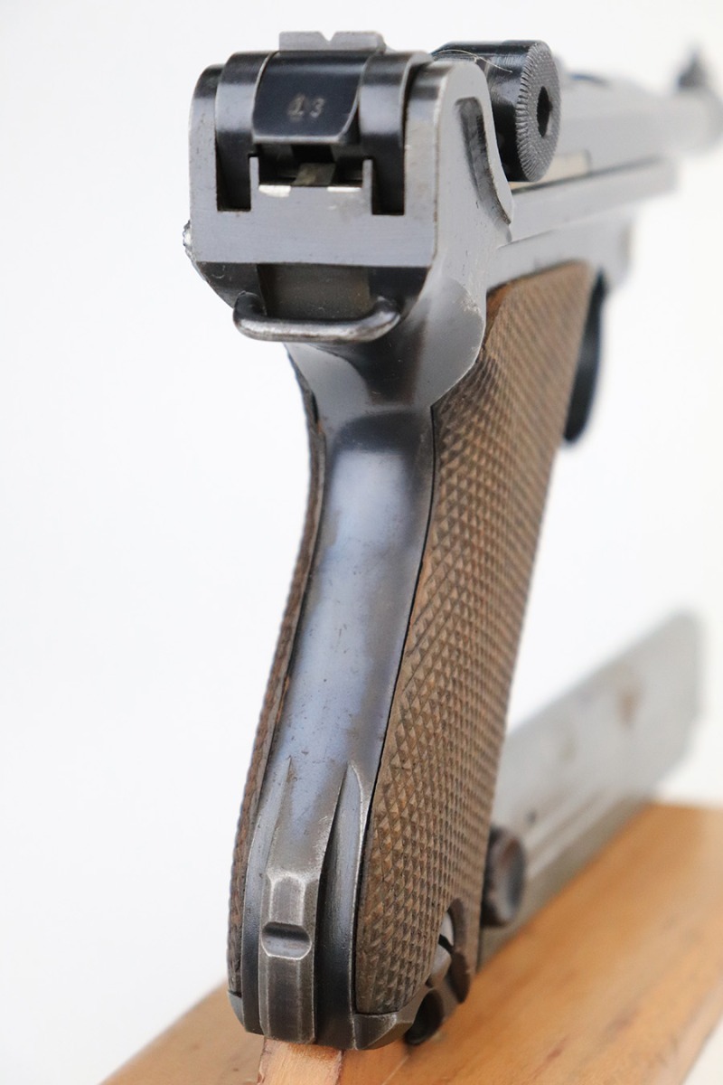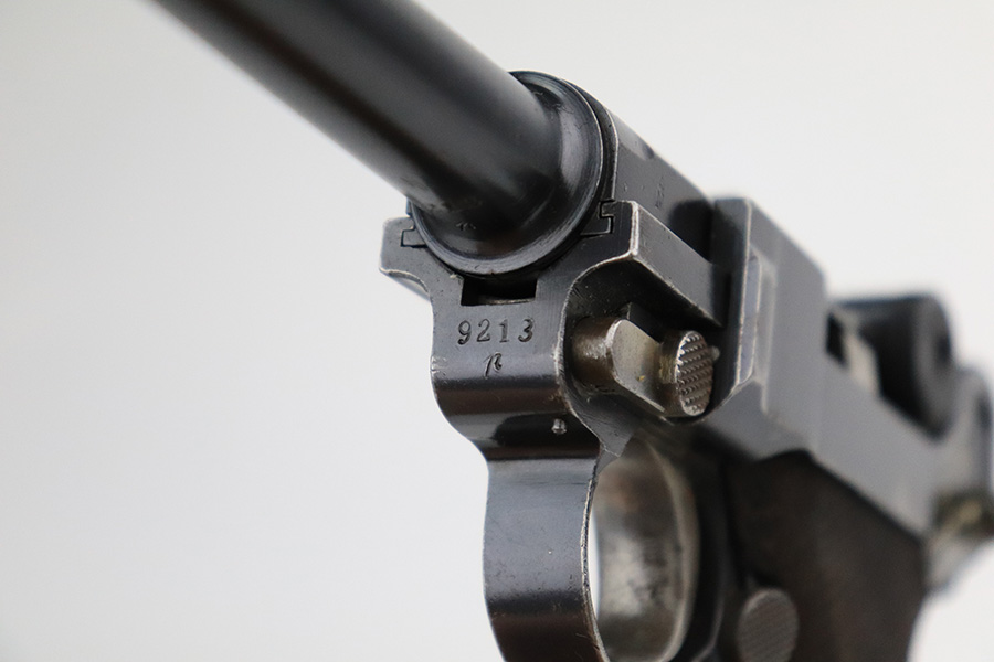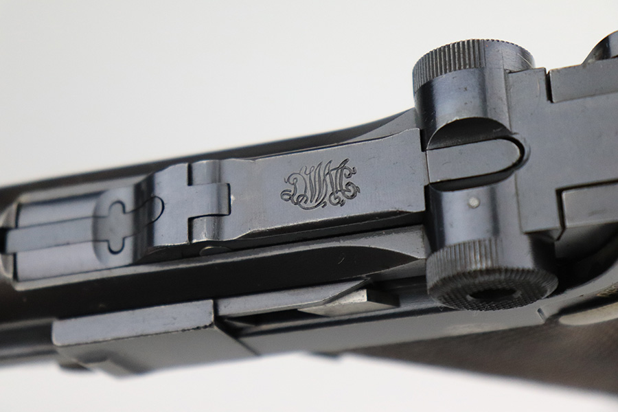 8/1/22 – This is a very nice example of a DWM Luger in .30 Luger that was sold in the commercial market in the 1920’s. It is all matching and has the proper “Crown N” commercial proofs. The majority of the finish loss comes in the form of scratchy wear on both grip straps. Minor wear on the side plate, side rails, and around the muzzle. A spot of wear and minor pitting on the left side of the frame. A couple of a small spots of discoloration on the right side of the frame. “Germany” export markings on the right side of the frame. It comes with excellent un-numbered wood grips and an un-numbered magazine (chip in the bottom). Excellent bore with great rifling.
