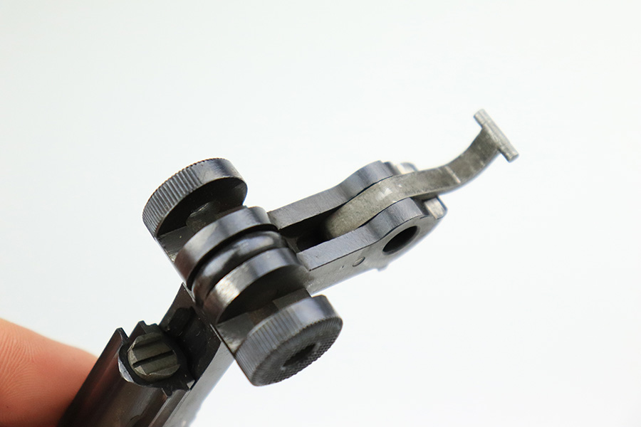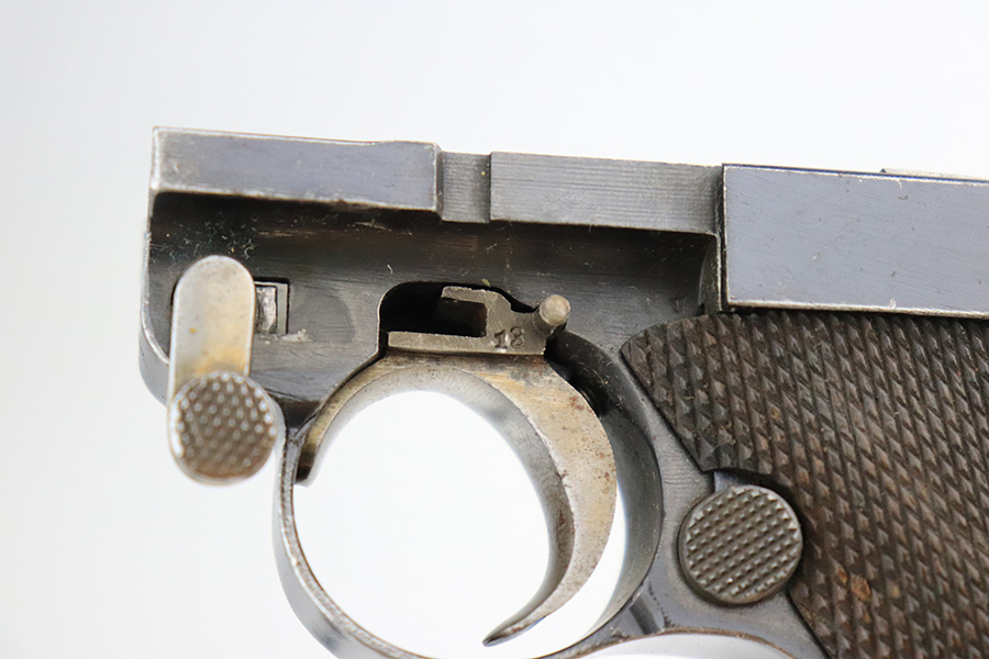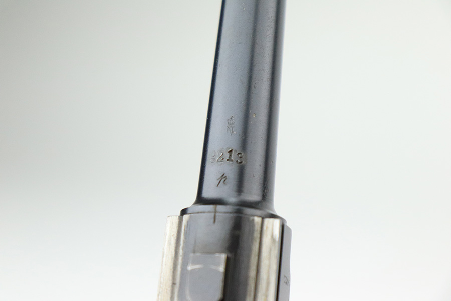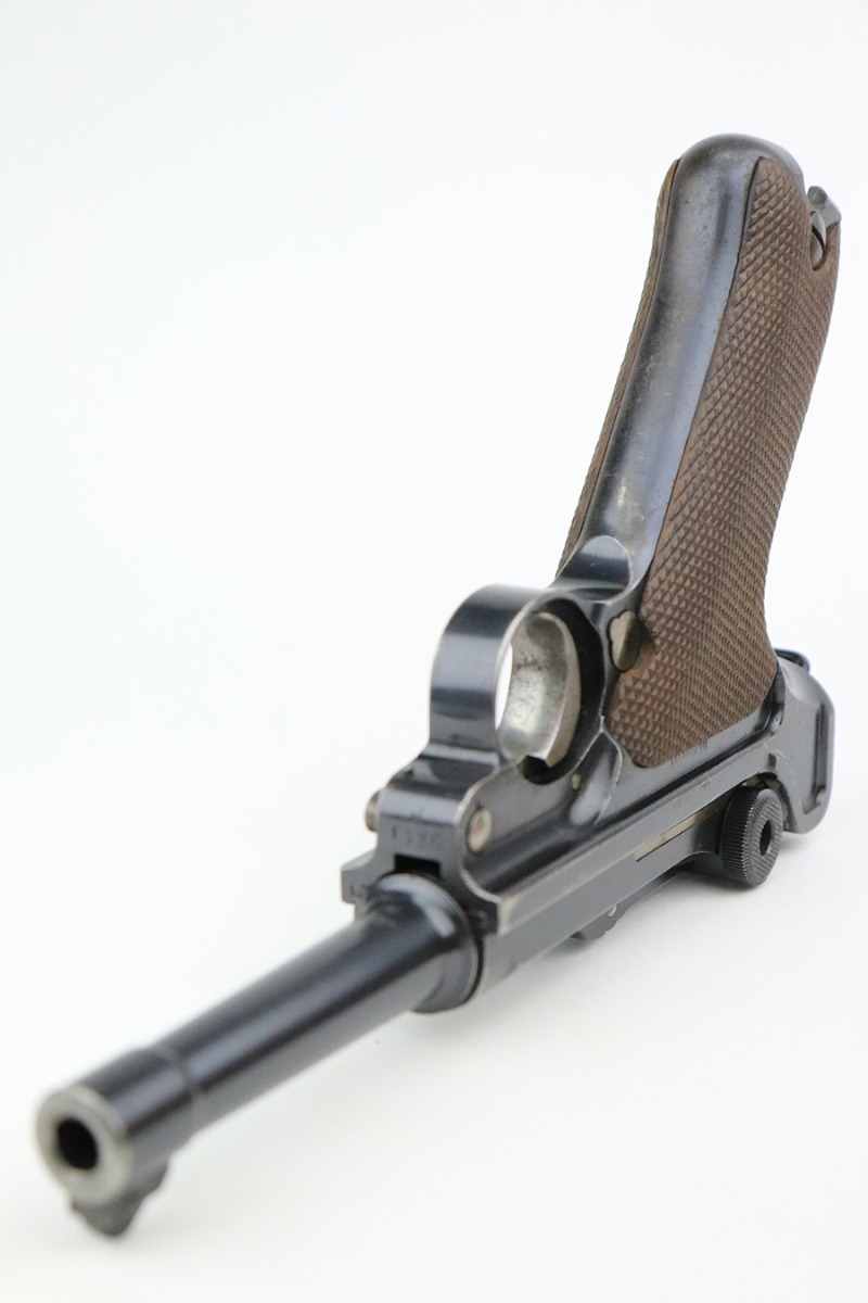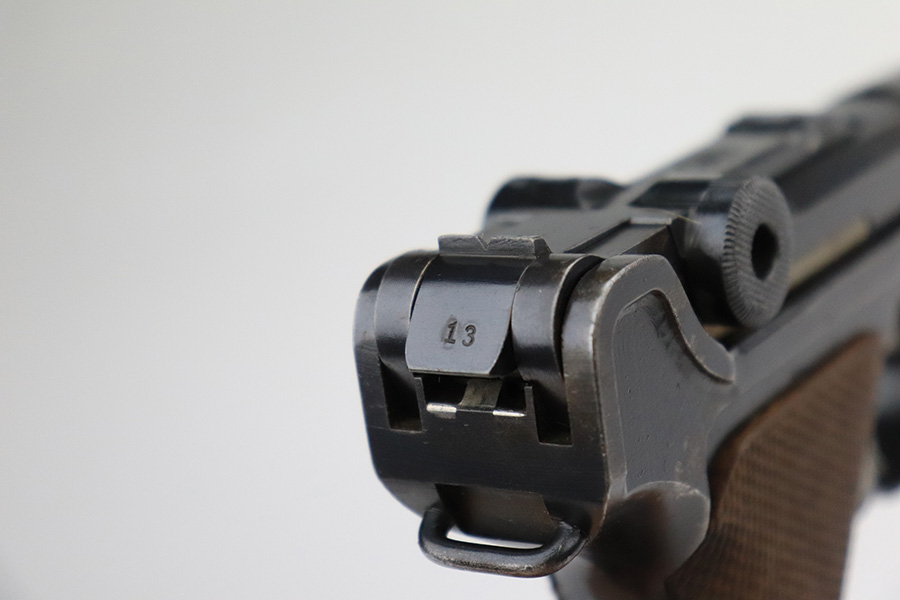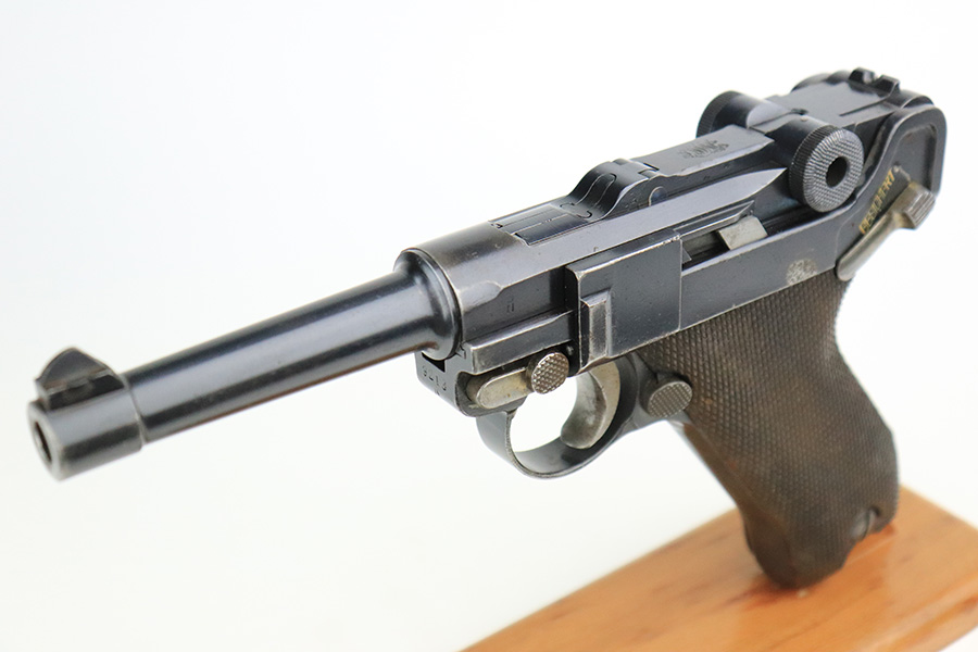 8/1/22 – This is a very nice example of a DWM Luger in .30 Luger that was sold in the commercial market in the 1920’s. It is all matching and has the proper “Crown N” commercial proofs. The majority of the finish loss comes in the form of scratchy wear on both grip straps. Minor wear on the side plate, side rails, and around the muzzle. A spot of wear and minor pitting on the left side of the frame. A couple of a small spots of discoloration on the right side of the frame. “Germany” export markings on the right side of the frame. It comes with excellent un-numbered wood grips and an un-numbered magazine (chip in the bottom). Excellent bore with great rifling.