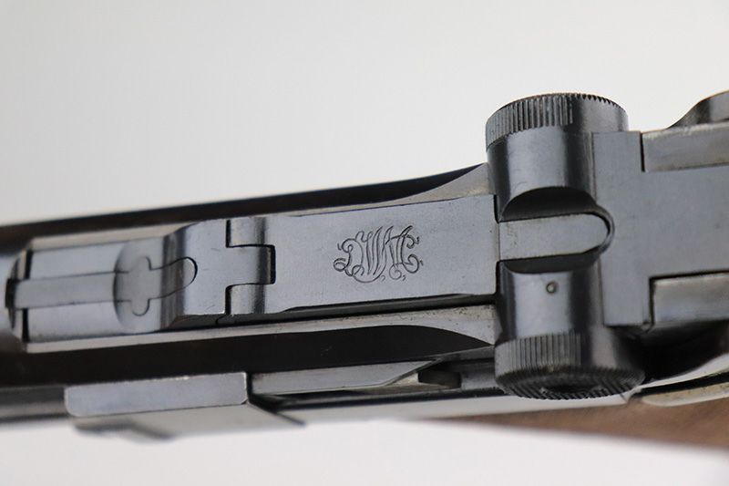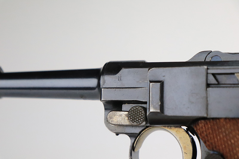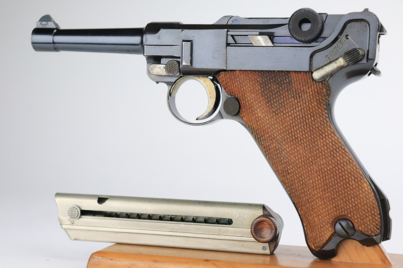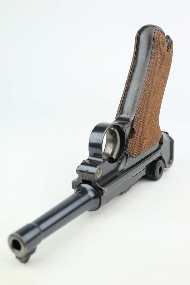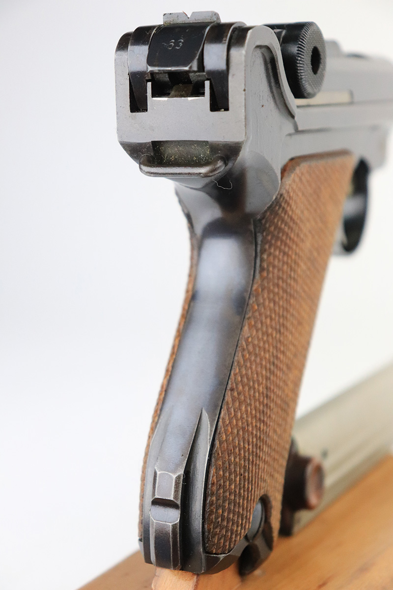 9/14/22 – This is a very nice example of a DWM Luger sold in the commercial market in the 1920’s. Chambered in .30 Luger. It is all matching, has no chamber date, and has the proper “Crown N” commercial proofs. “Germany” export proof on the frame, indicating it was intended for the international commercial market. It has retained about 93-94% of its original finish. Almost all of the finish loss is on the front strap (where the wear is spotty), so the profile views are minty. There is also some light spotty wear on the back strap and some very minor wear on some of the high edges. Comes with minty wood grips and an un-numbered wood-bottom magazine. Stone-mint bore.