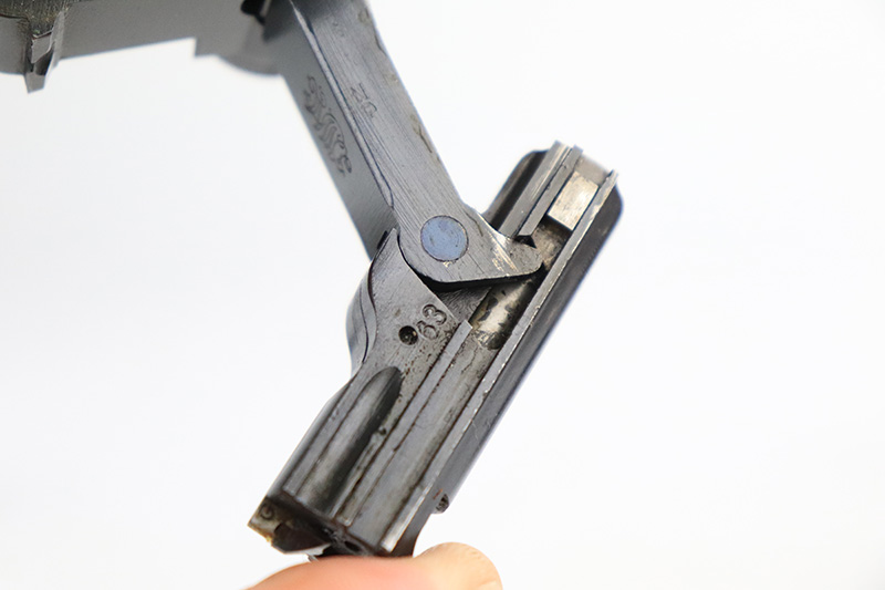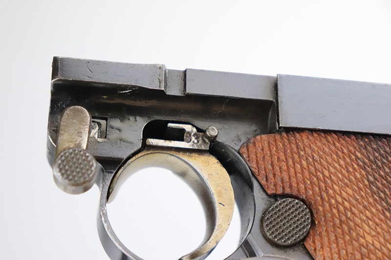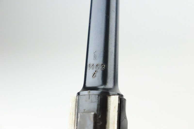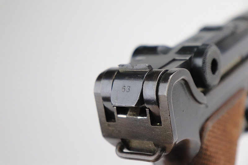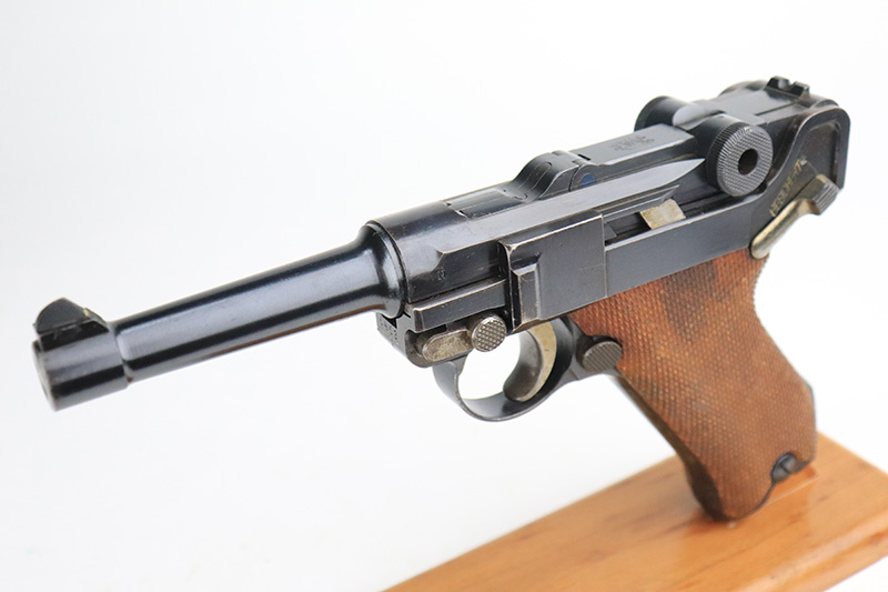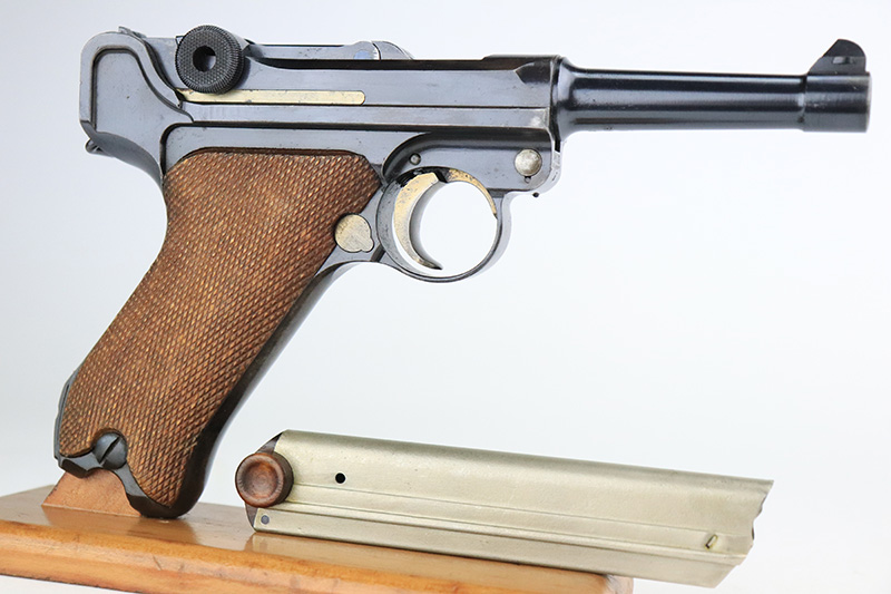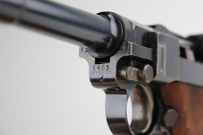 9/14/22 – This is a very nice example of a DWM Luger sold in the commercial market in the 1920’s. Chambered in .30 Luger. It is all matching, has no chamber date, and has the proper “Crown N” commercial proofs. “Germany” export proof on the frame, indicating it was intended for the international commercial market. It has retained about 93-94% of its original finish. Almost all of the finish loss is on the front strap (where the wear is spotty), so the profile views are minty. There is also some light spotty wear on the back strap and some very minor wear on some of the high edges. Comes with minty wood grips and an un-numbered wood-bottom magazine. Stone-mint bore.