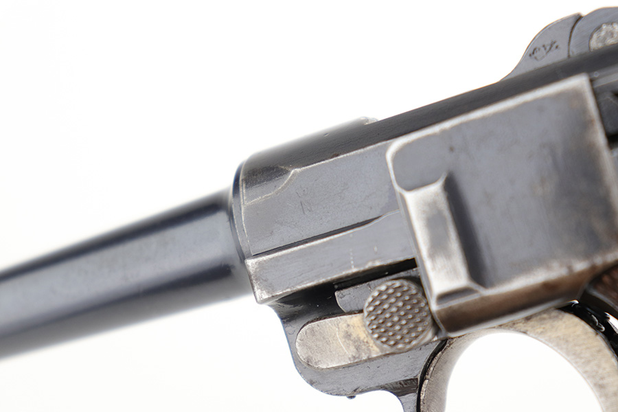 2/28/23 – This is a very nice example of a DWM Luger sold in the commercial market in the 1920’s and chambered in .30 Luger. It is all matching and has the proper “Crown N” commercial proofs. It has retained about 94% of its original finish. The majority of the finish loss is on the grip straps where there is some minor thinning. But there is also minor wear on the side plate and front edges of the side rails. Very minor thinning on the chamber. Very minor pin-pricking on the grip straps and some small spots of oxidation here and there. Fitted with very nice wood grips. Comes with an aluminum bottom magazine. The toggle does not lock back automatically with this magazine. Excellent bore with great rifling.